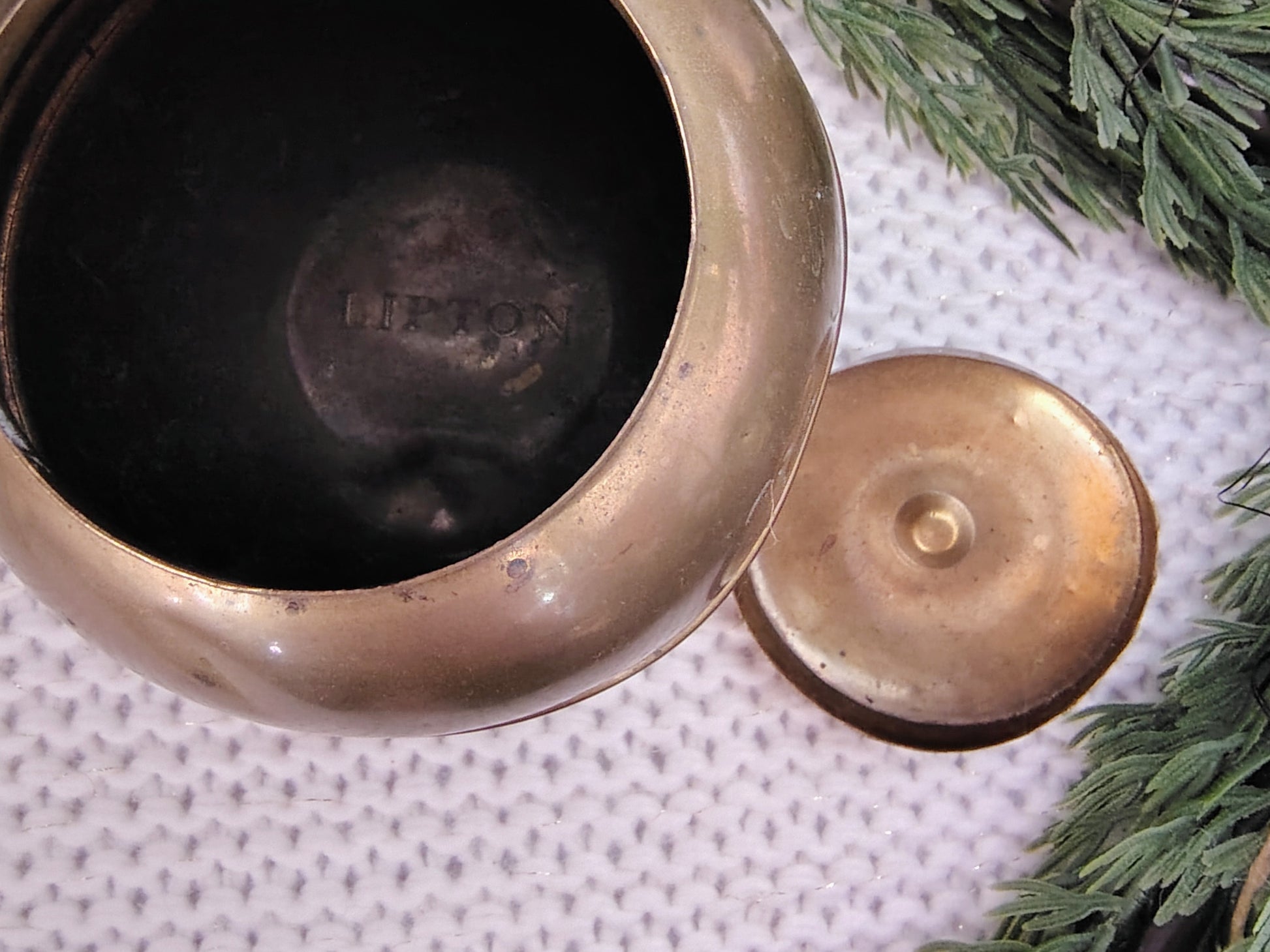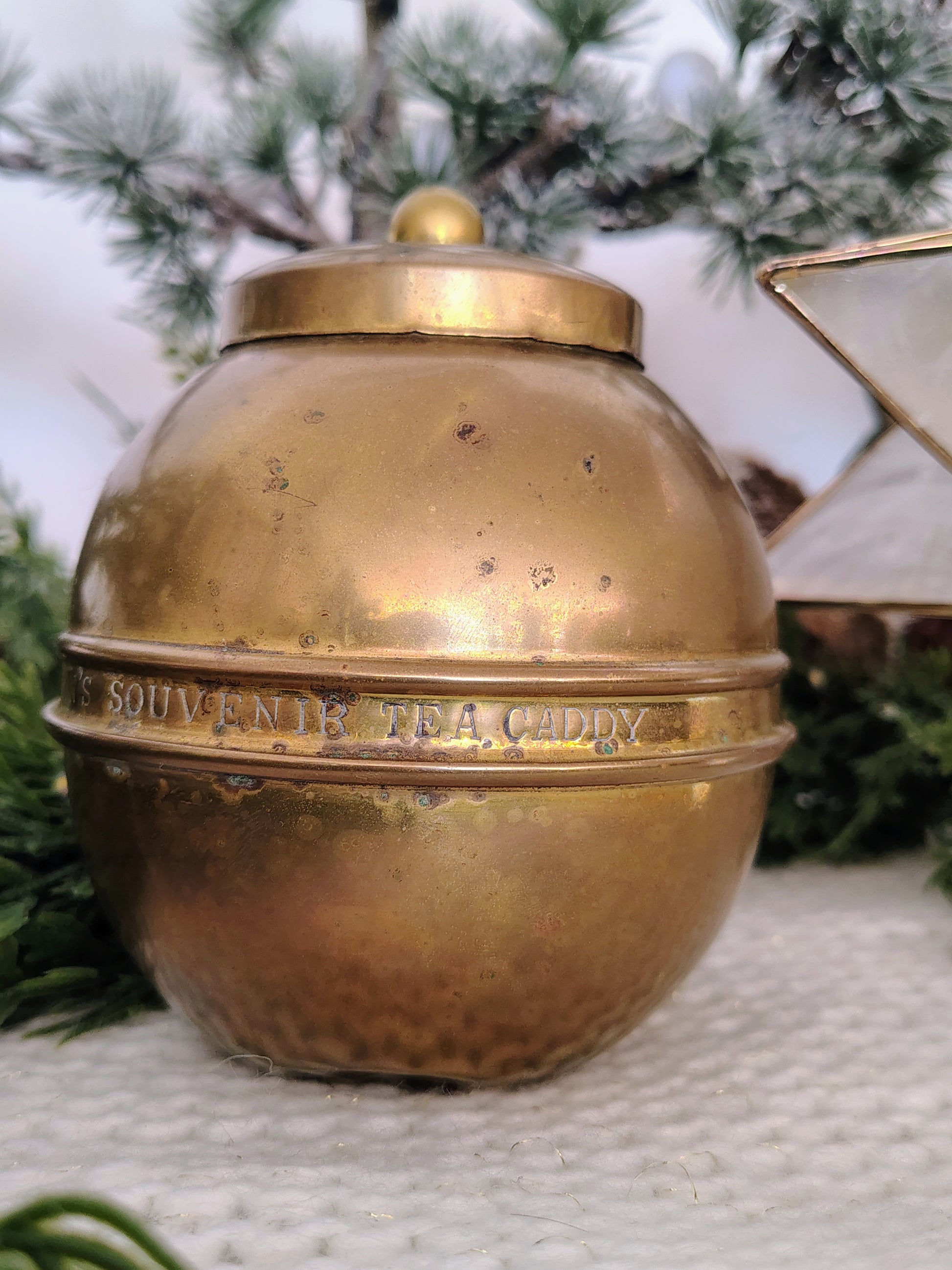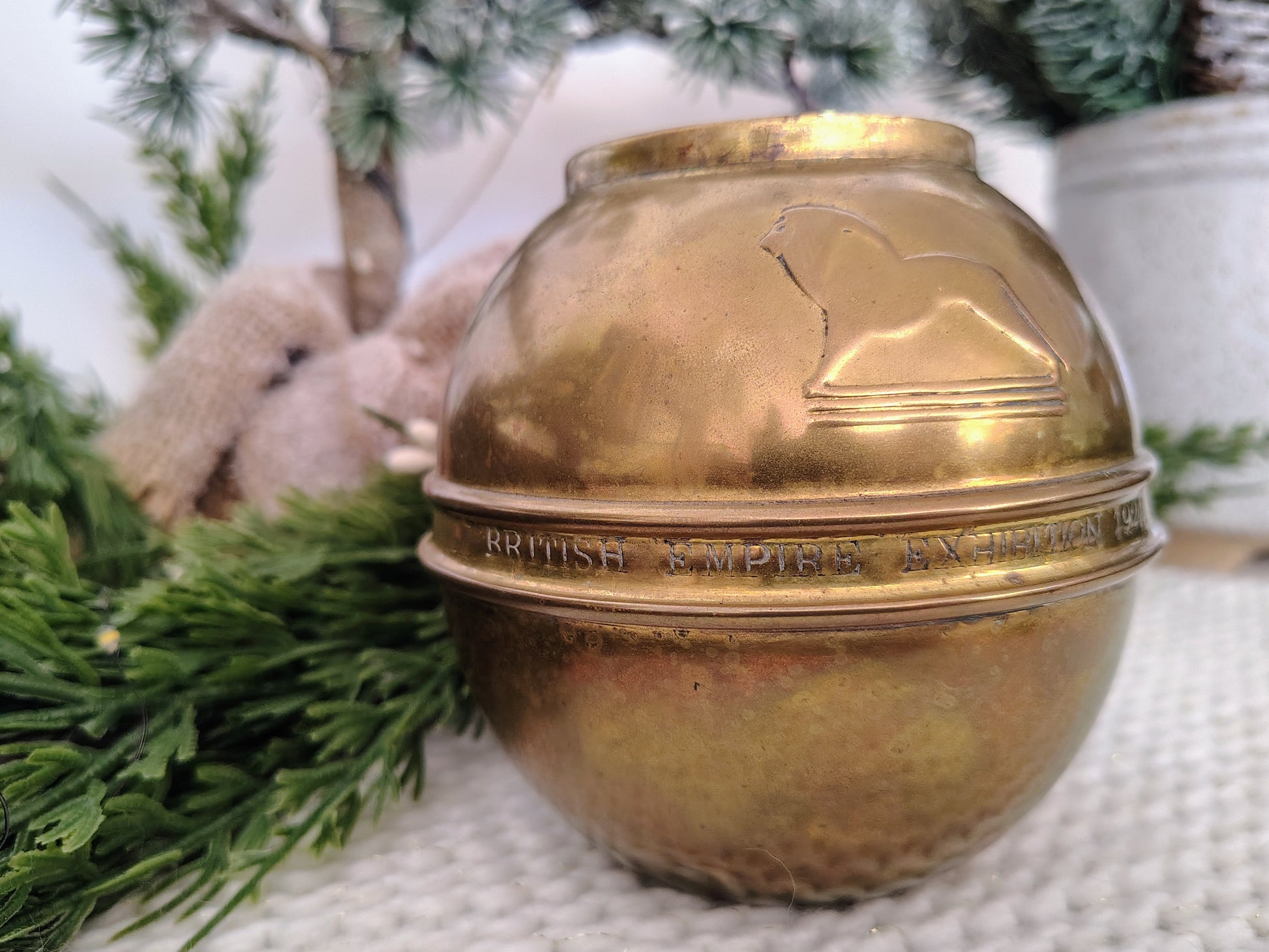 1924 Lipton Brass Tea Caddy – British Empire Exhibition Globe Tin, 5″ Tall Christmas