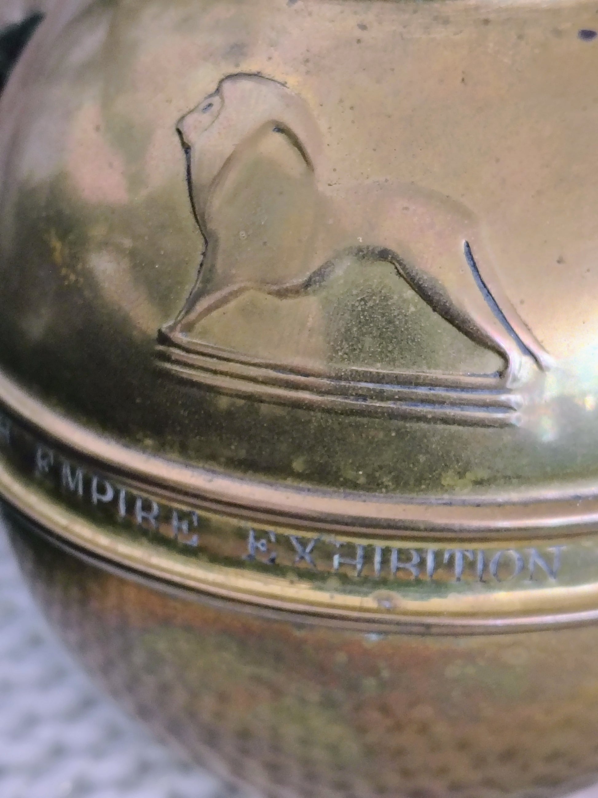 This spherical Lipton Tea brass caddy was produced as a souvenir for the British Empire Exhibition of 1924 at Wembley. Cast in two hemispheres with a domed lid, the globe-shaped tin features a relief camel-and-pyramid vignette above a raised band reading “BRITISH EMPIRE EXHIBITION.” Lipton’s stand at the exhibition celebrated tea routes through Egypt and India, and these tins once held a half-pound of loose tea sold to visitors.