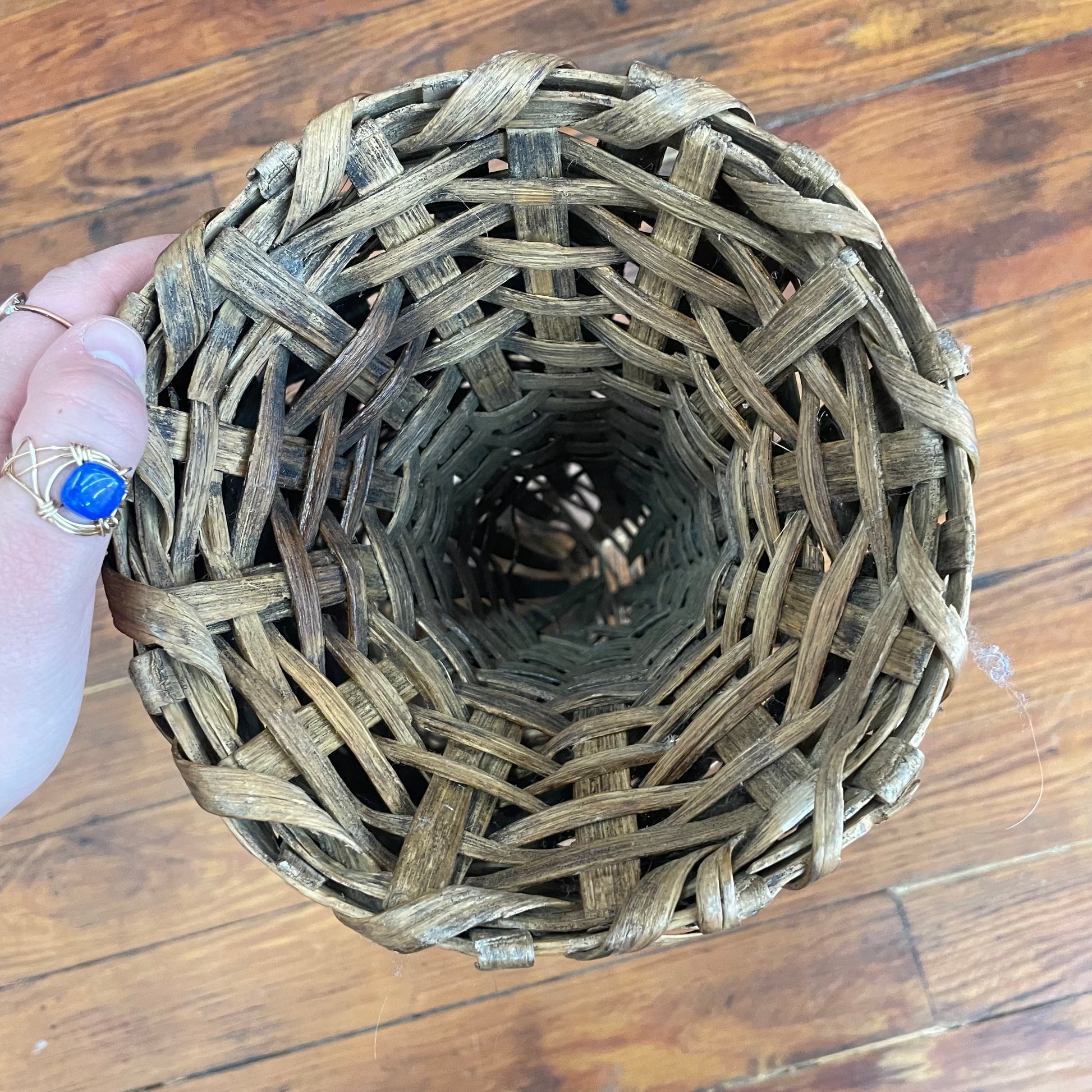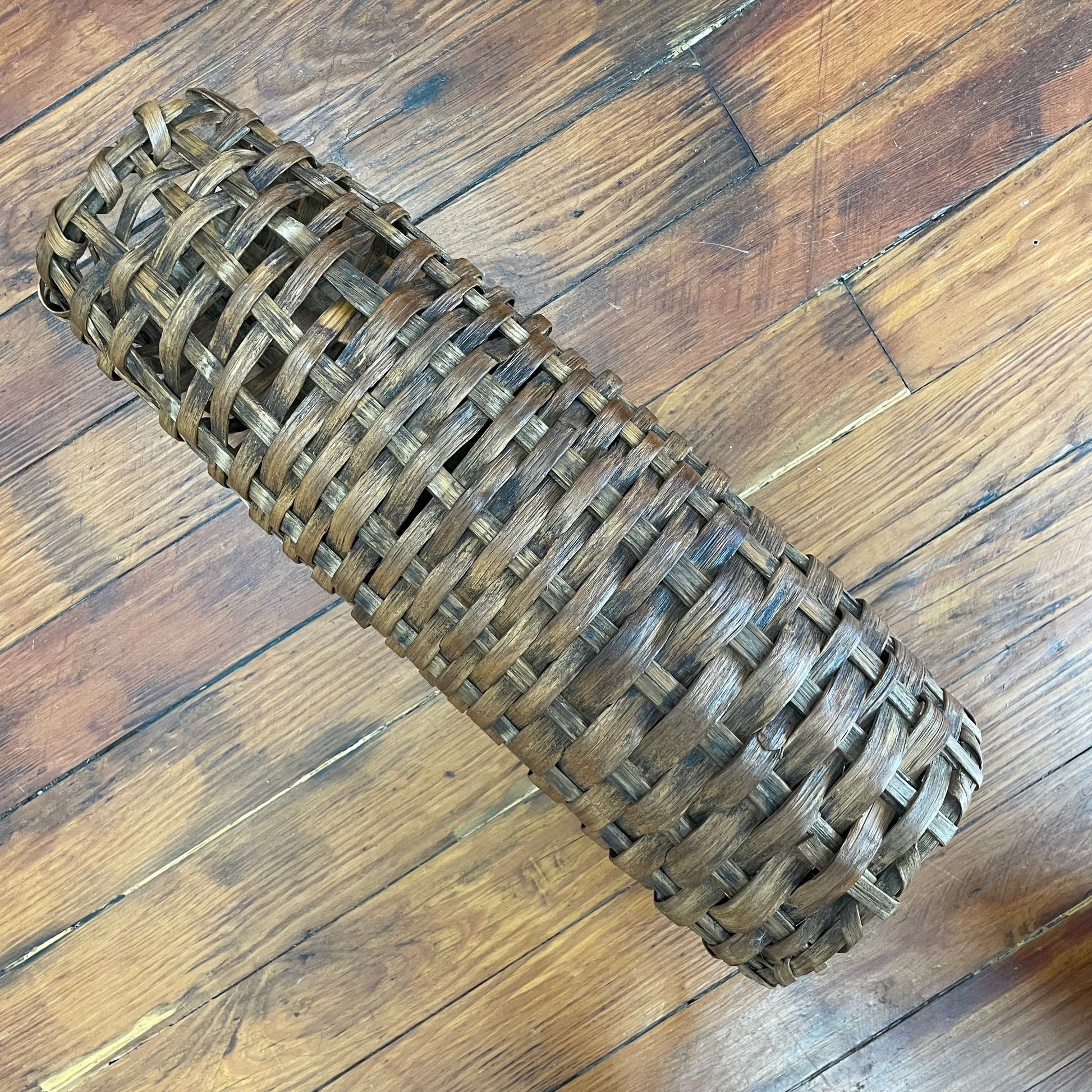 An authentic piece of Americana, this antique eel trap basket hails from the Chesapeake Bay region and dates to the early 20th century. Crafted with hand-split wood splints in a tightly woven spiral pattern, the cylindrical shape and narrow neck were designed to guide eels inward while preventing their escape—an ingenious example of traditional fishing craftsmanship. Today, it serves as a sculptural decor piece, whether styled with dried branches, displayed on its own, or mounted as wall art.