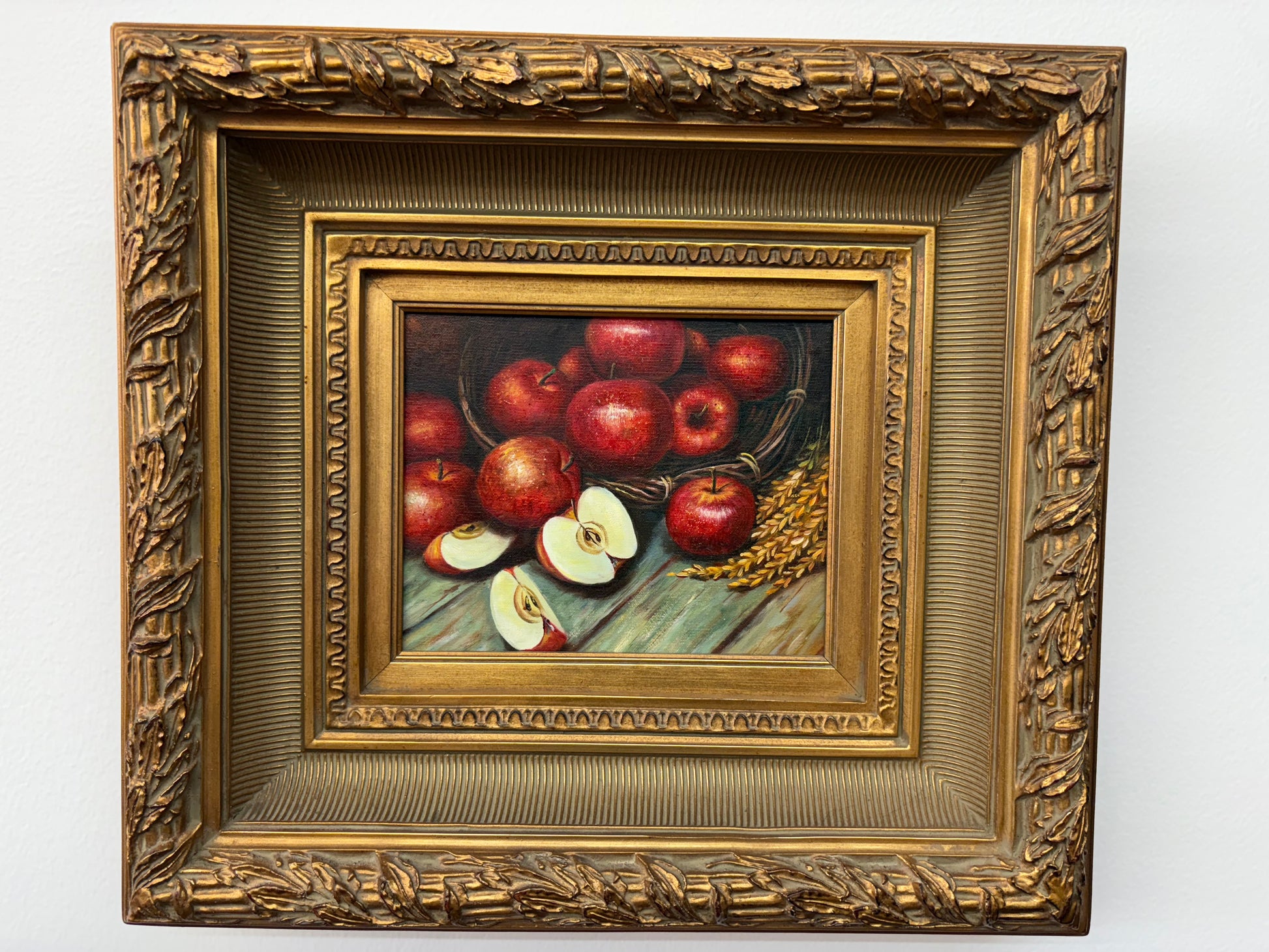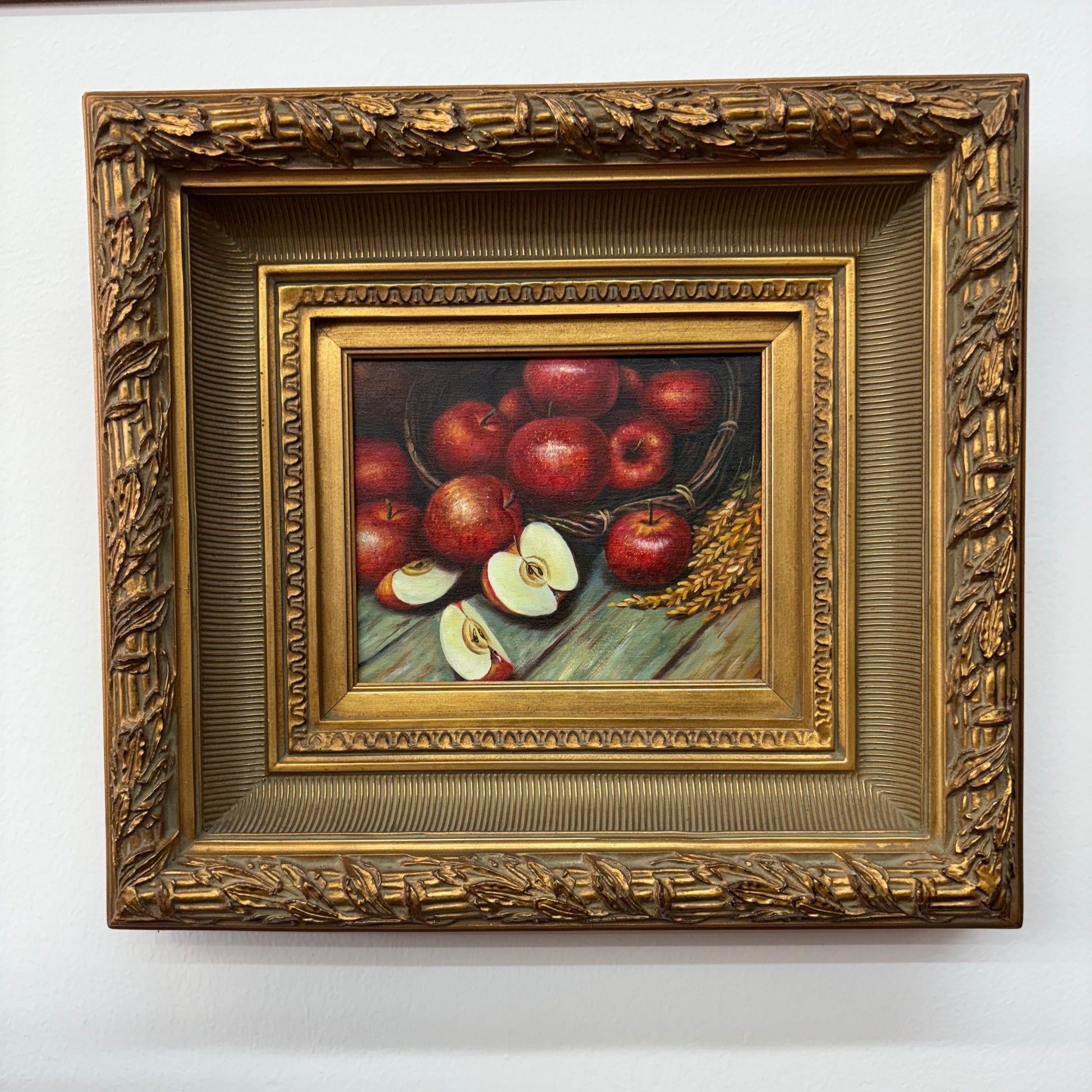 Framed Still-Life Oil – Basket of Red Apples, Ornate Gilt Frame, 20″ × 18″