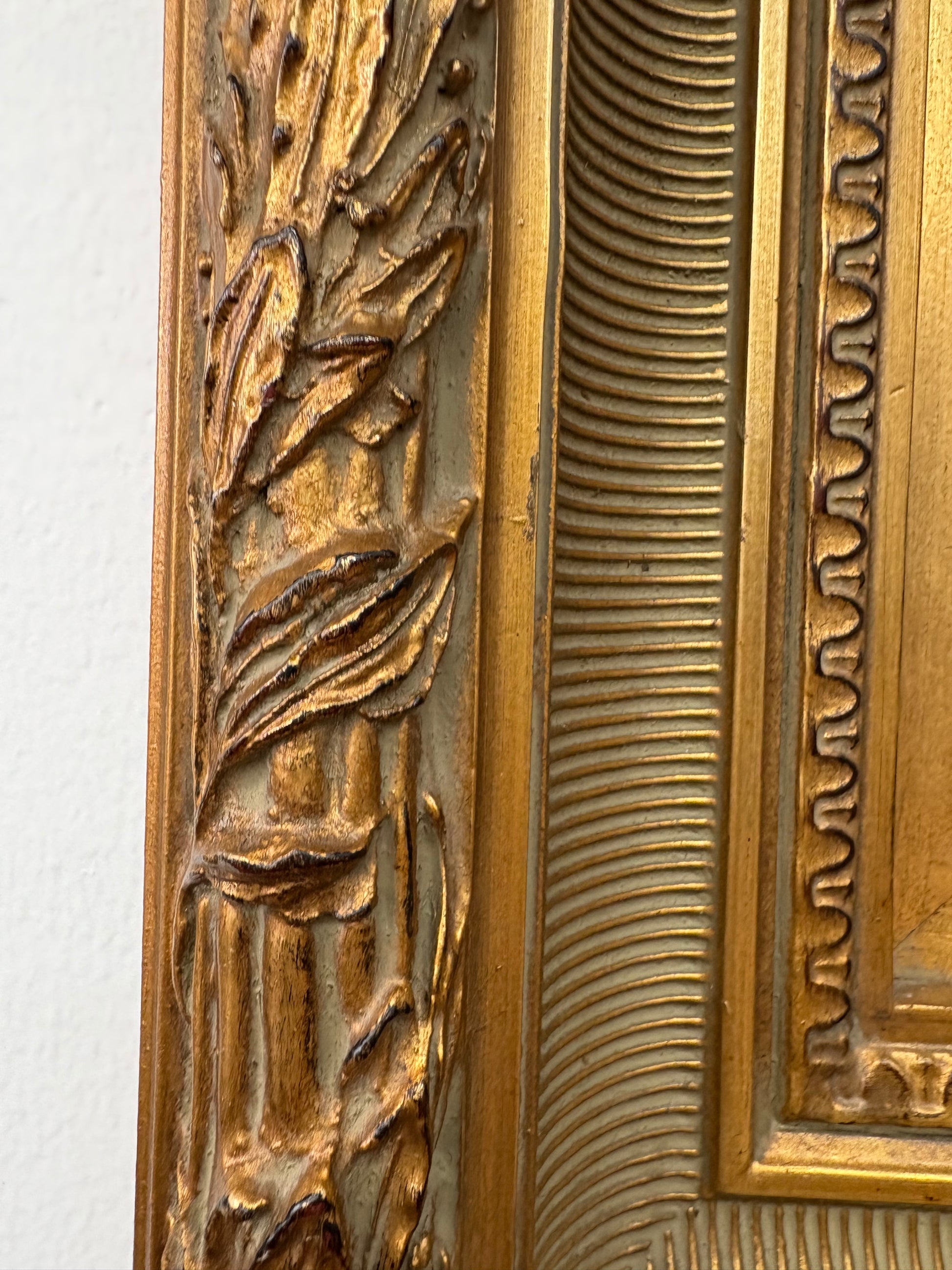 - Frame: Carved wood, antique-gold finish with ribbed cove and acanthus relief; 4″ deep profile