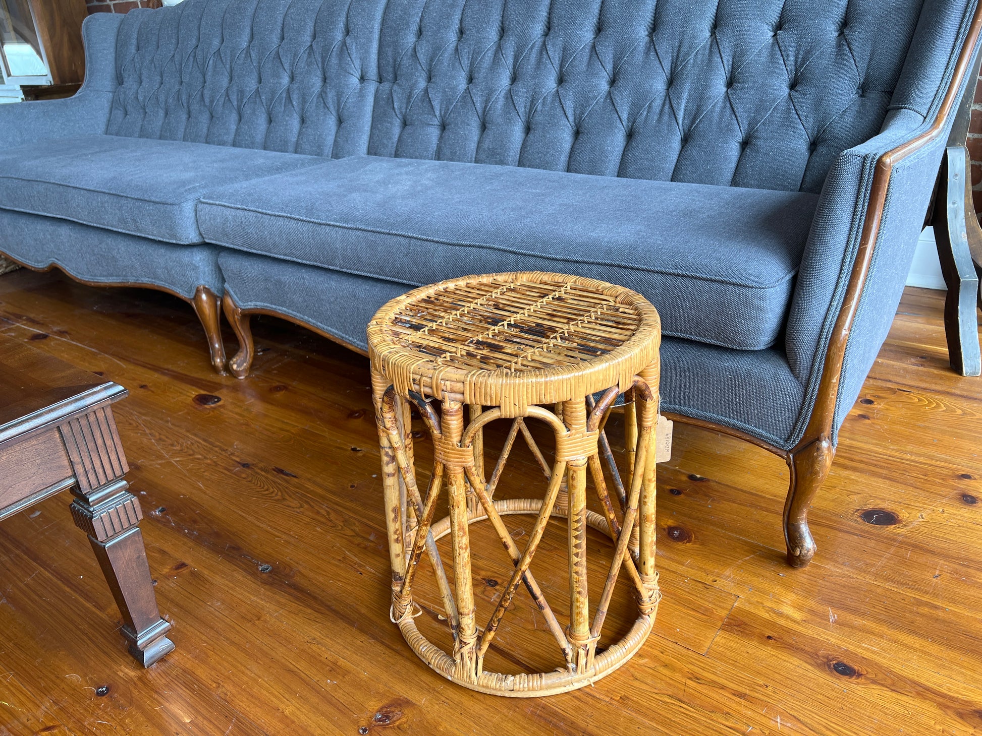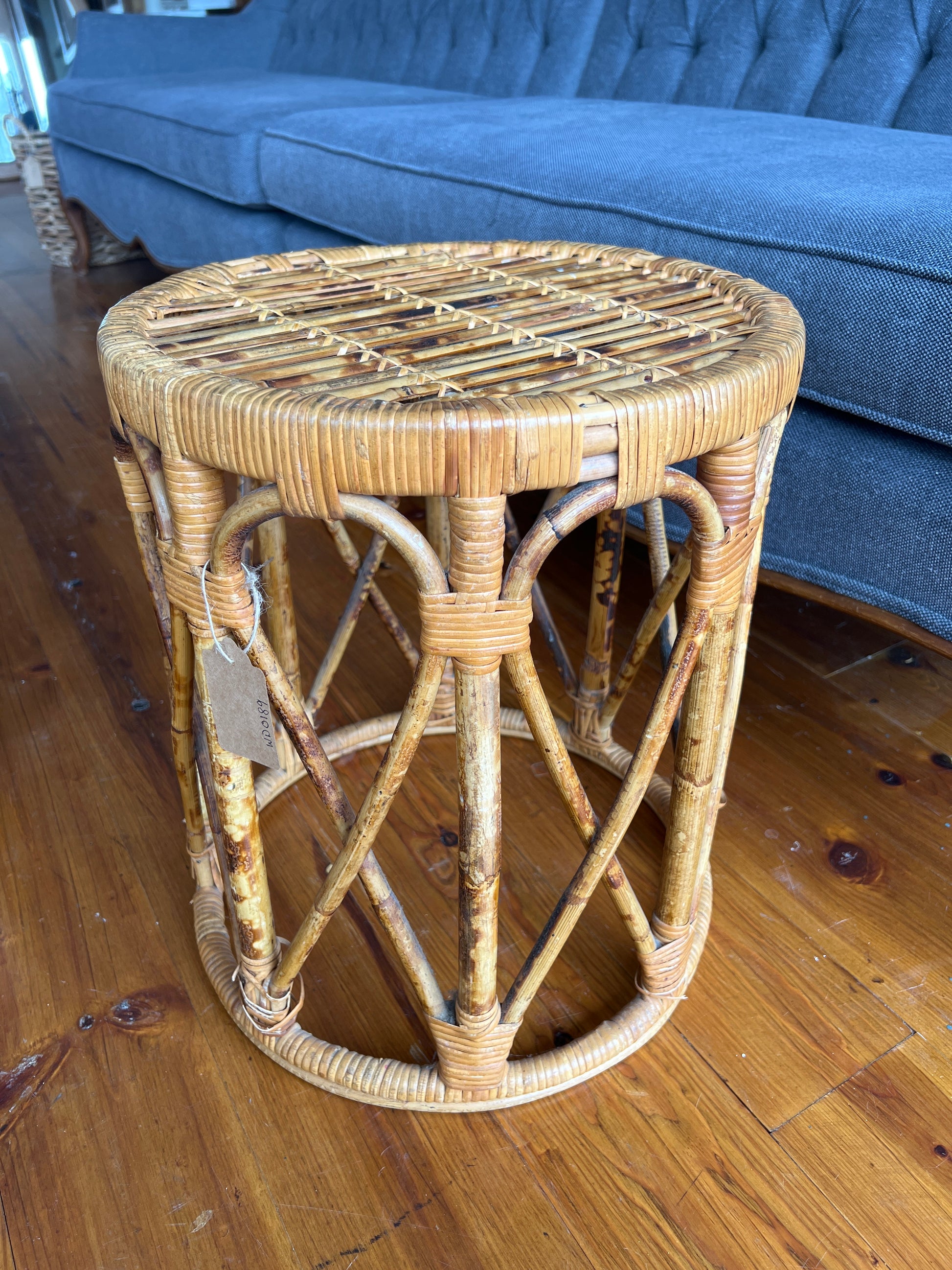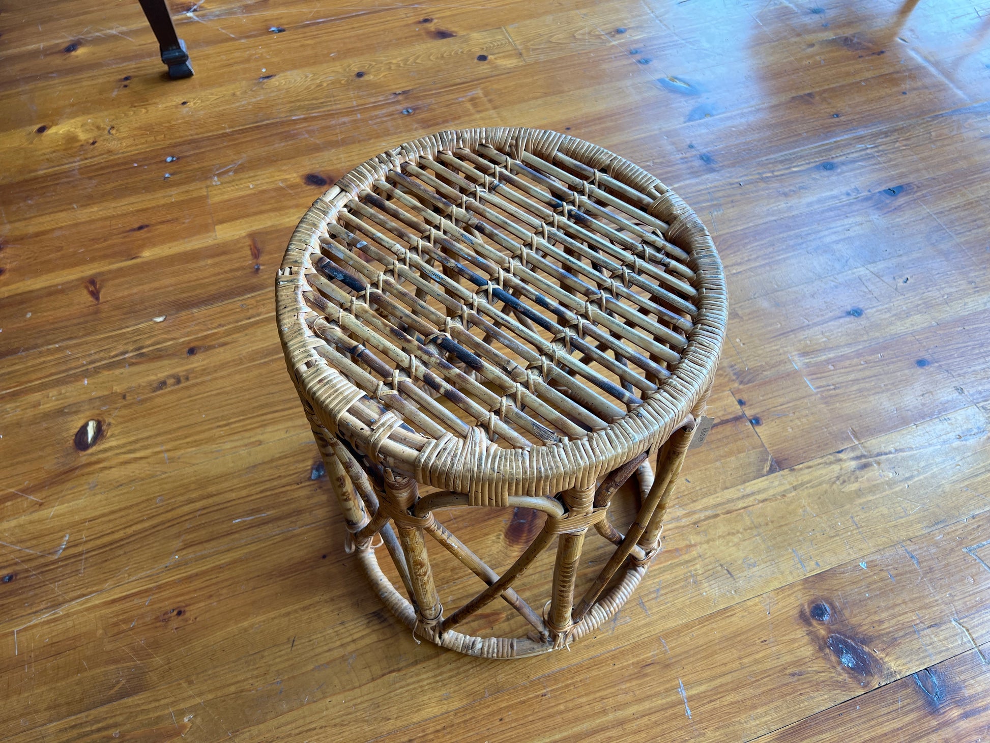 A sculptural and lightweight burnt bamboo drum table from the 1960s, featuring a round top, open-weave base, and natural tortoise bamboo finish. This piece is equally suited as a boho-style side table, plant stand, or accent seat. The warm honey tones and organic textures bring an airy, collected feel to any room.