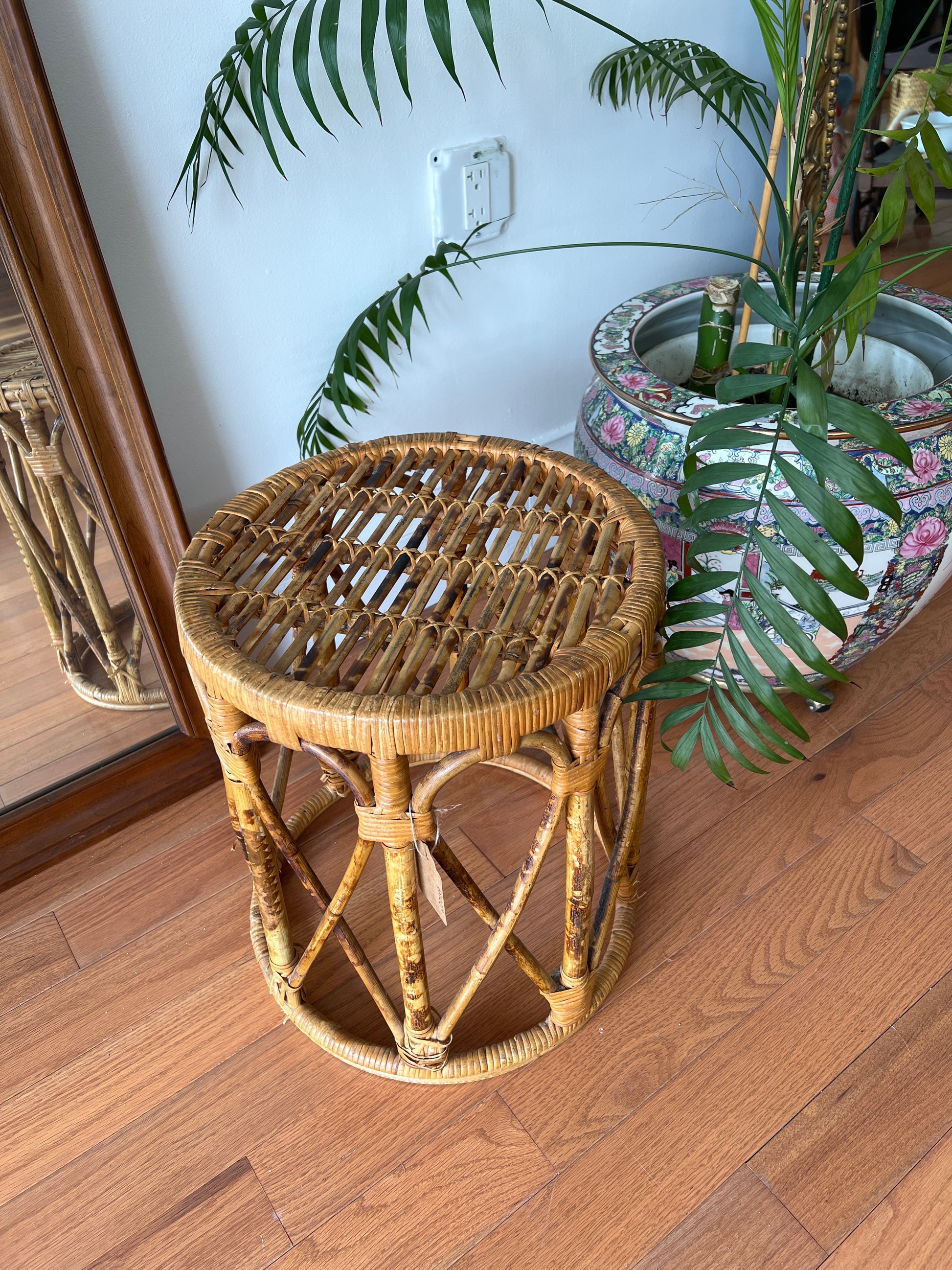 1960s Burnt Bamboo Drum Table – Tortoise Cane Plant Stand or Boho Side Table
