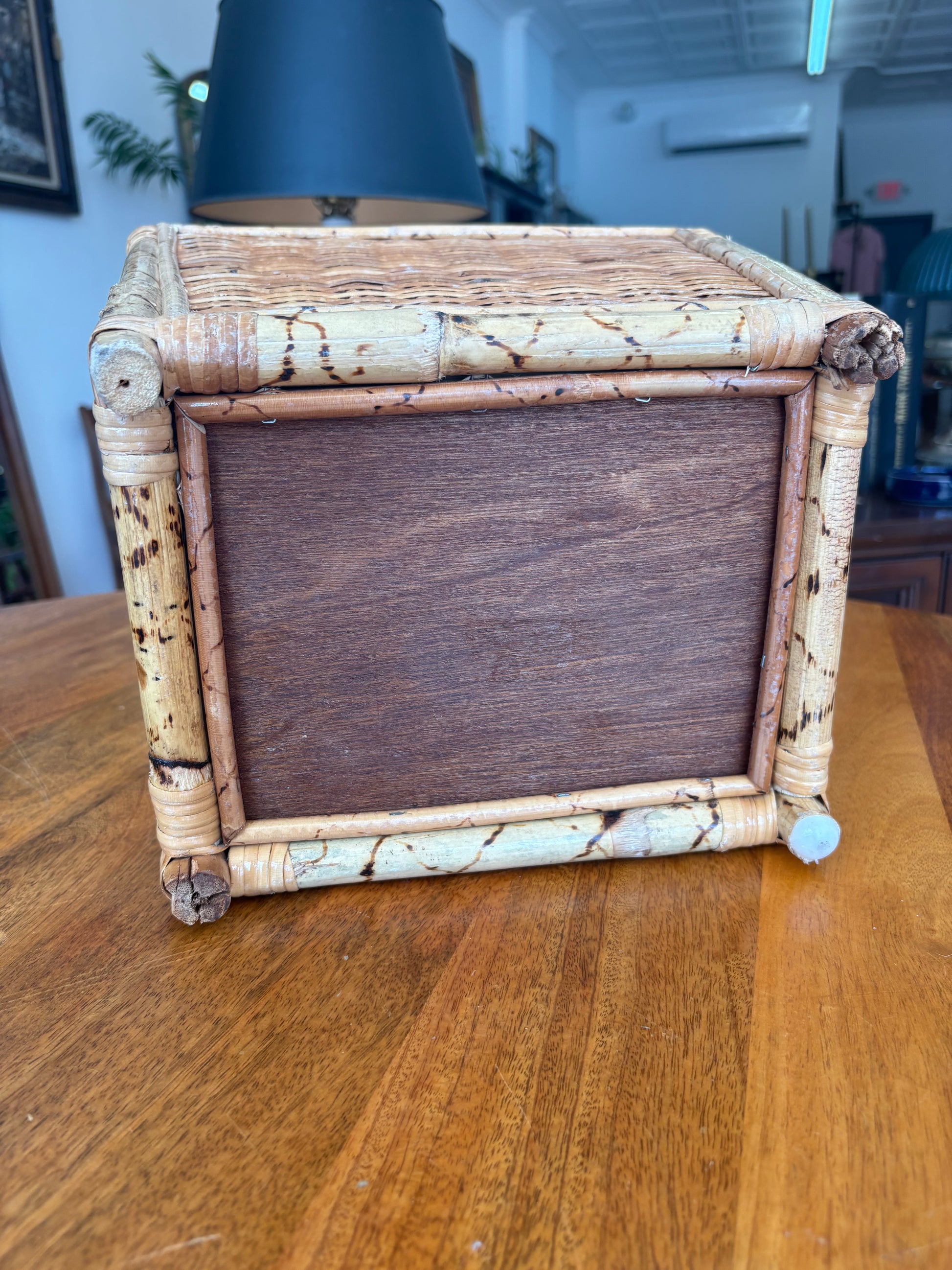 A beautiful and functional vintage piece, this bamboo and wicker bin brings instant warmth and texture to any room. With its sturdy frame and tortoise-pattern bamboo trim, it works equally well as a wastebasket, planter cover, or storage solution. A standout piece for lovers of vintage boho, coastal, or mid-century design.