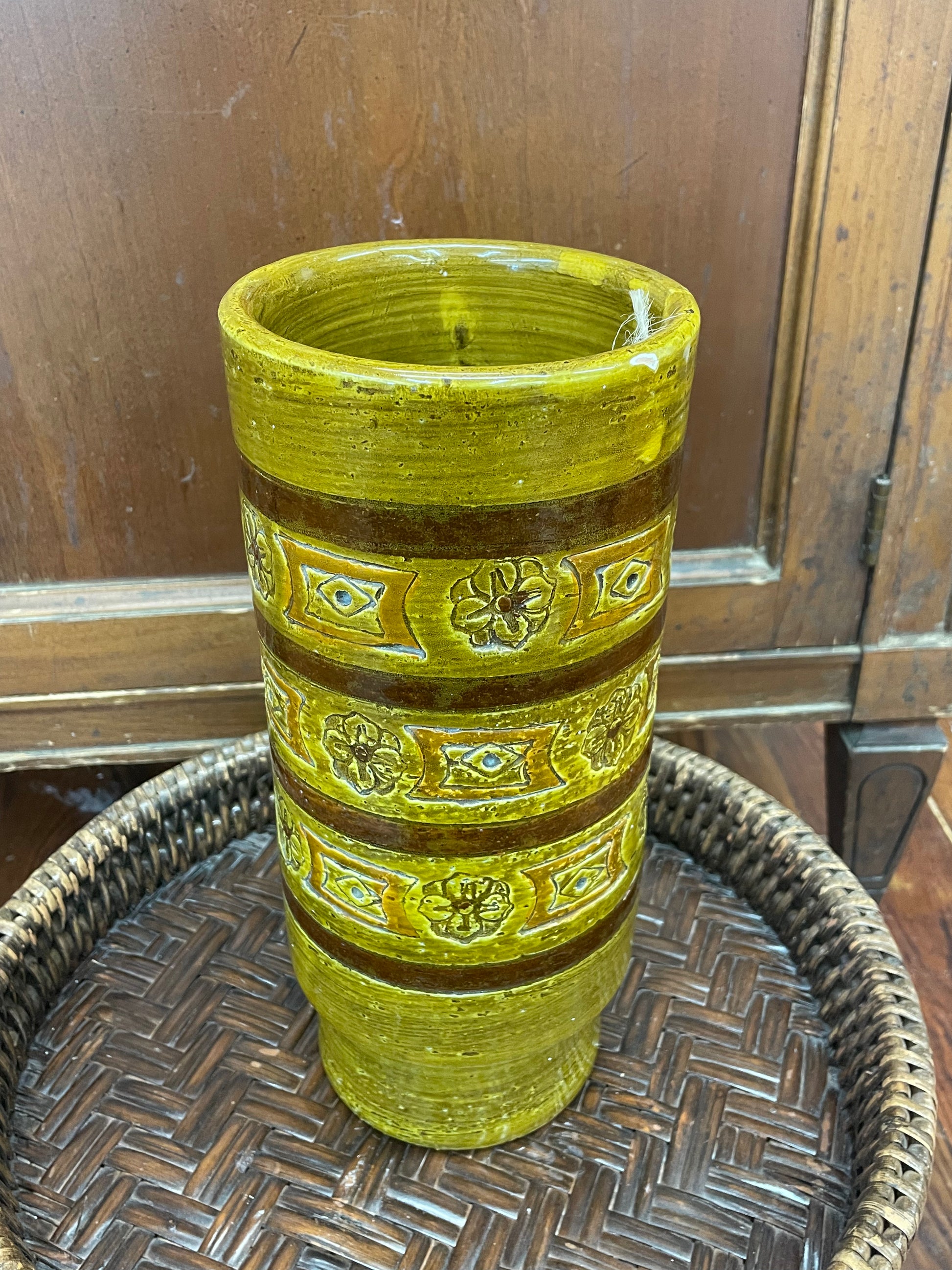 This striking Mid-Century Modern ceramic vase was designed by Aldo Londi and produced by Bitossi in Italy for Rosenthal Netter between the 1960s and 1970s. Featuring a rare green glaze with creamy white bubble-like accents, this cylindrical vase reflects the distinctive textured aesthetic Bitossi is known for. The piece is signed on the base and showcases classic Italian modernist craftsmanship, perfect for collectors or anyone looking to elevate a space with vintage European flair. A beautiful example of postwar Italian art pottery.