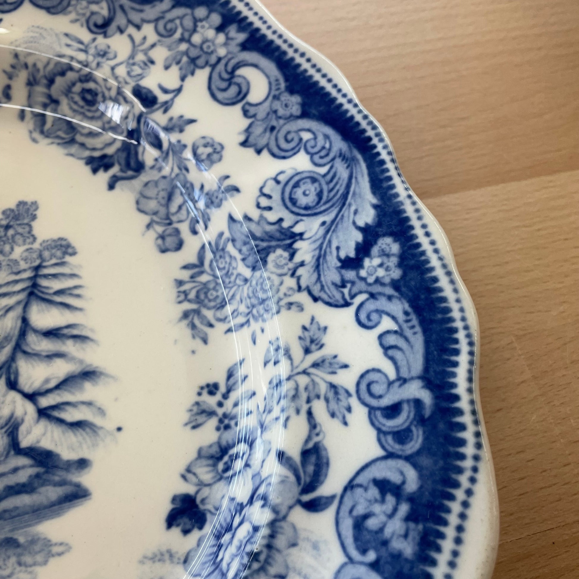 Use as a functional platter or hang as part of a blue and white wall collection. Adds classic English cottage or farmhouse charm to kitchens, hutches, and dining rooms. A beautiful addition to any curated transferware grouping.