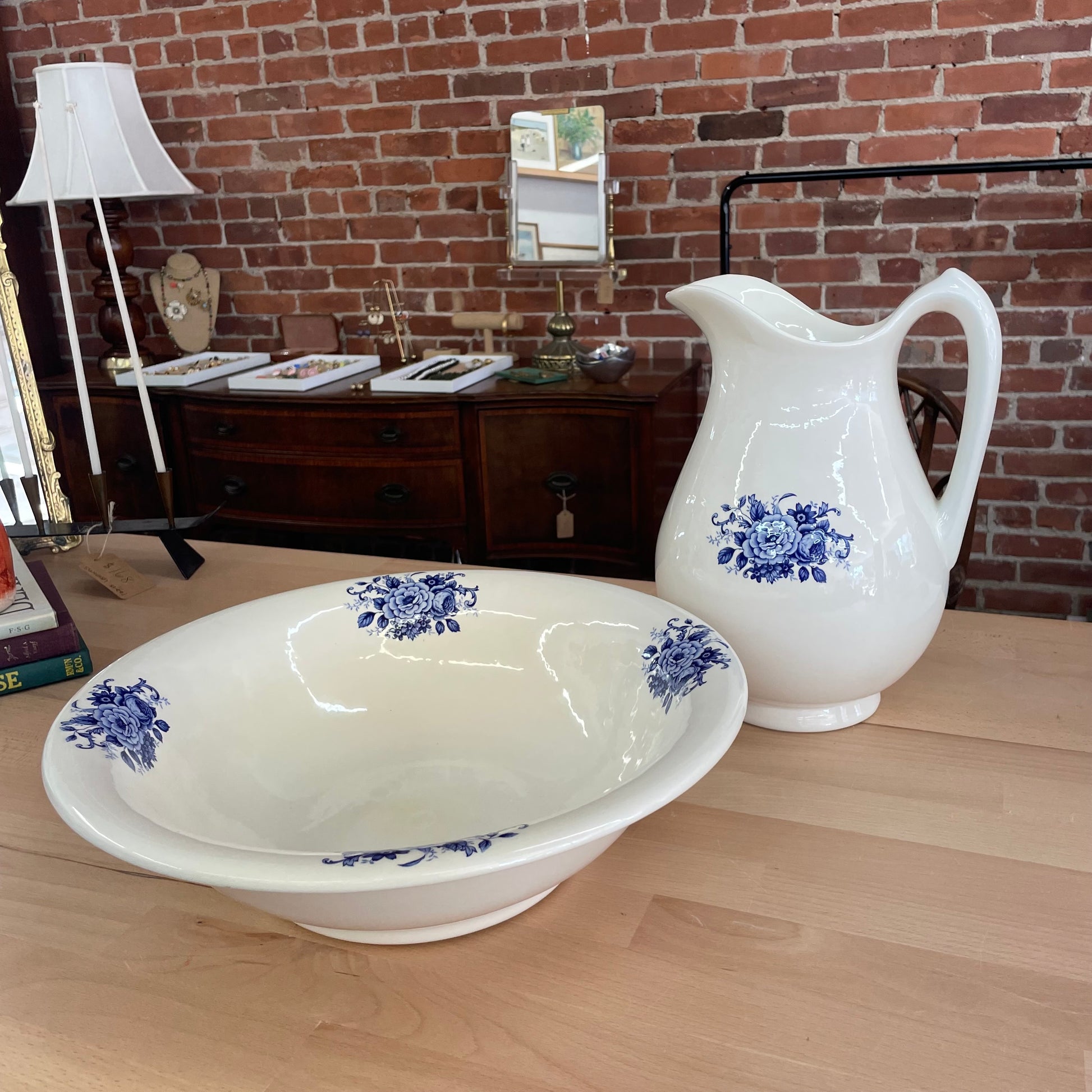 Vintage Blue & White Floral Ceramic Wash Basin and Pitcher Set