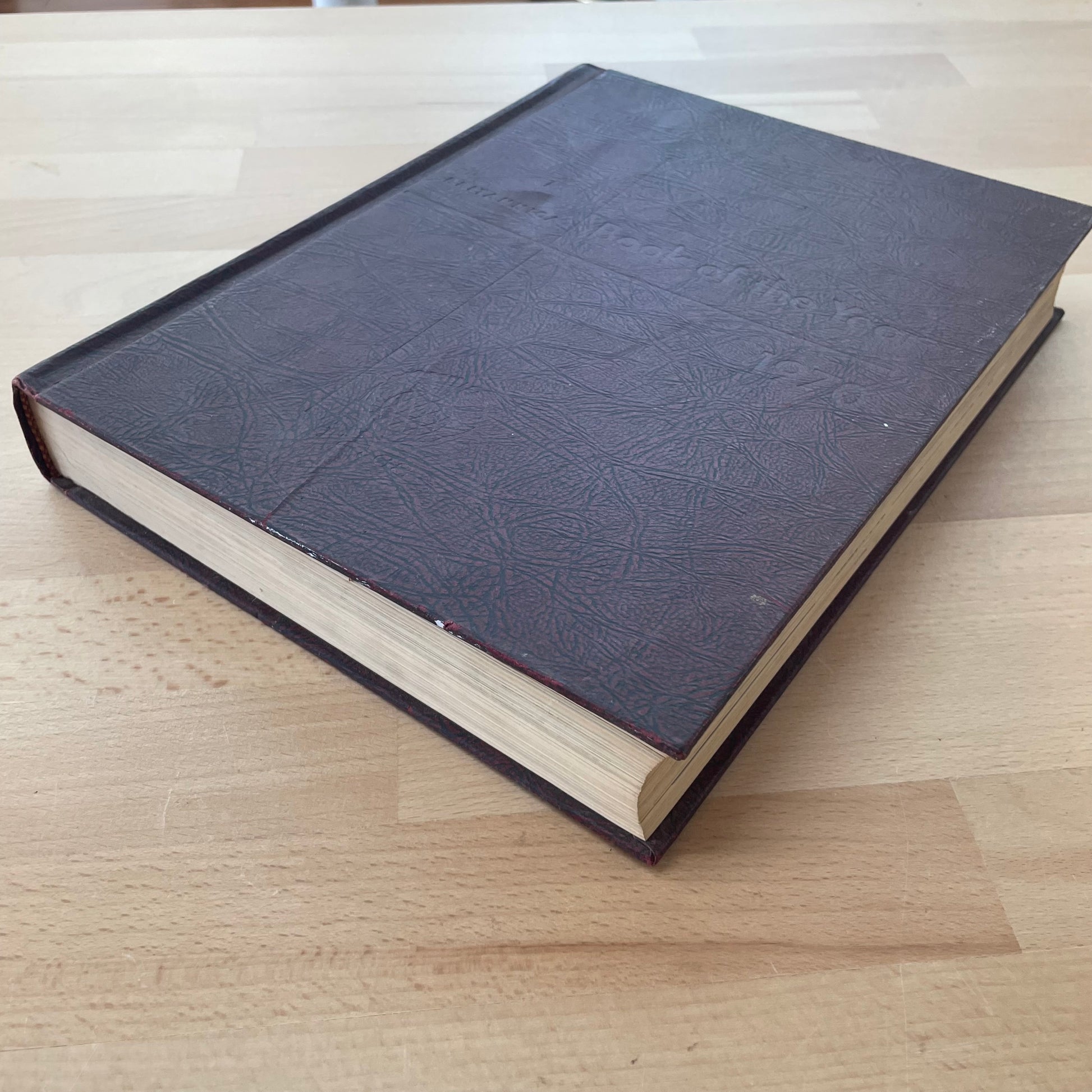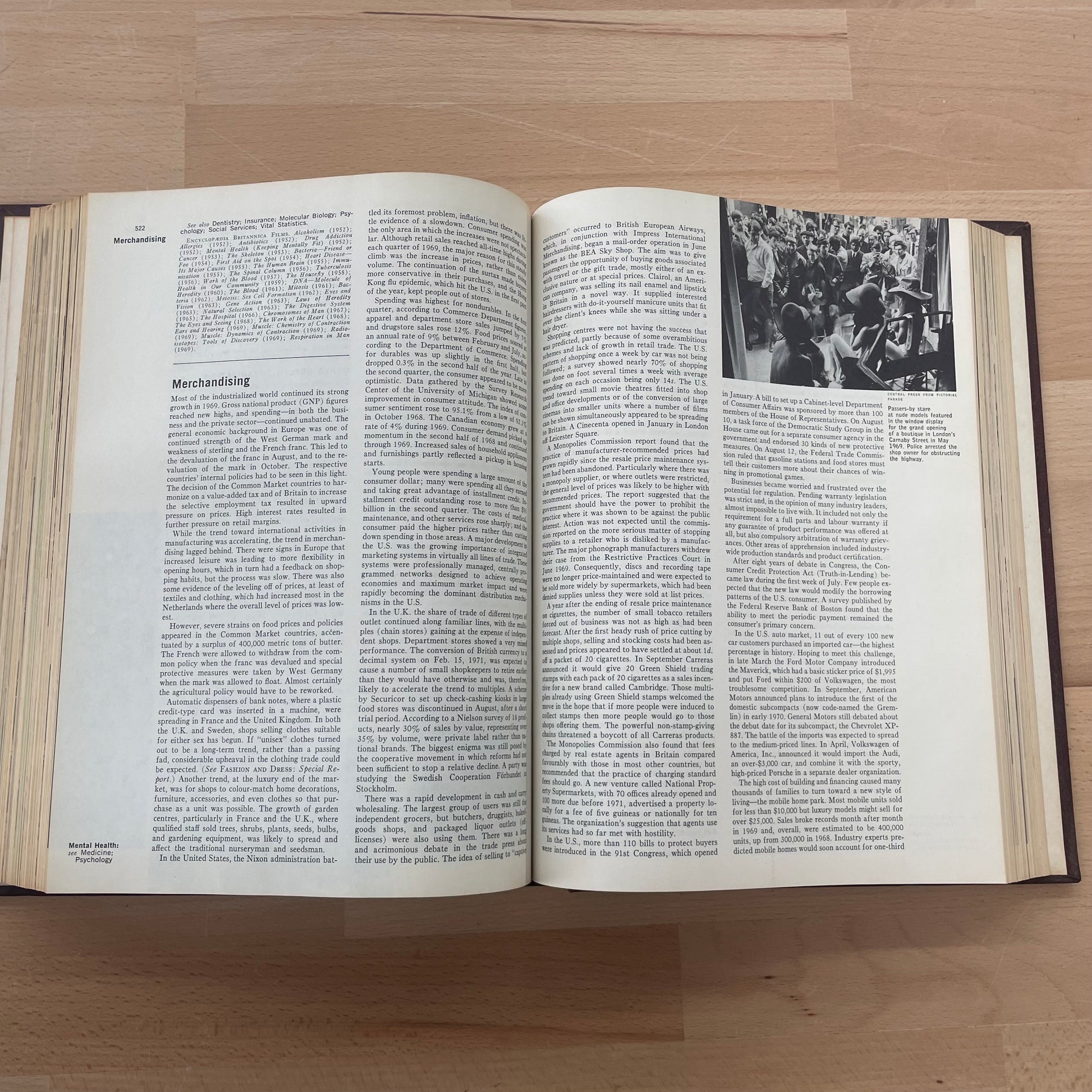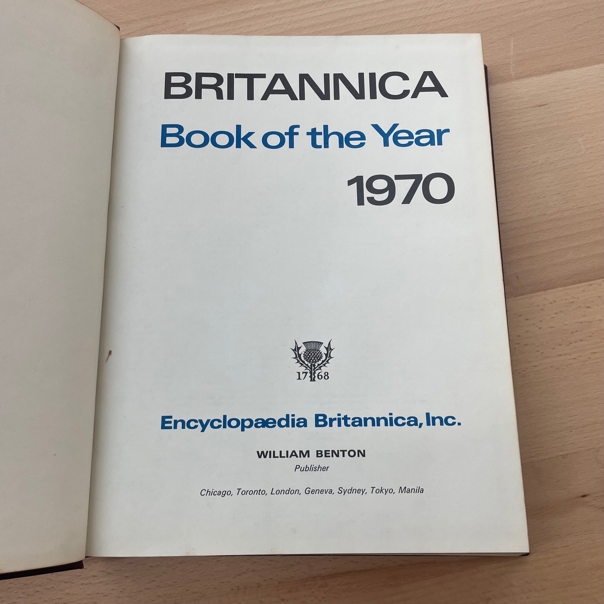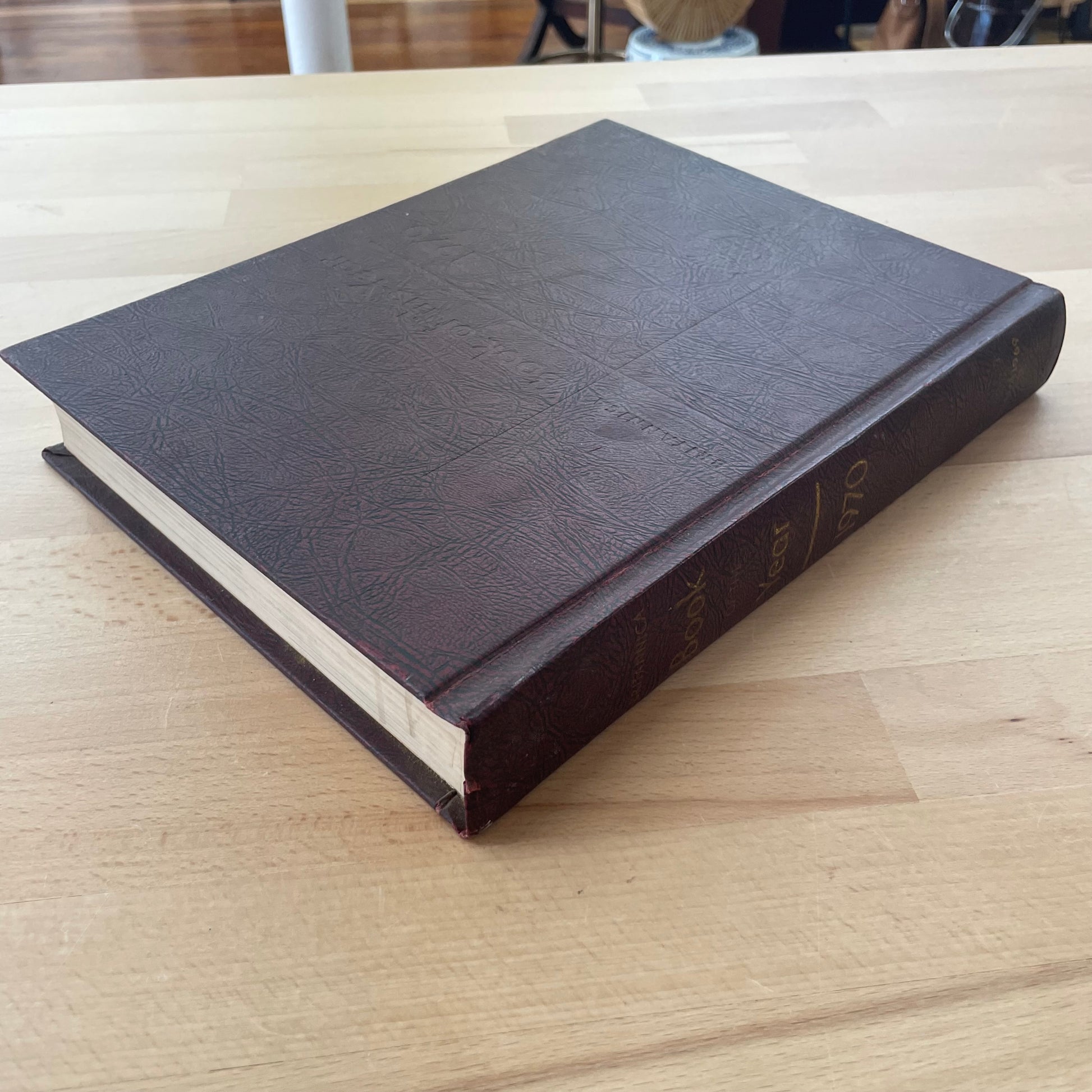 A sleek mid-century volume chronicling the pivotal events of 1969—from moon landings to Woodstock—in Britannica’s distinctive “Book of the Year” format. The embossed maroon hardcover and gold spine text make it as stylish as it is historic.