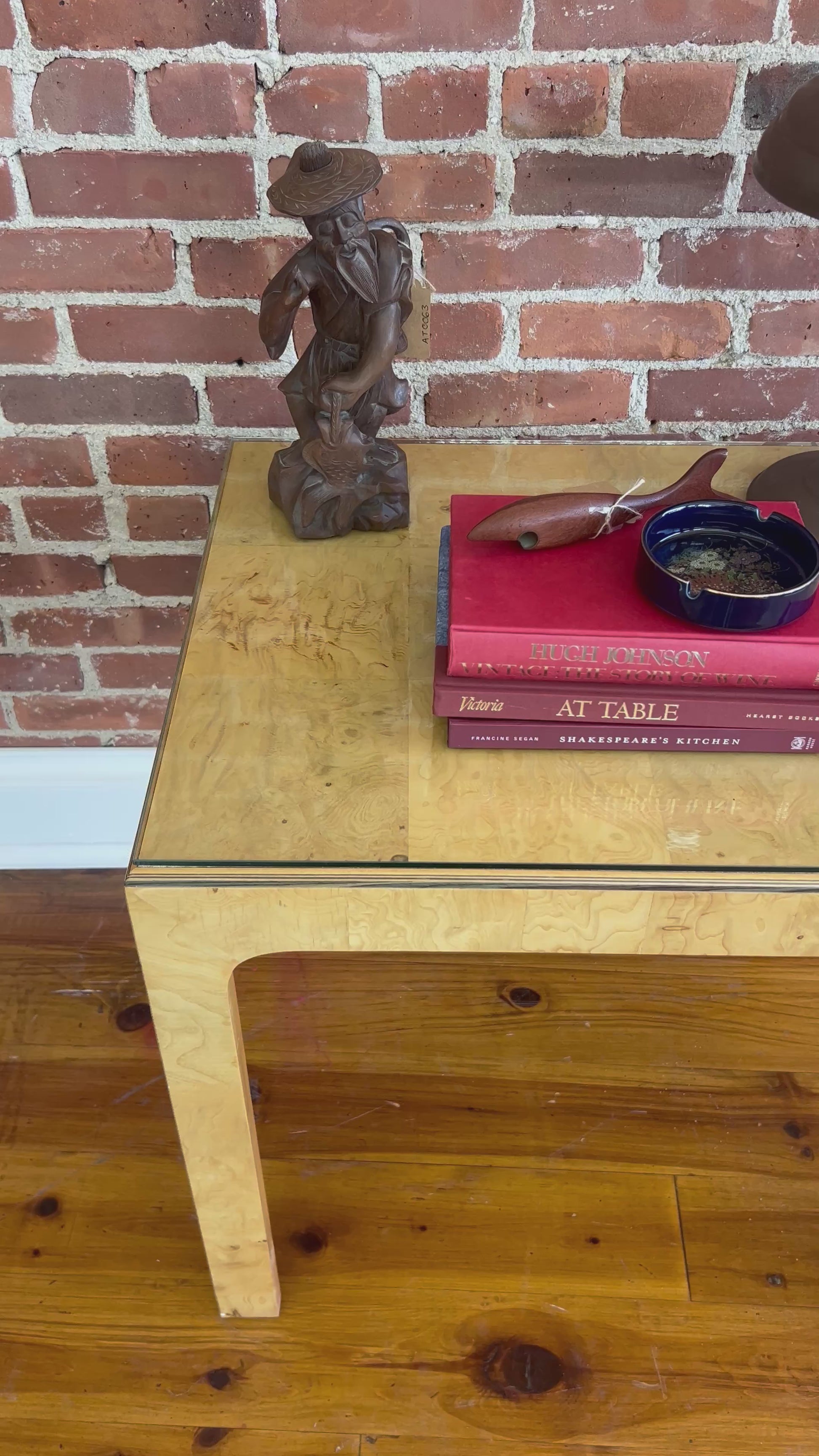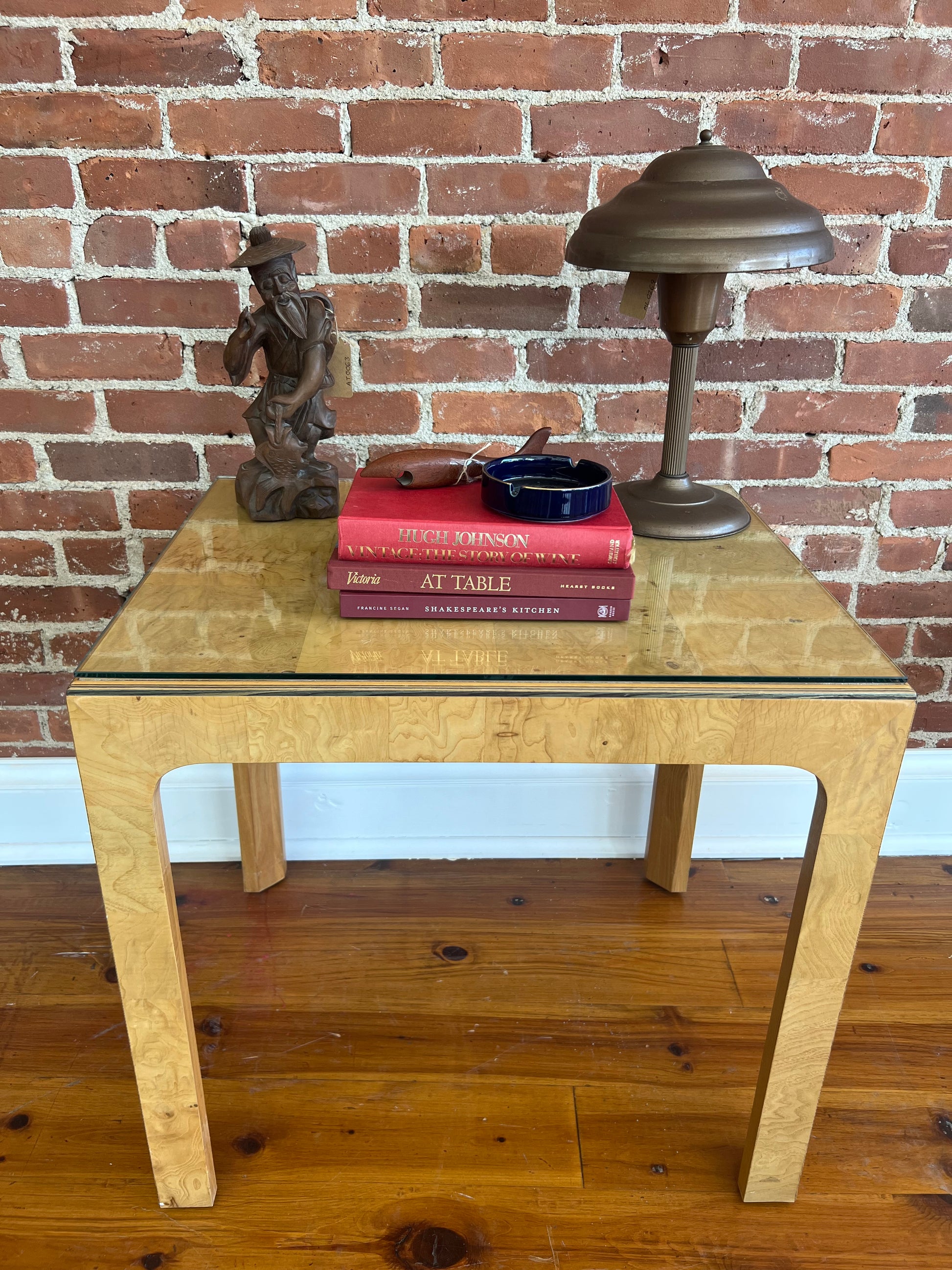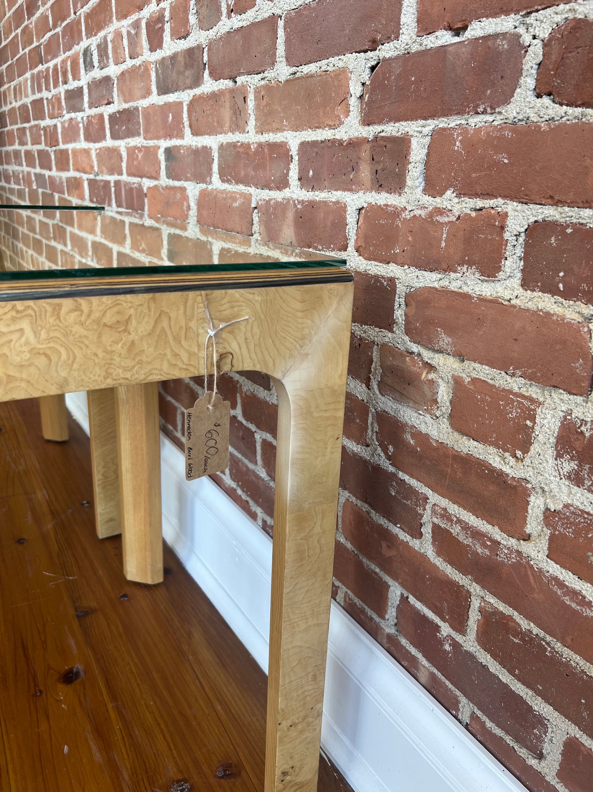 Materials: Burl wood veneer, glass top