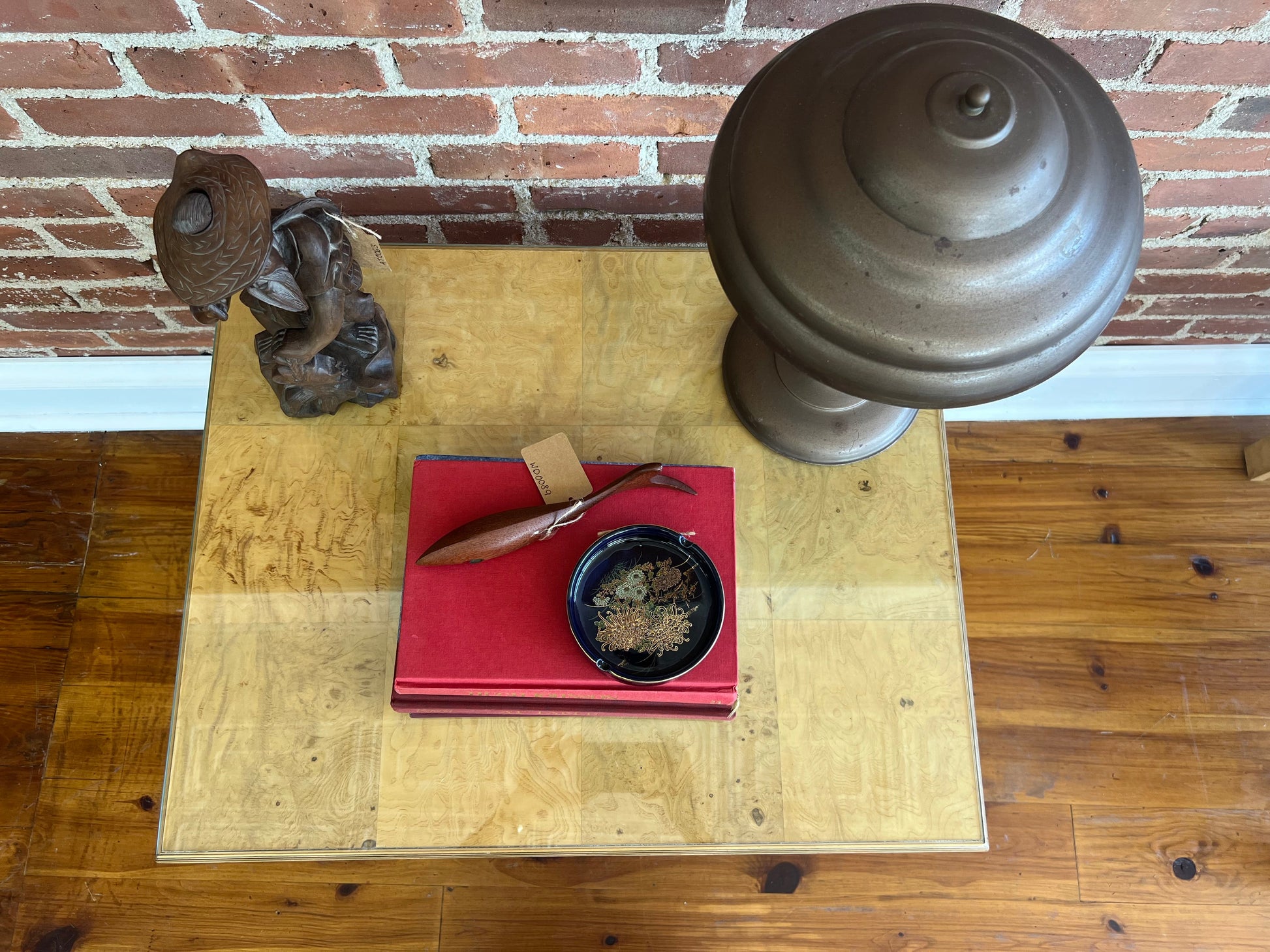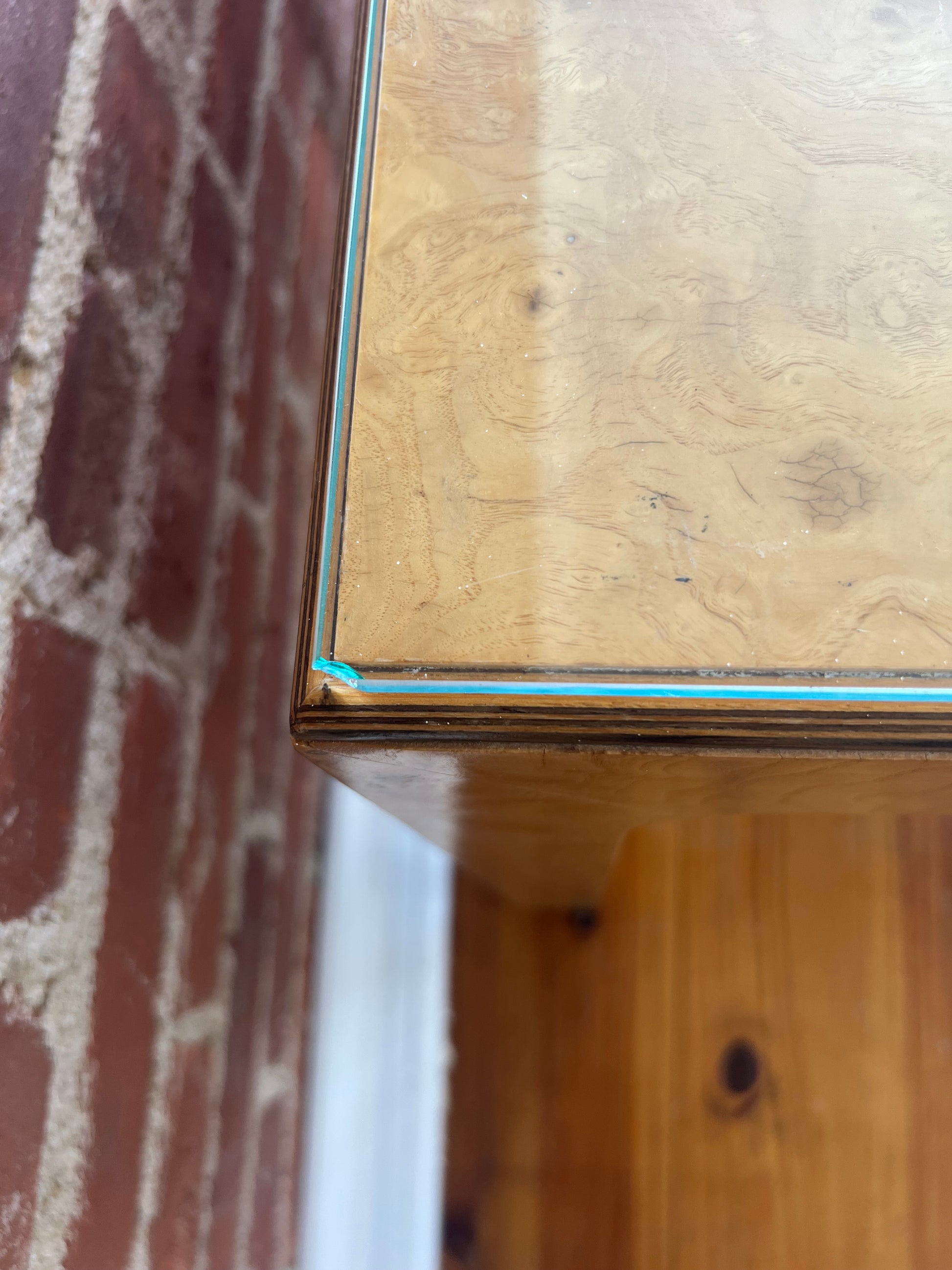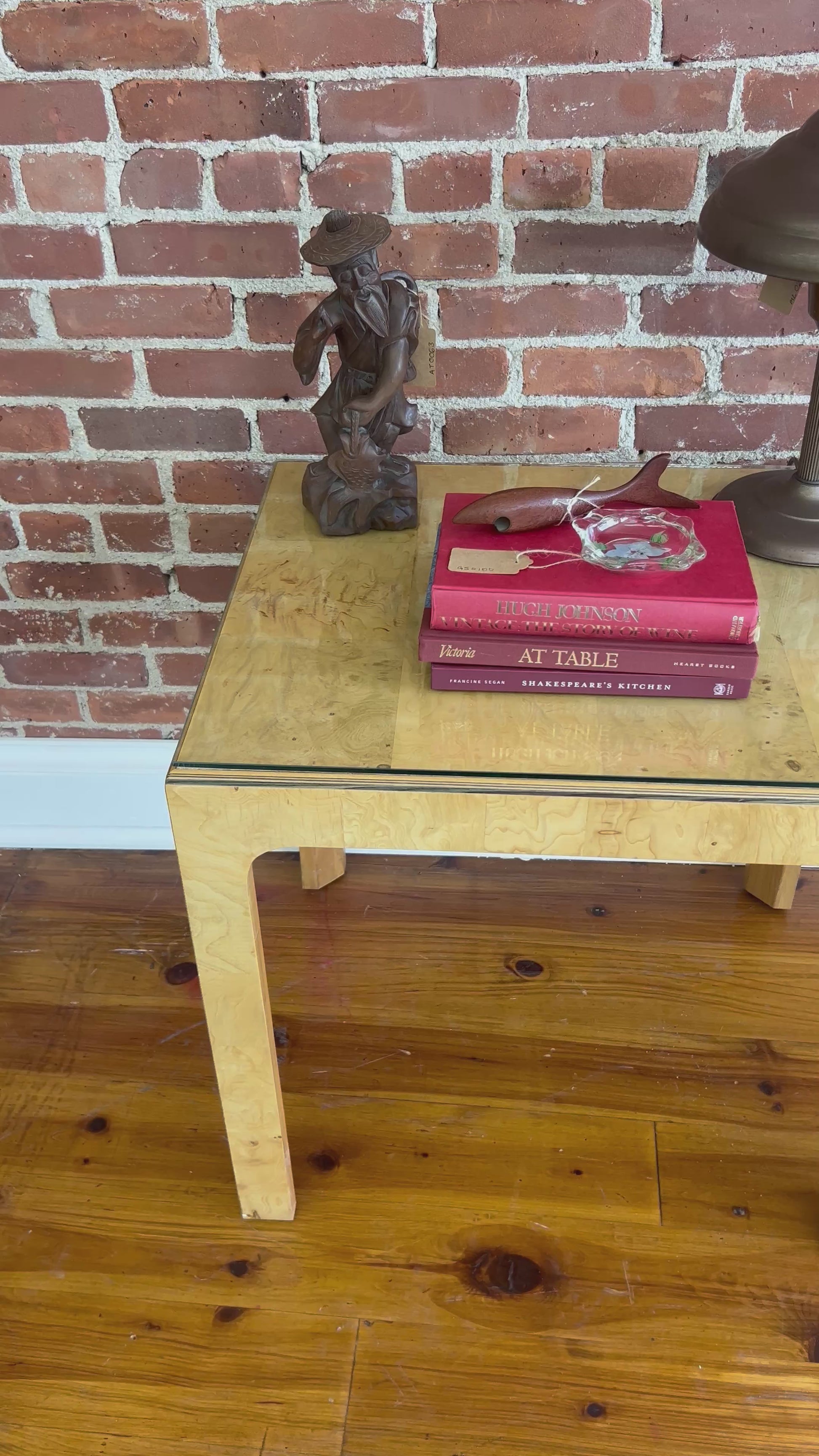 Materials: Burl wood veneer, glass top