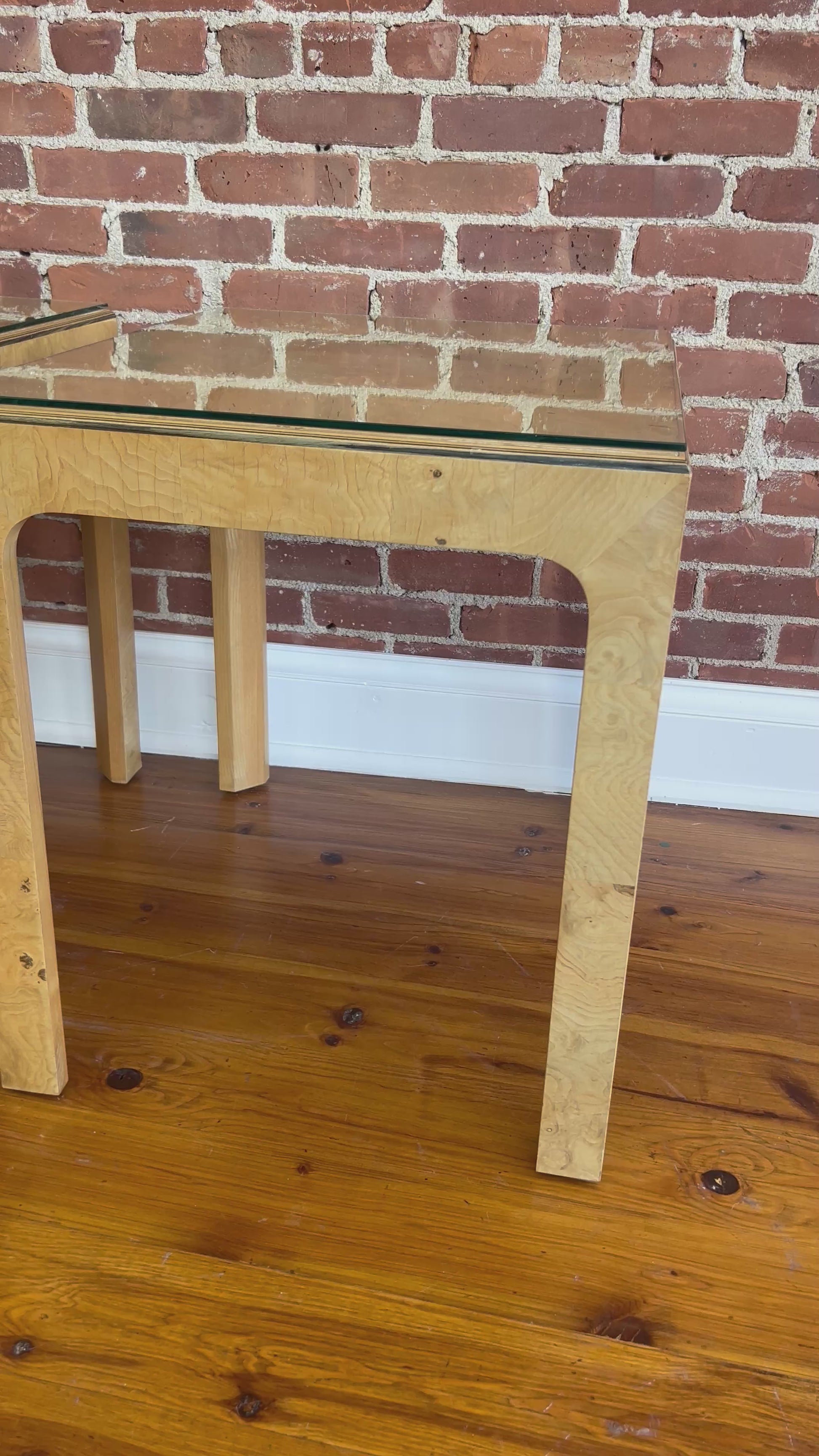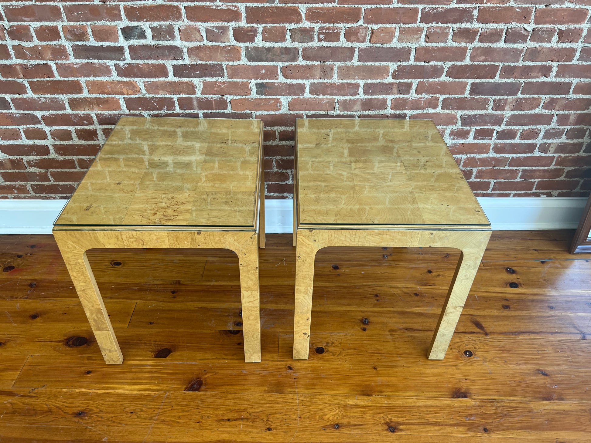 A striking pair of 1980s Henredon "Scene Two" end tables featuring bookmatched burl wood veneer and original inset glass tops. With clean, squared lines softened by subtly rounded corners, these iconic mid-century modern tables exude understated luxury. The natural burl wood patterning adds warmth and visual texture, while the inset glass keeps the look airy and sculptural.