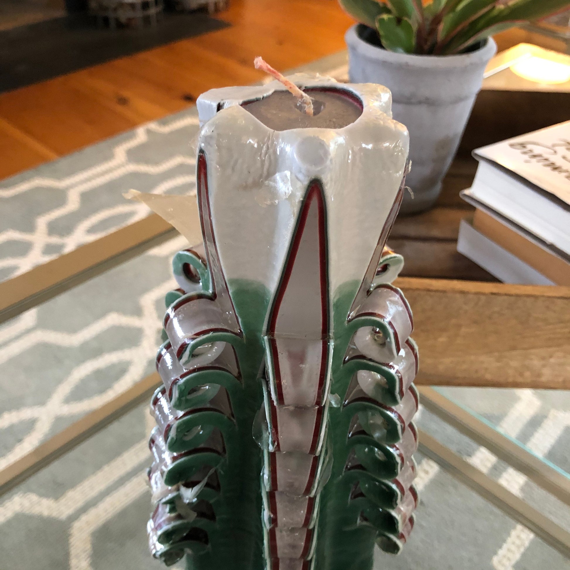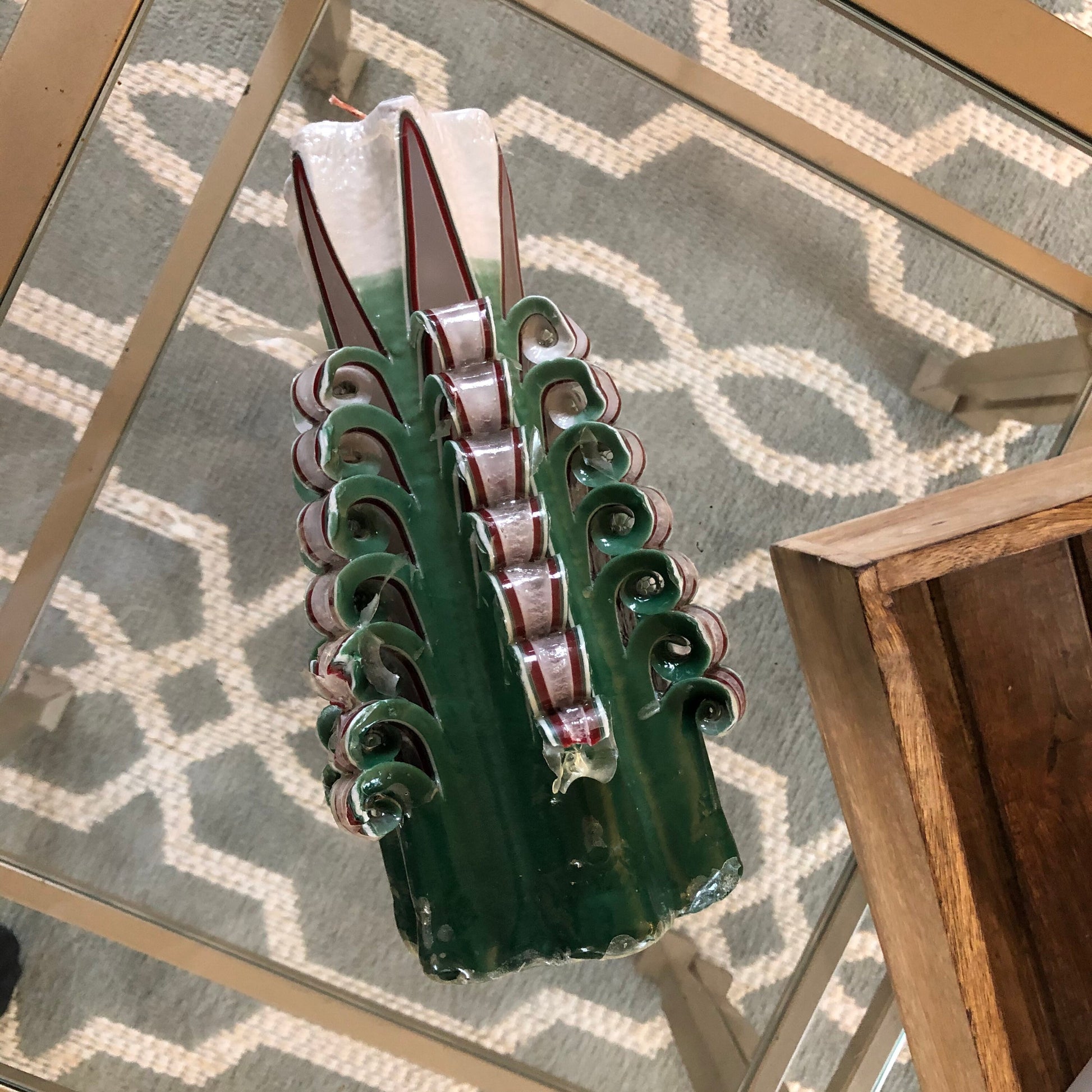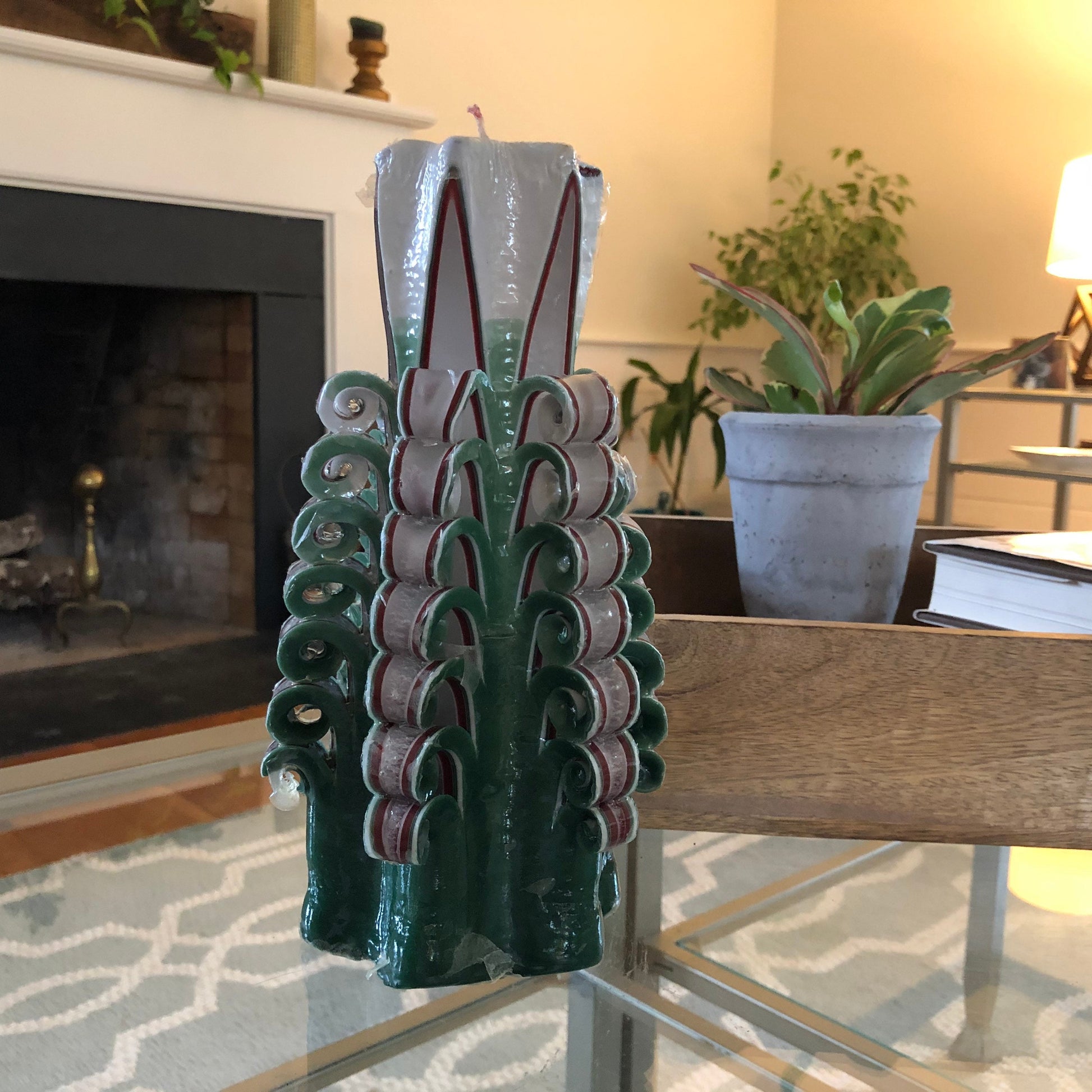 This vintage green, white and red hand carved candle is stunning. Carved layers are dominant in green stripes. This candle is one of a kind and will be even more beautiful as it slowly burns.