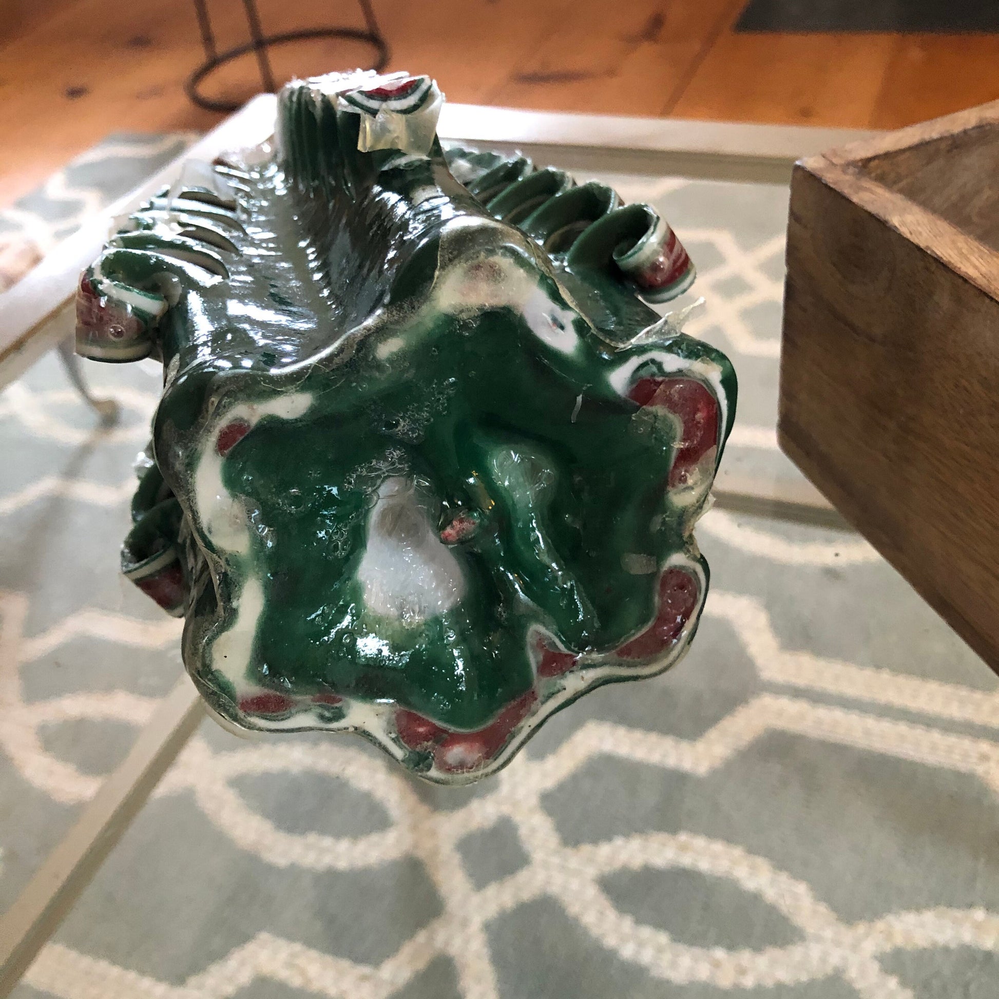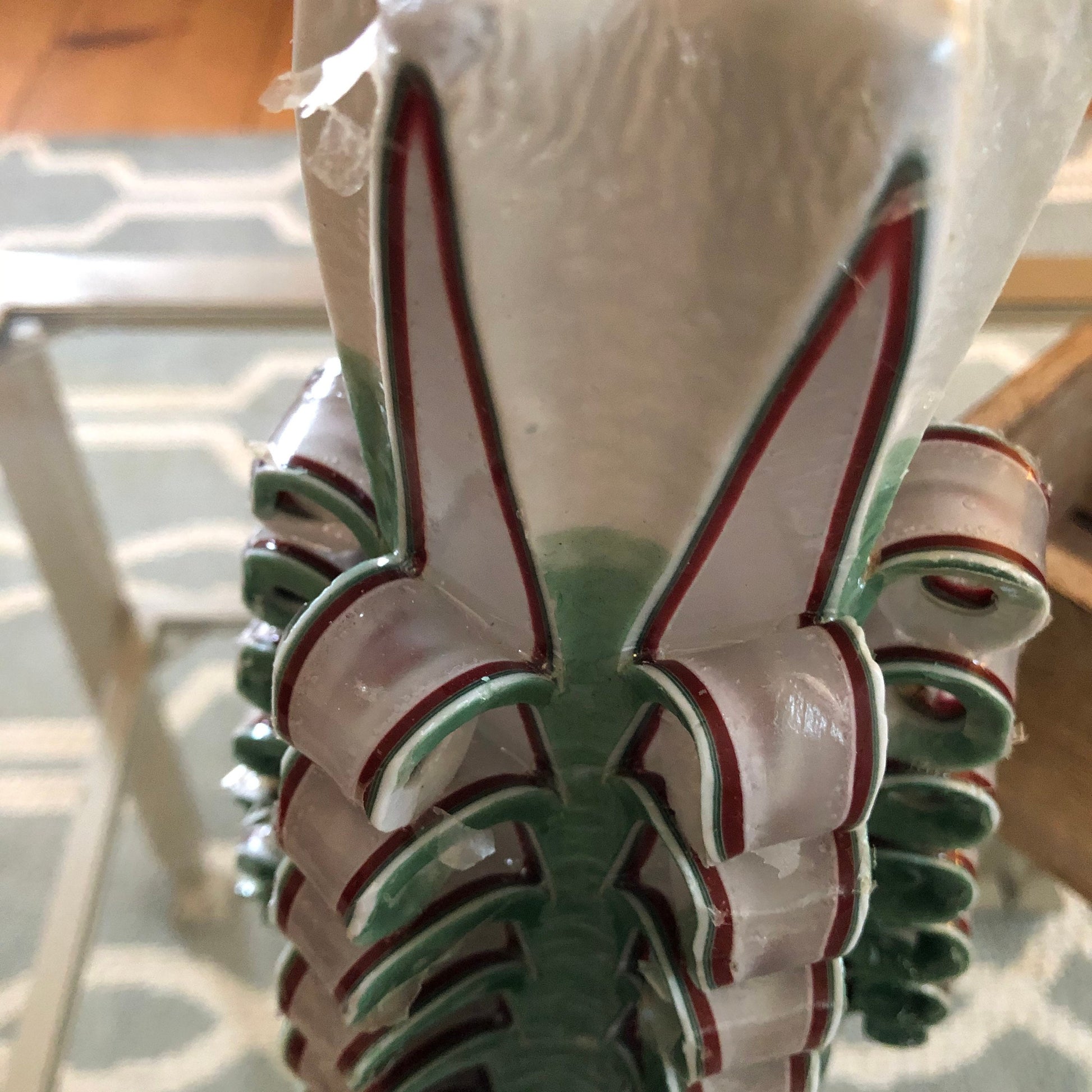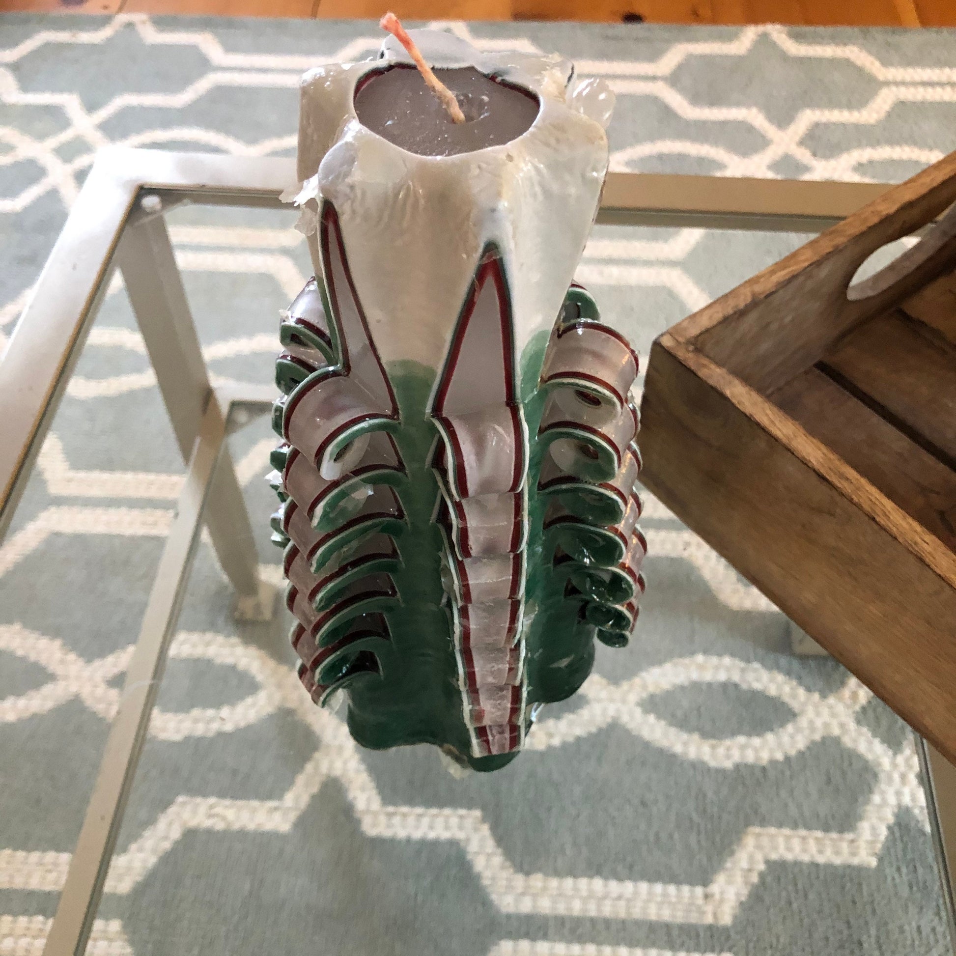 This vintage green, white and red hand carved candle is stunning. Carved layers are dominant in green stripes. This candle is one of a kind and will be even more beautiful as it slowly burns.