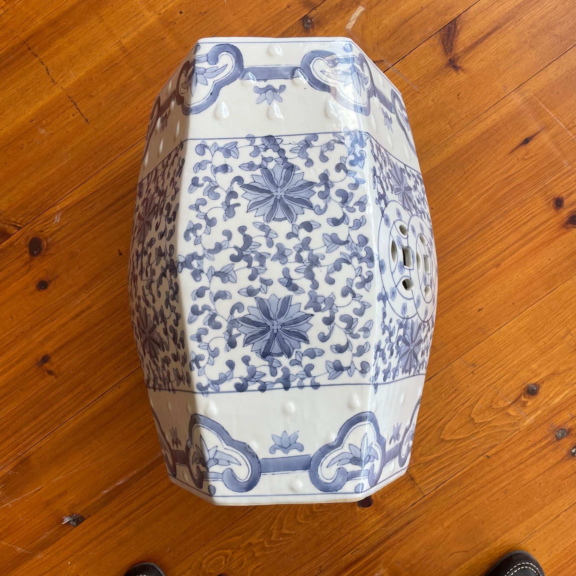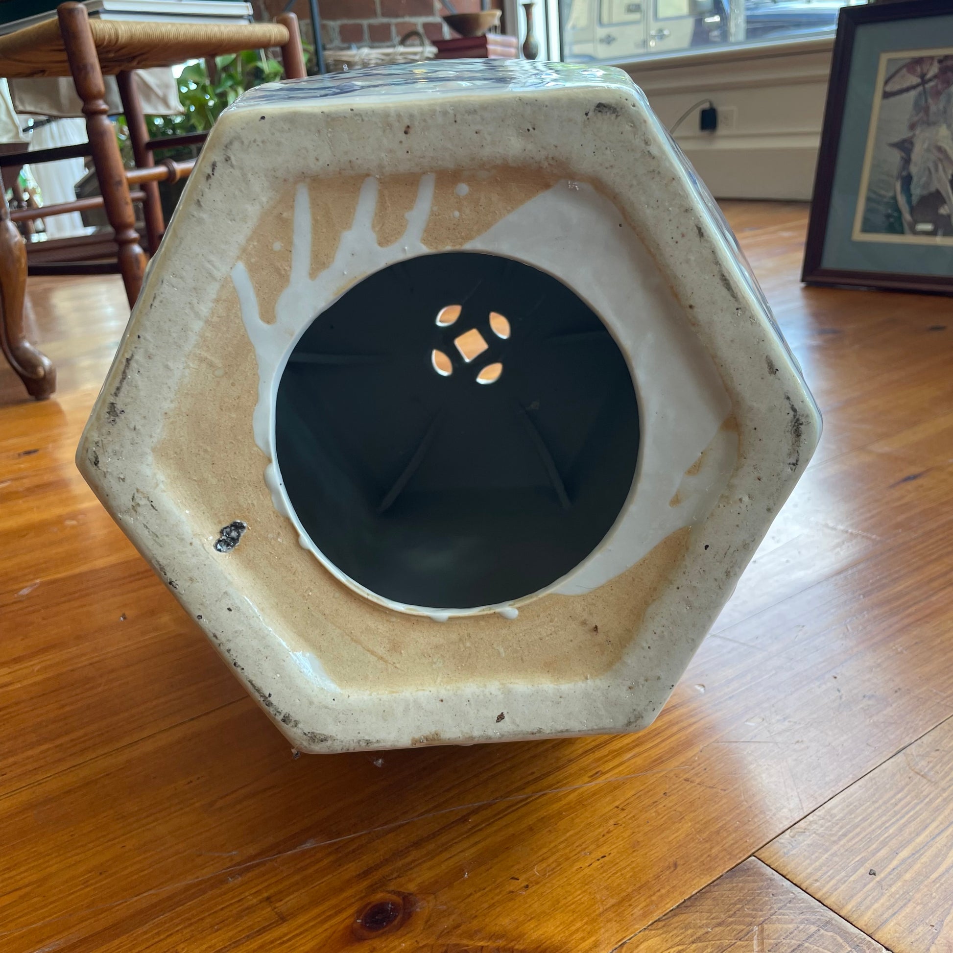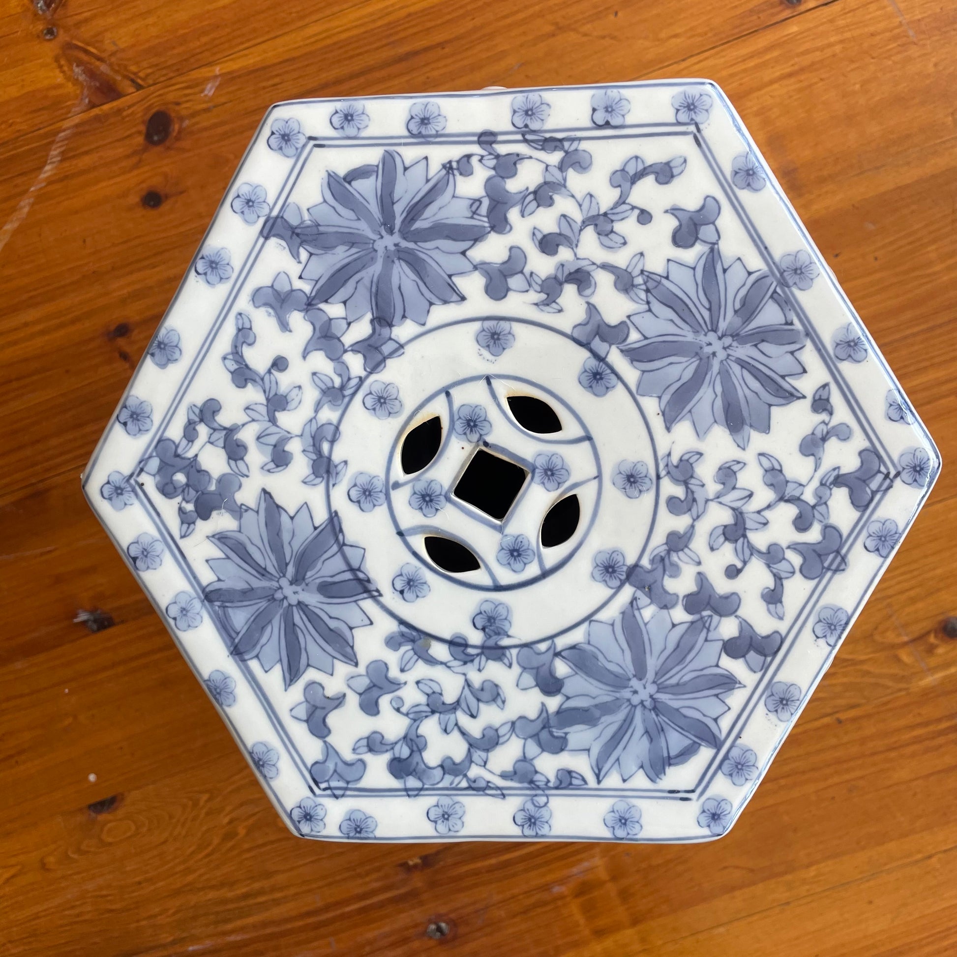 This elegant hexagonal porcelain garden stool brings timeless sophistication to any space. Featuring traditional Chinese motifs in deep cobalt blue against a crisp white glaze, it serves beautifully as a small accent table, plant stand, or sculptural statement indoors or out. The pierced medallion design and floral patterns nod to centuries-old Ming Dynasty ceramic artistry, while the squared form adds a crisp, architectural touch.