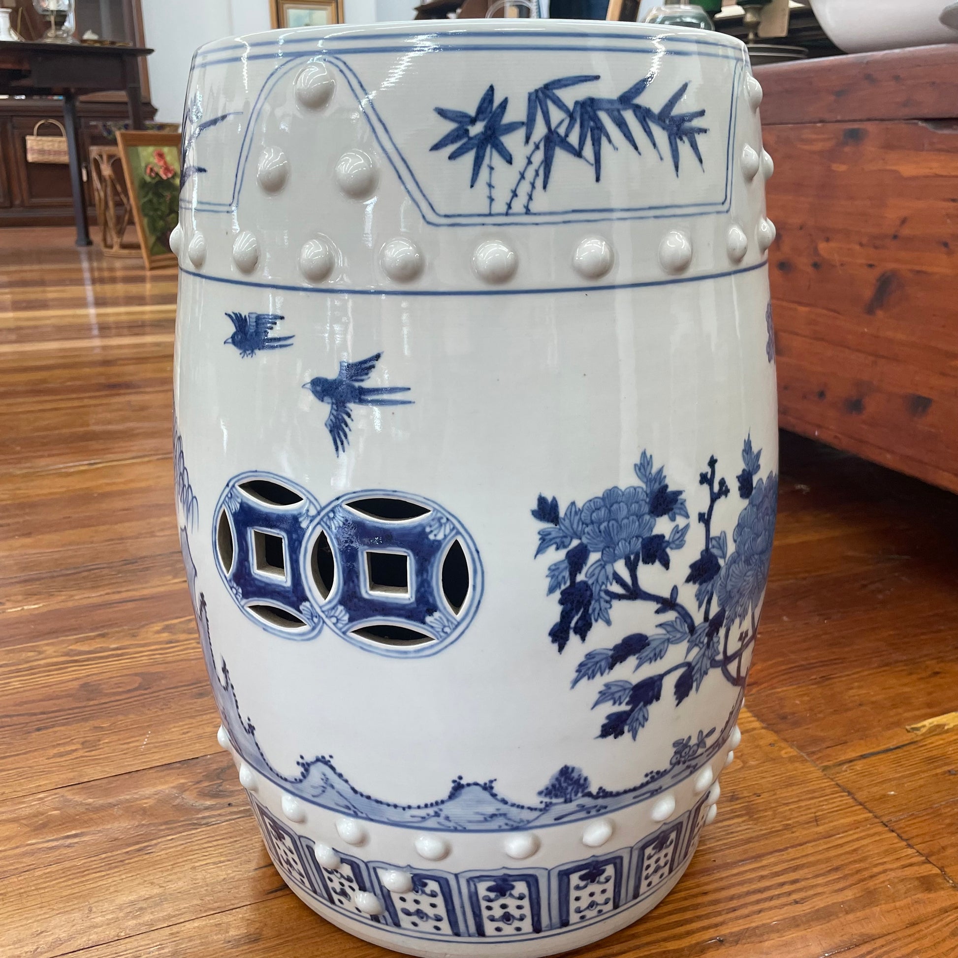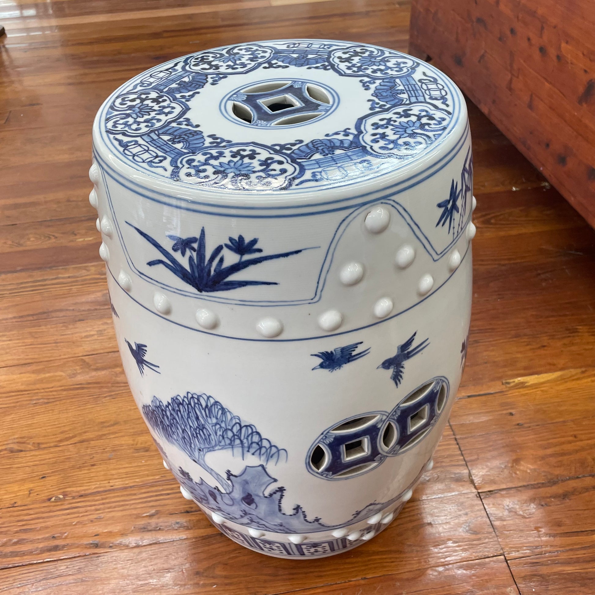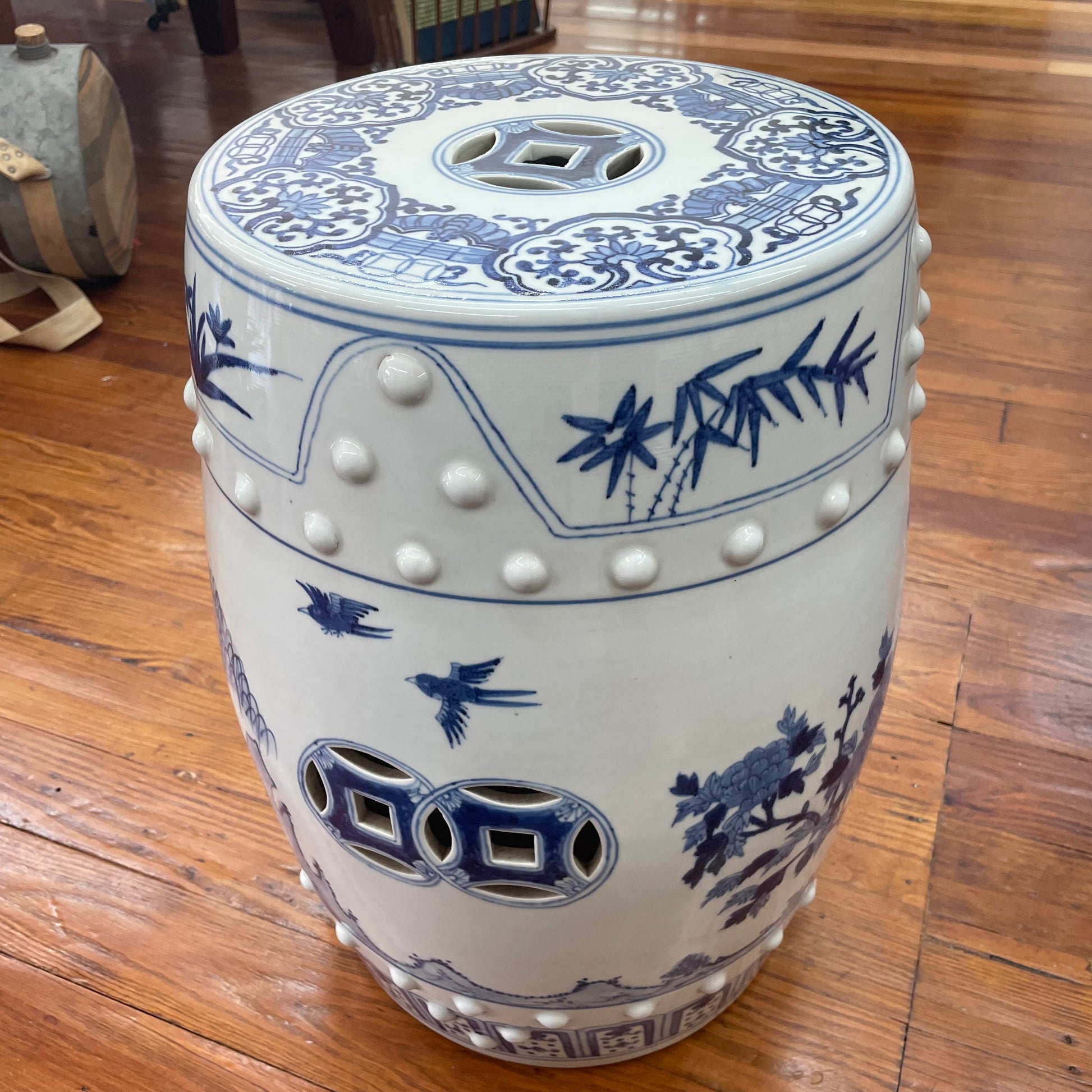 Use it as a chic end table next to a reading chair, a sculptural plant stand, or as additional seating in a sunroom or covered patio. Its classic blue and white palette plays well with neutral tones, rattan, and rich wood.