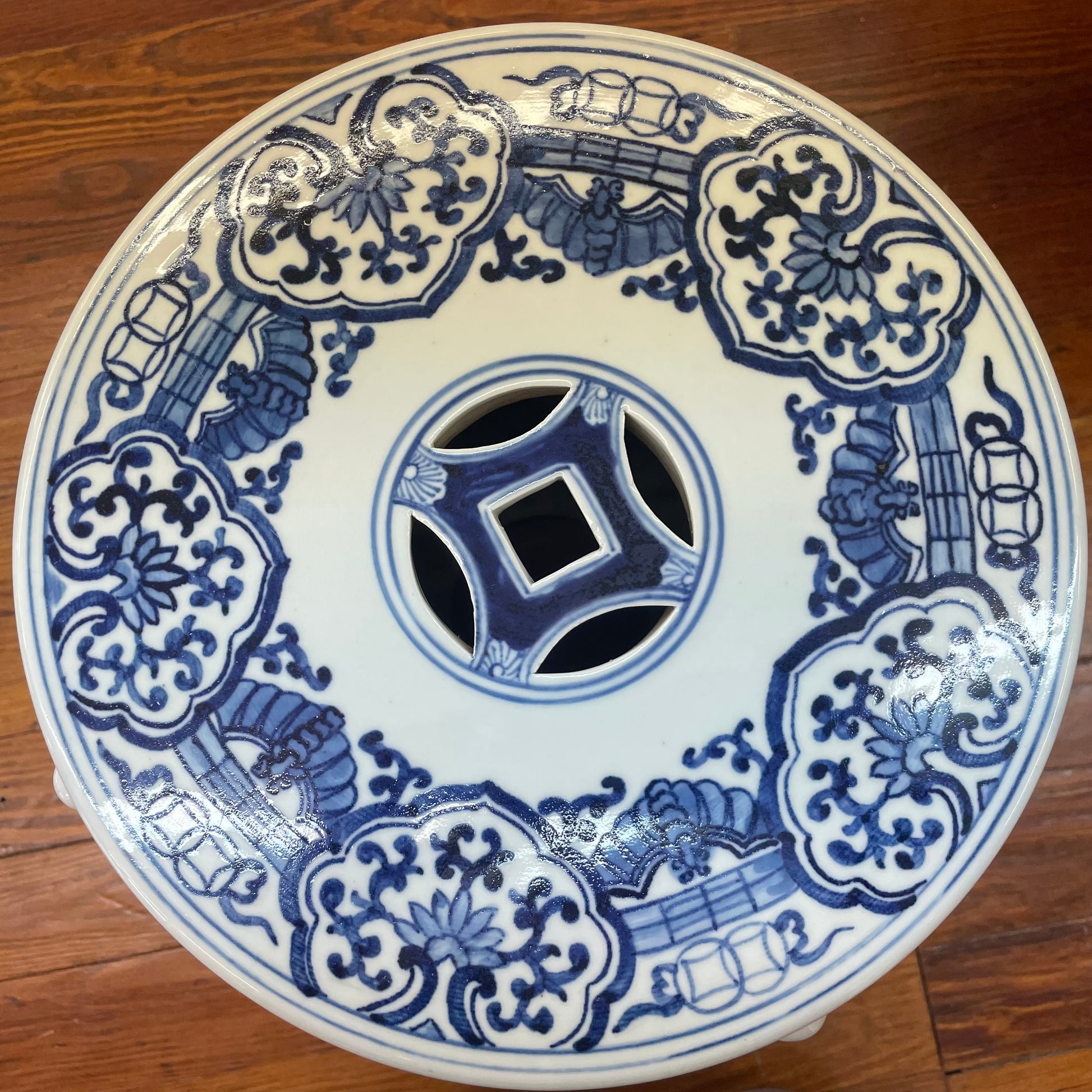 A striking blue and white porcelain garden stool featuring pierced coin medallions and traditional Chinese motifs, including a detailed phoenix and floral patterns. This ceramic stool is both decorative and functional — perfect as a side table, plant stand, or accent piece in any room. A timeless statement for classic interiors or global-inspired spaces.