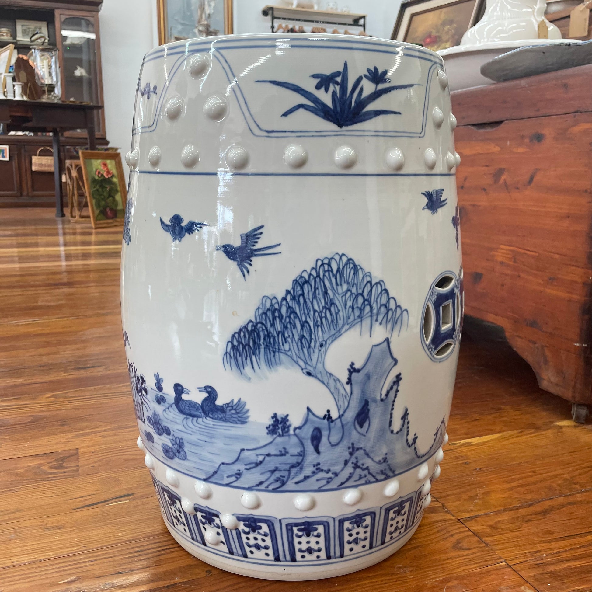 Blue and White Chinese Porcelain Garden Stool with Phoenix Design