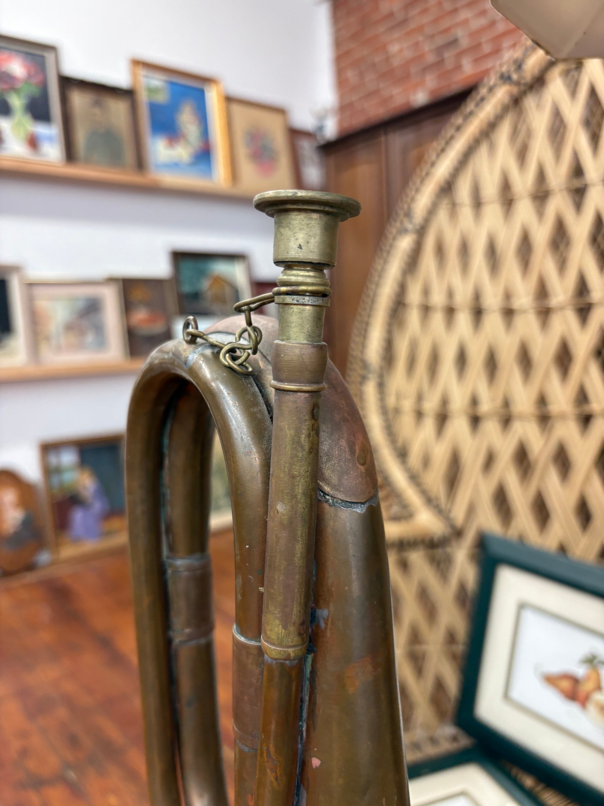 Good WWI field condition. Rich, unpolished patina; scattered shallow dents, solder traces, and spots of verdigris—exactly what collectors expect from a century-old service bugle. Sold as décor, not a tuned instrument.