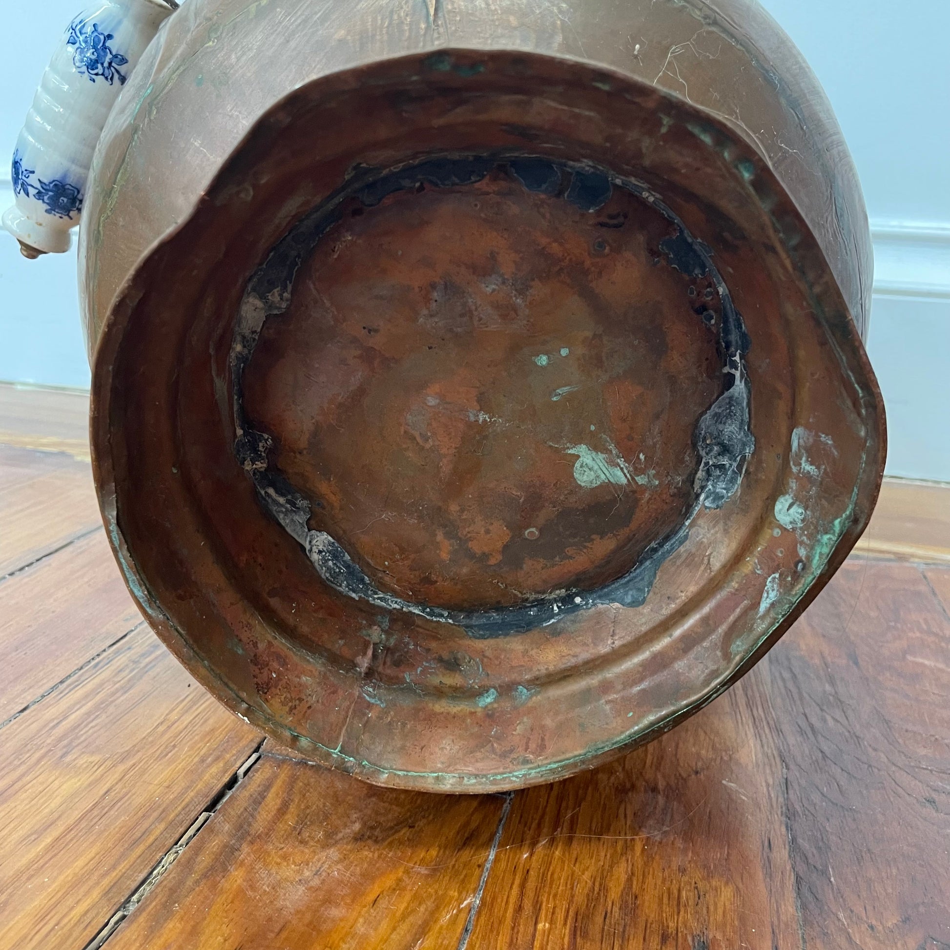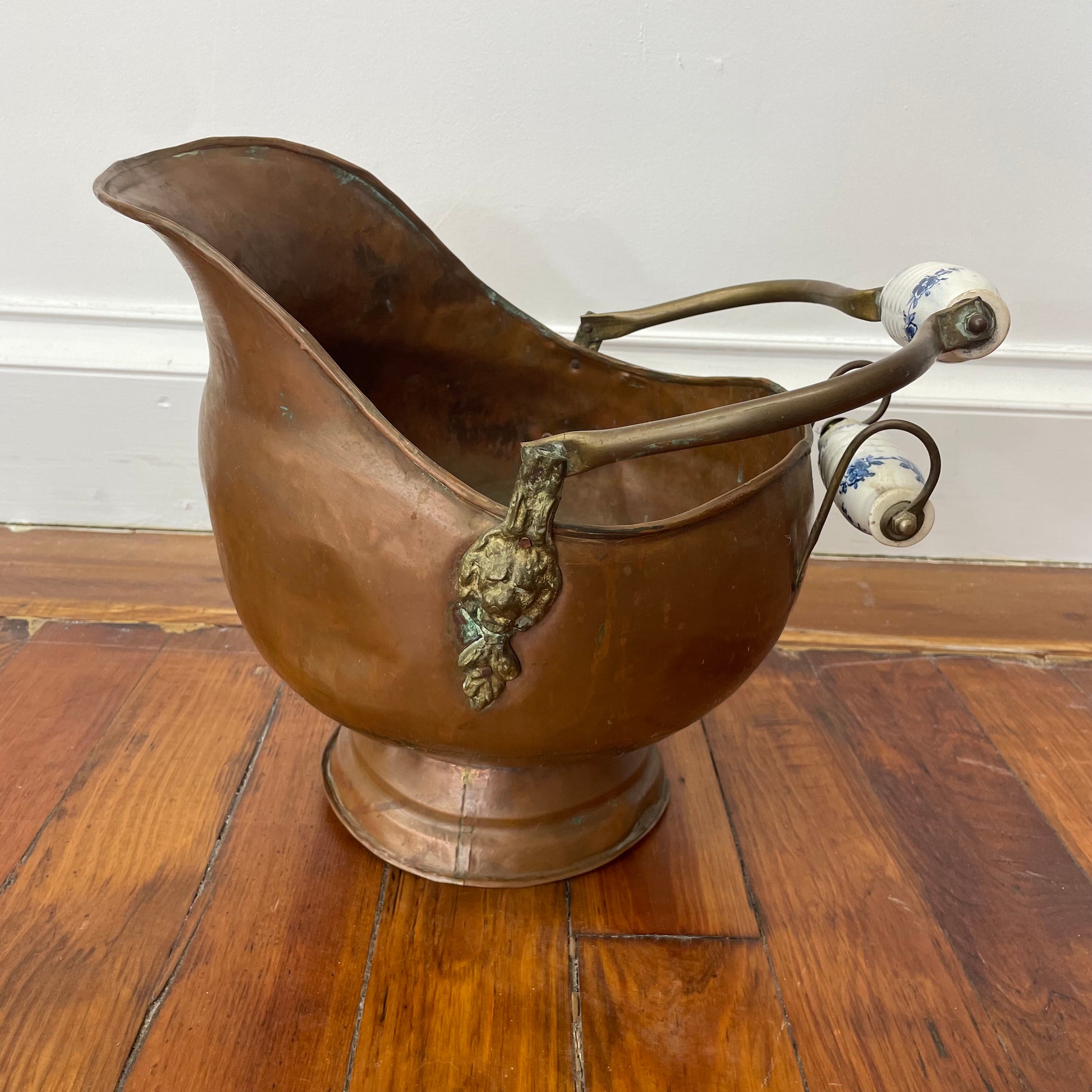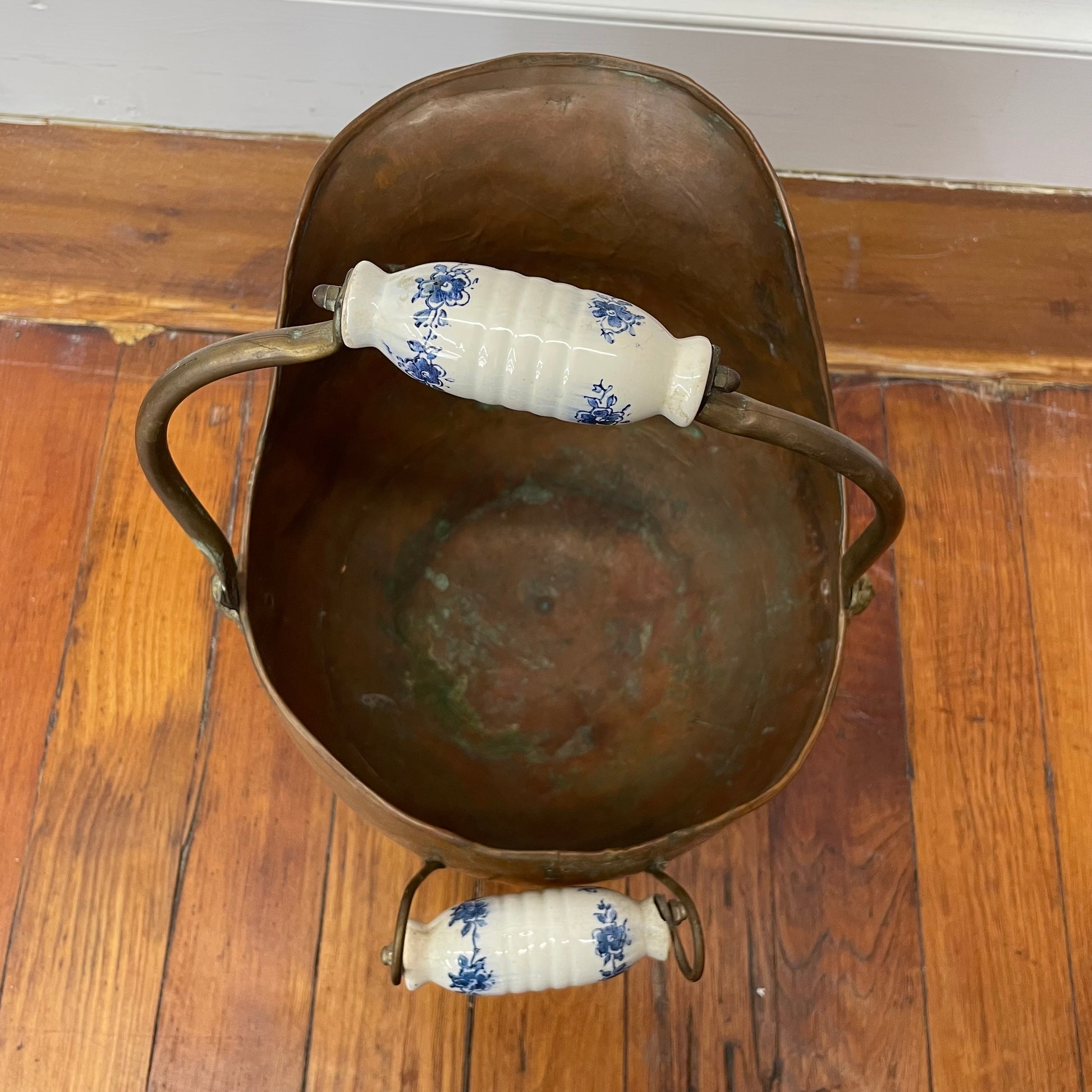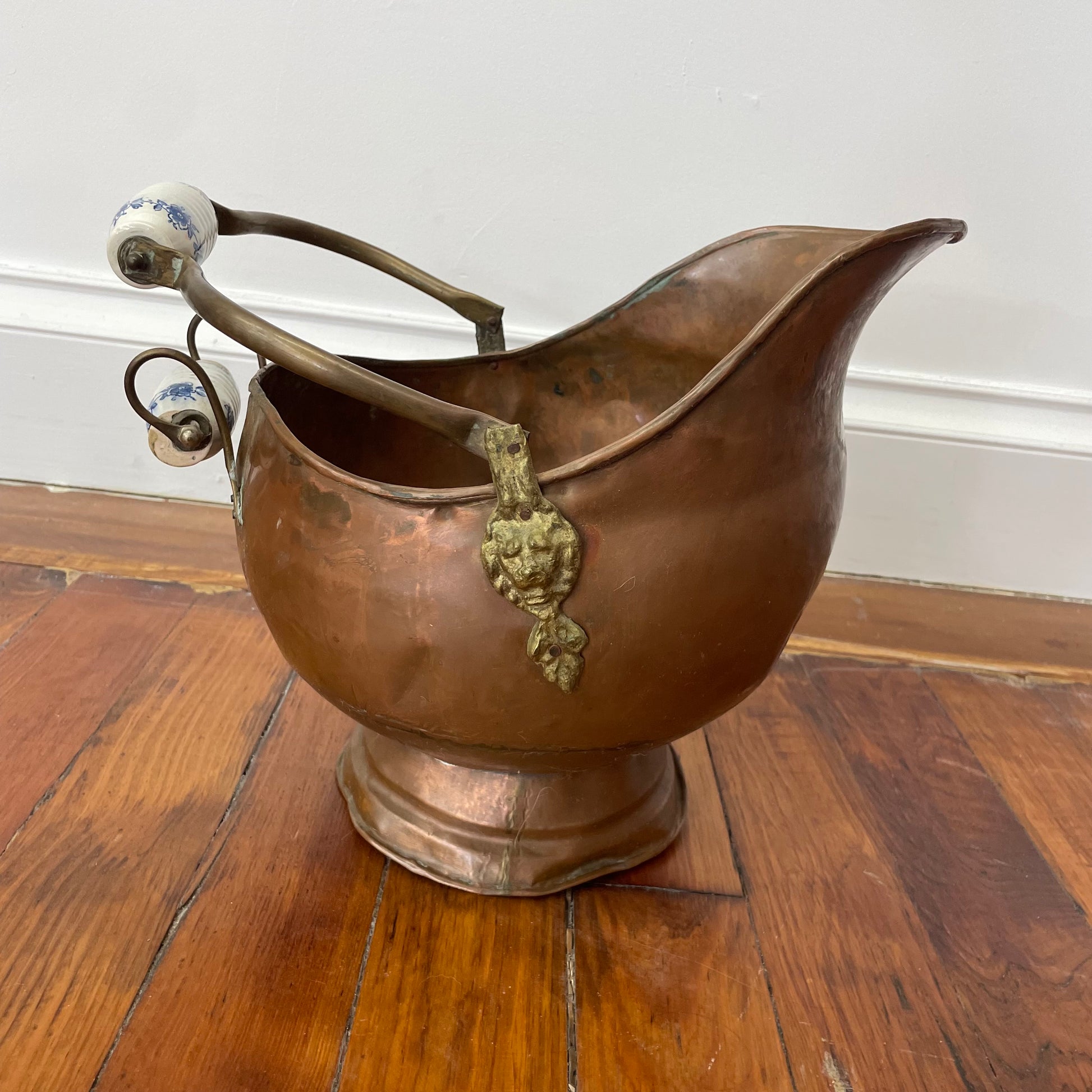 This large antique copper fireplace pitcher is a beautiful blend of utility and Old World charm. Featuring a generous bulbous form, curved spout, and a pivoting handle with blue-and-white ceramic grips, it was traditionally used to carry coal or kindling but now makes a striking decorative accent.
