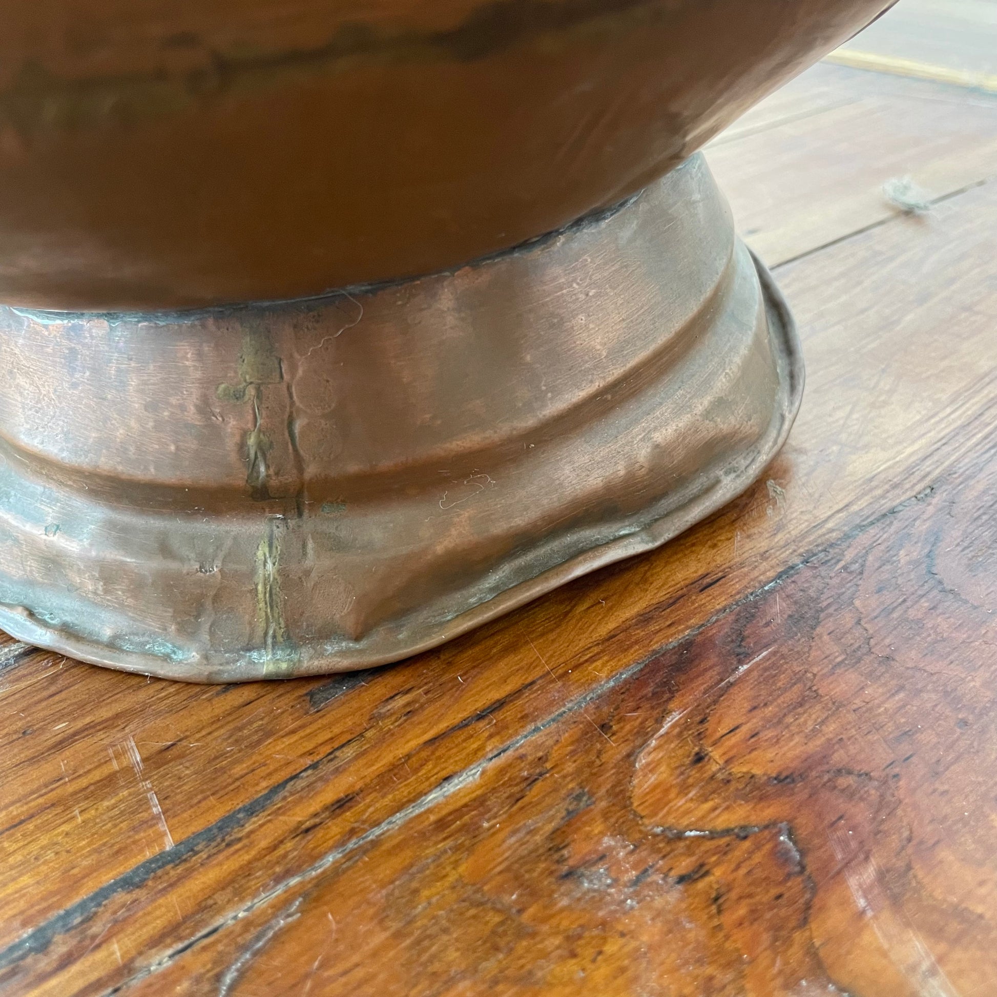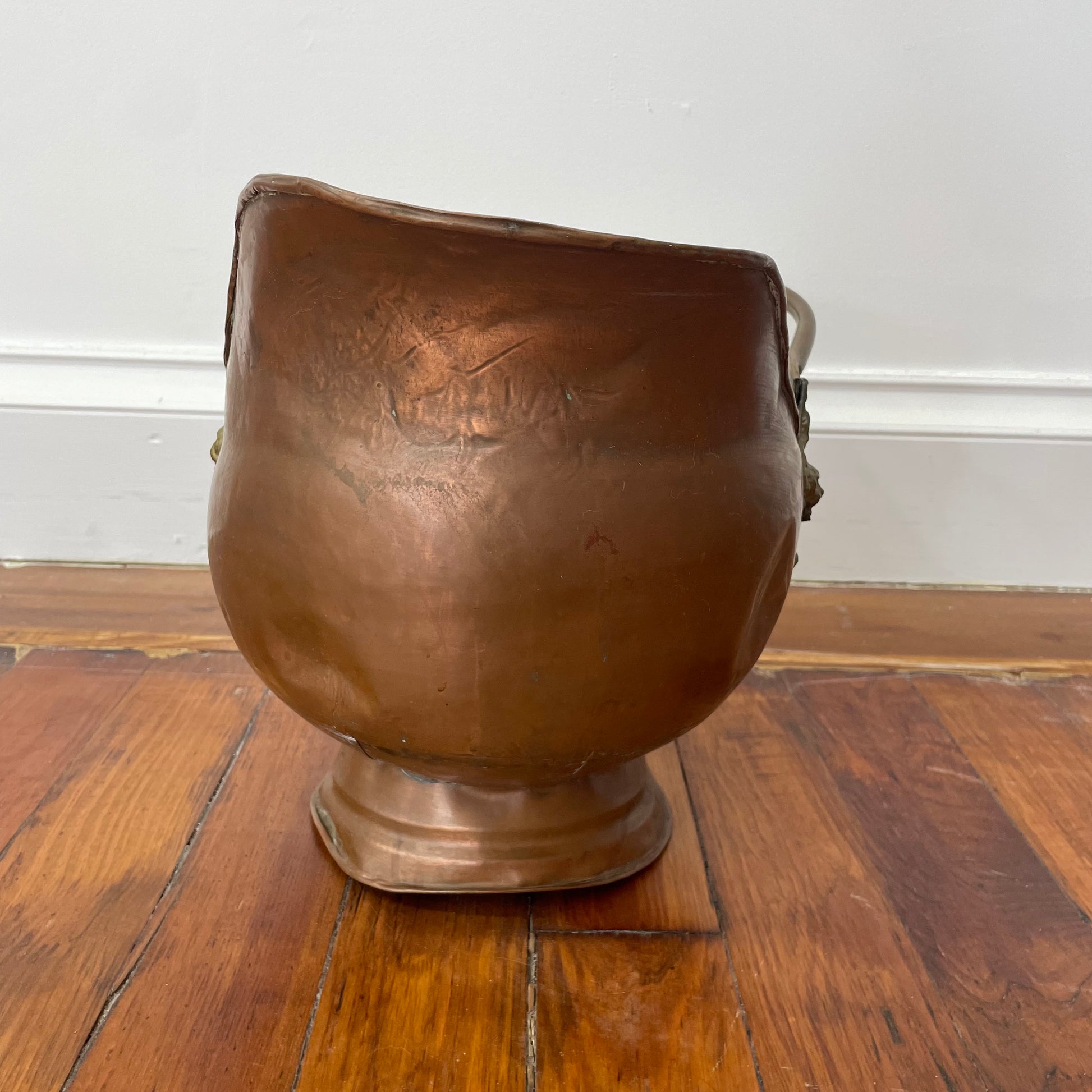 The standout detail is a pair of ornate lion head mounts flanking each side of the pitcher—classical motifs symbolizing strength and craftsmanship. The wear and patina on the copper give this piece warm character and authenticity, making it a perfect accent for hearths, rustic interiors, or vintage vignettes.