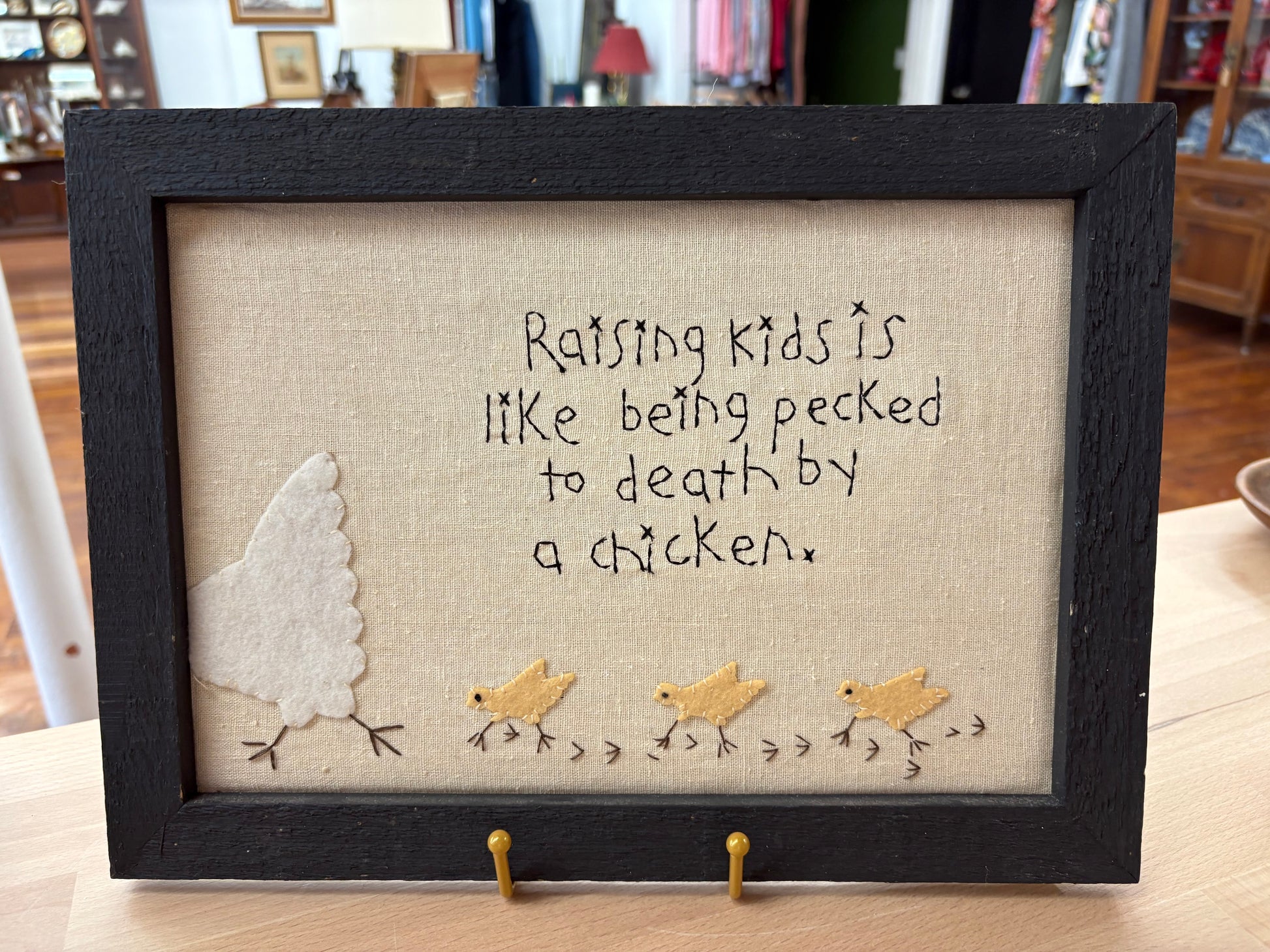 This piece combines hand-stitched black thread text with whimsical felt appliqué—one large white hen and three trailing yellow chicks—all marching across a neutral linen background. Framed in rustic black wood and ready to display, it blends humor, parenting truth, and folk art appeal in one delightful wall accent.