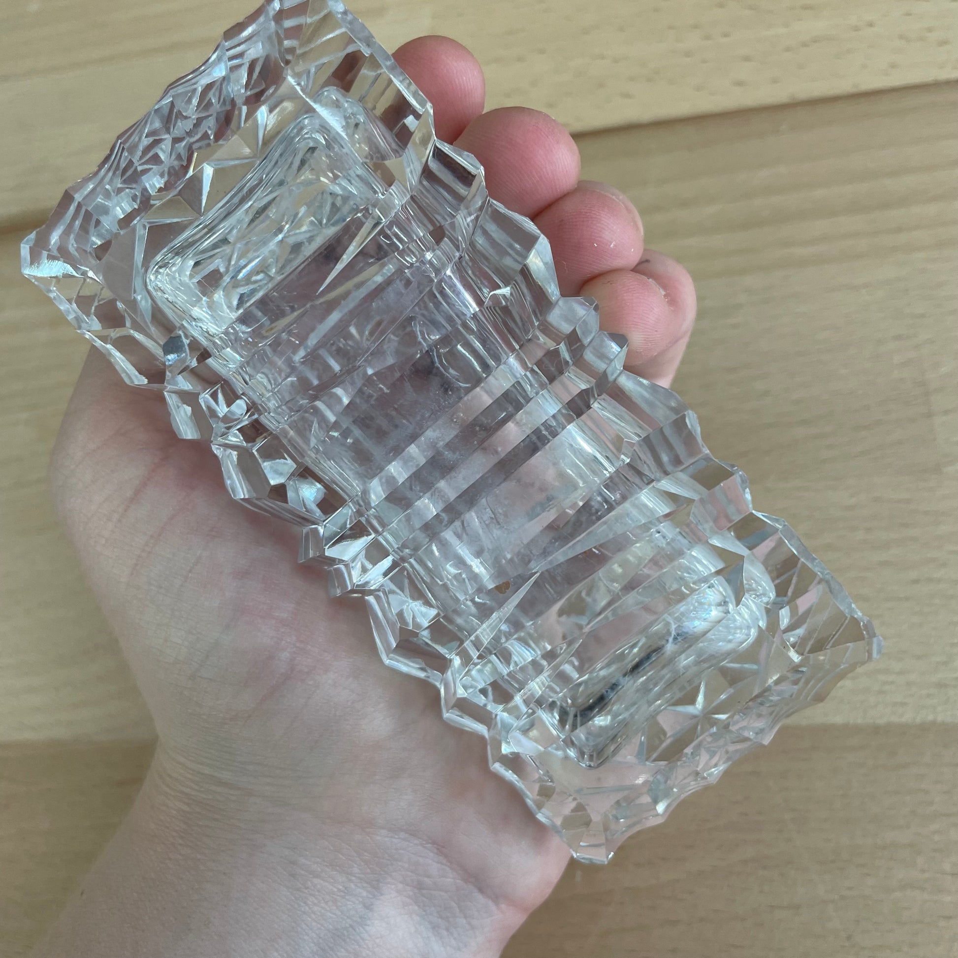 This stunning vintage crystal perfume bottle from Czechoslovakia features a dazzling Art Deco-style geometric design, sharp cut facets, and a show-stopping vertical stopper. The intricate craftsmanship makes it a standout vanity display piece or a thoughtful gift for a collector.