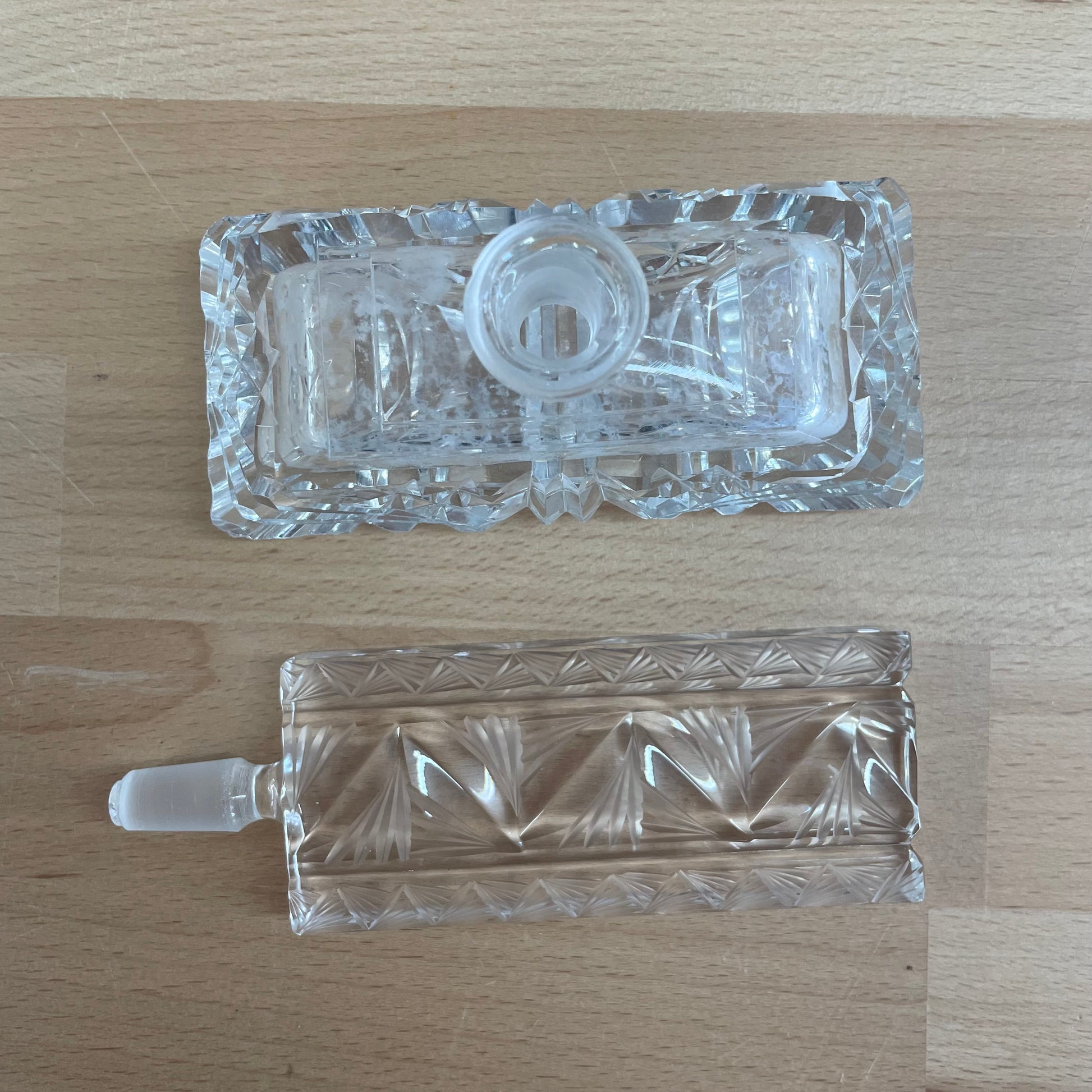 Crafted from clear leaded crystal, the bottle boasts an ornate pressed base and a snug-fitting stopper with etched fan and triangle detailing that reflects light beautifully. Whether used to hold a signature fragrance or displayed empty, this piece evokes timeless elegance.