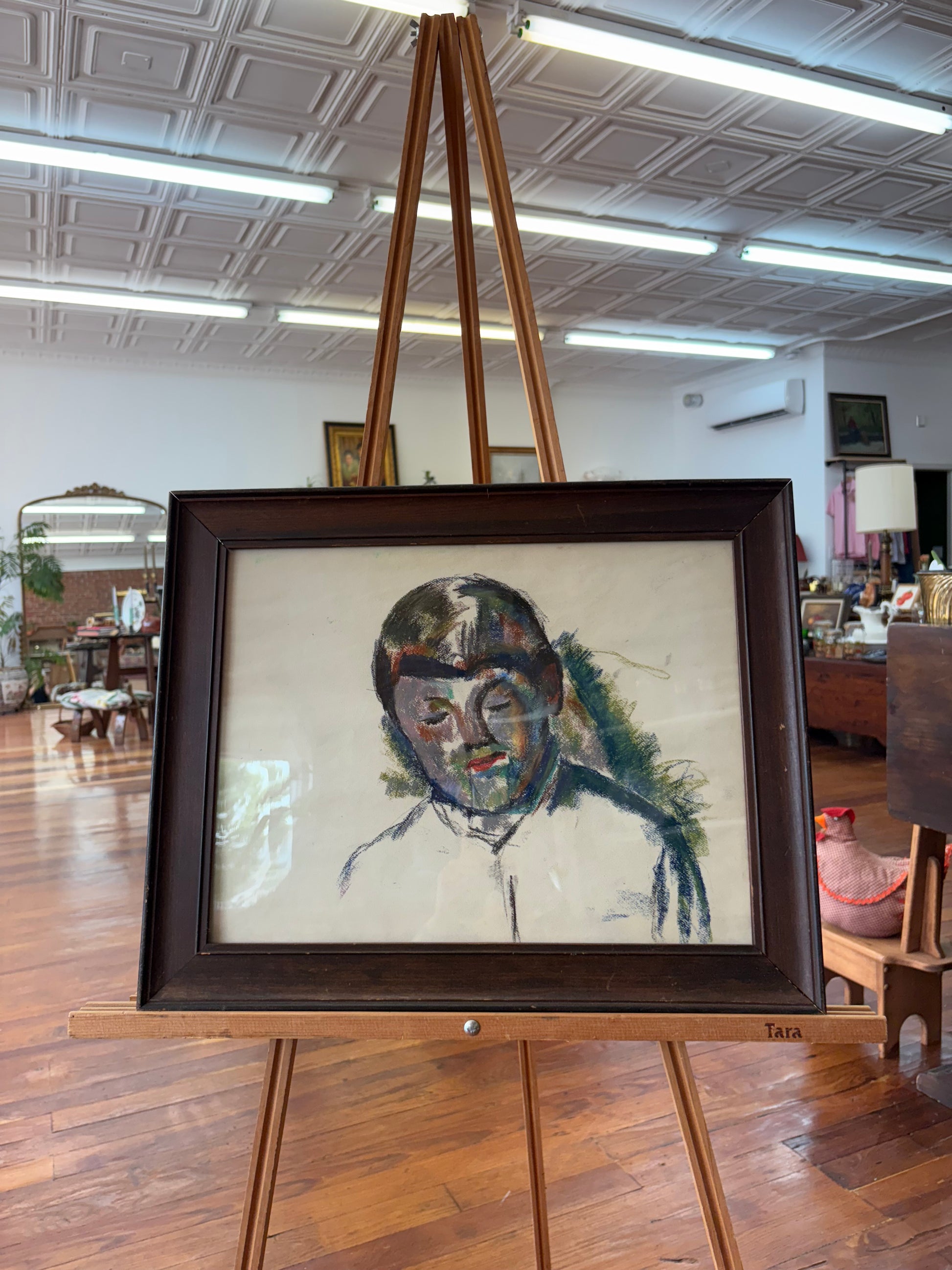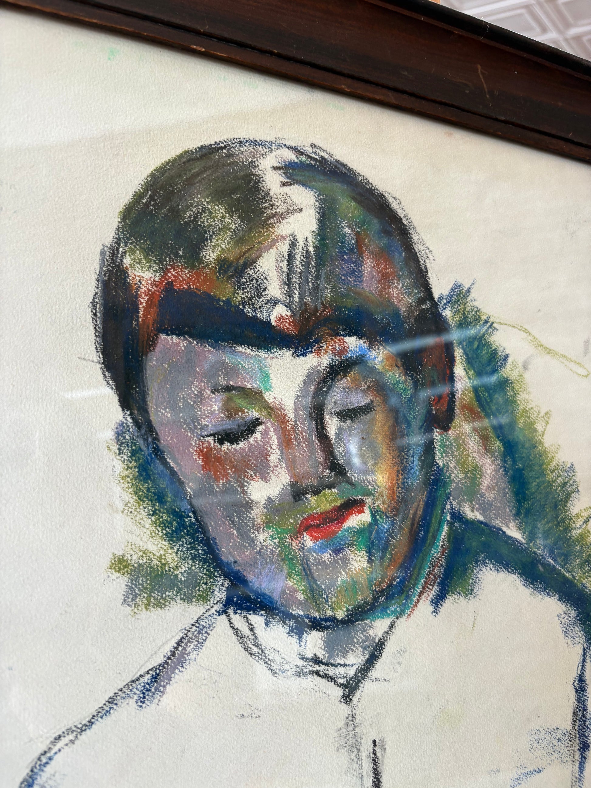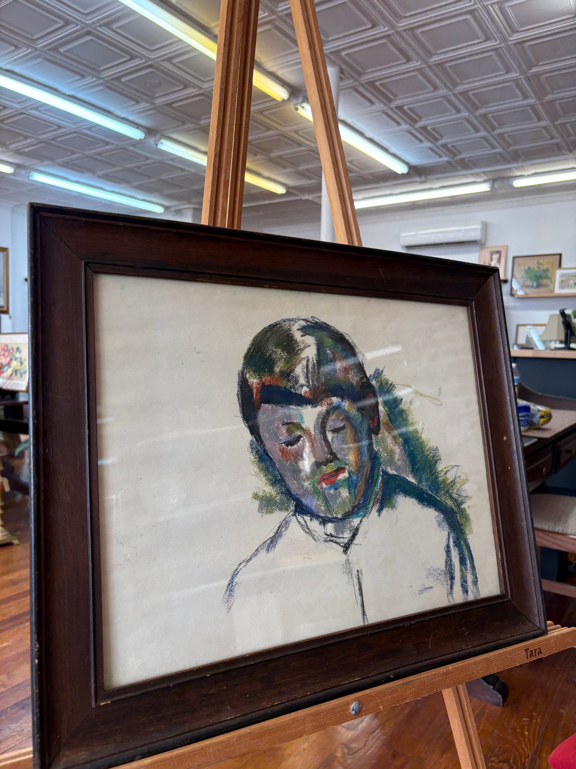 American artist Lyn Fisher re-imagines Paul Cézanne’s 1882 portrait “L’Artiste, Son fils” in this vivid mid-century pastel on paper. Blocks of cobalt, emerald, and sienna describe the sitter’s contemplative face, while rapid charcoal outlines keep the composition rooted in drawing. The work is signed lower right and dated verso, then matted and housed behind glass in a dark walnut-stained frame that echoes the moody palette.