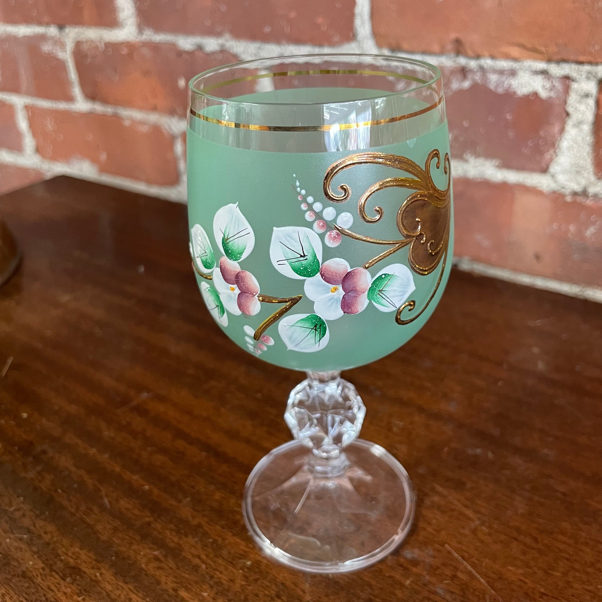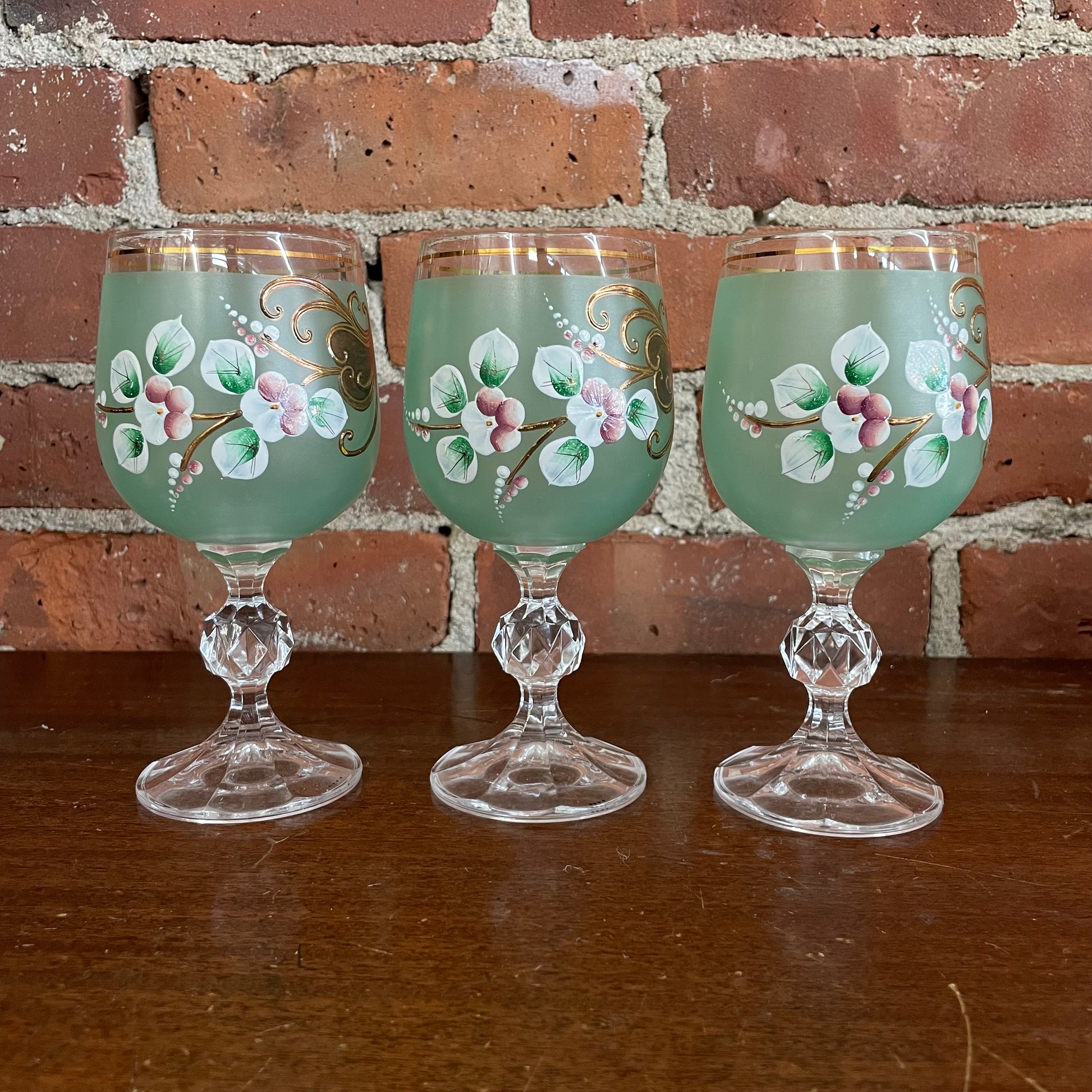 This stunning vintage drinkware set from Bohemia, Czech Republic includes a tall glass pitcher and three matching goblets, all beautifully hand painted with delicate florals, leafy vines, and gold scrollwork over soft matte green glass. A clear example of classic Czech craftsmanship, this set brings both artistry and functionality to your vintage barware or holiday table.