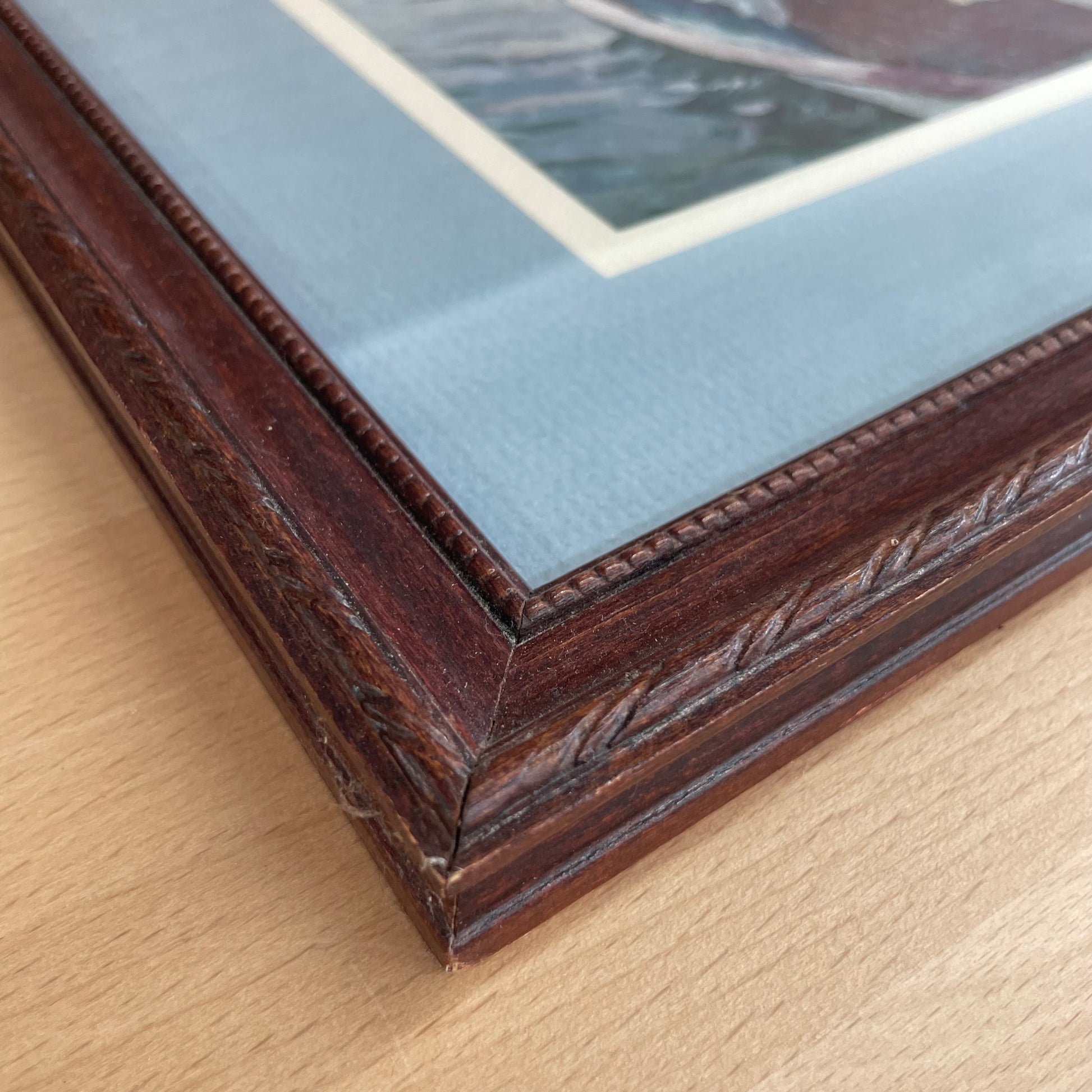 Beveled blue matte board, warm reddish-brown wood frame with carved leaf detail