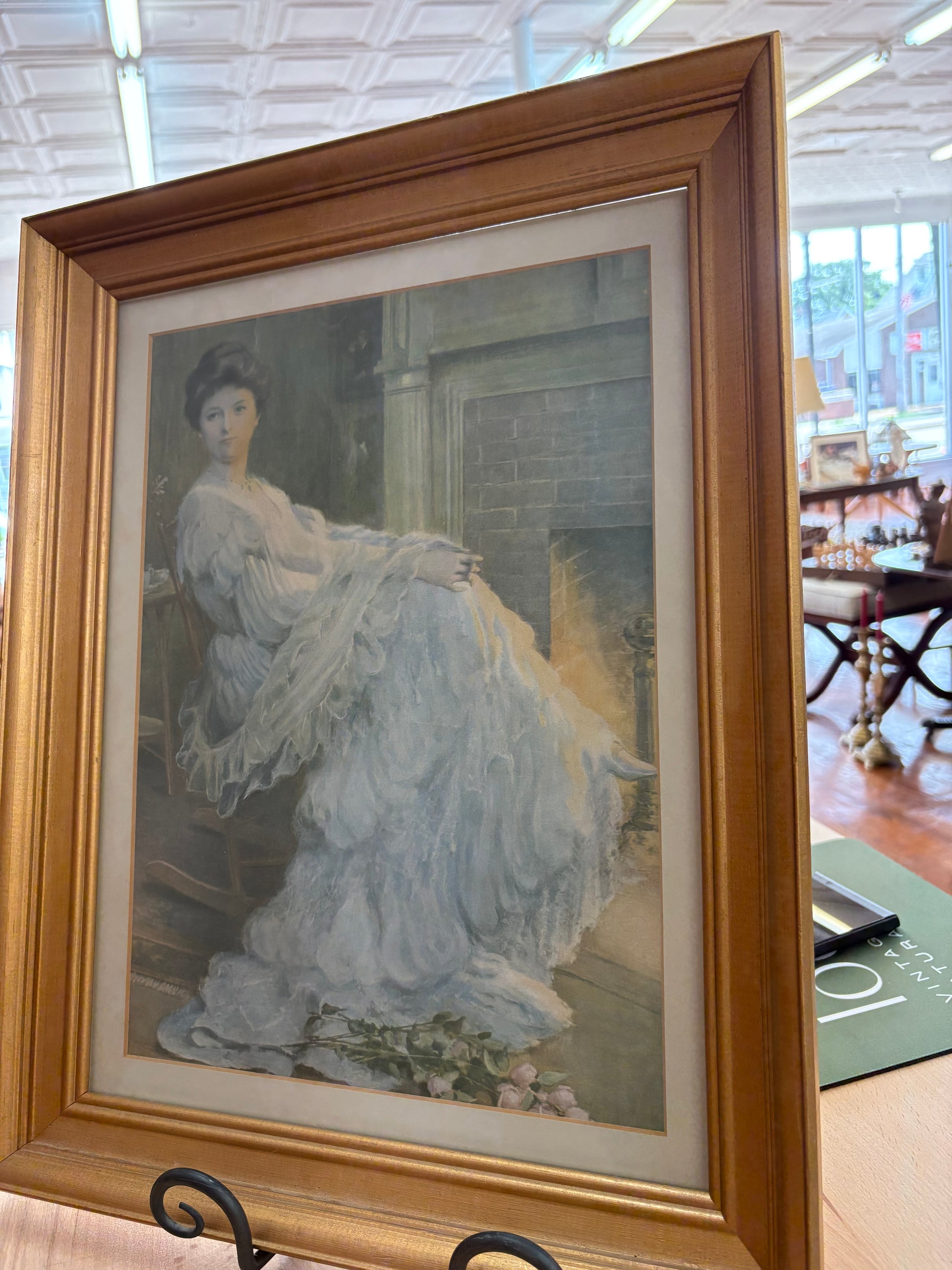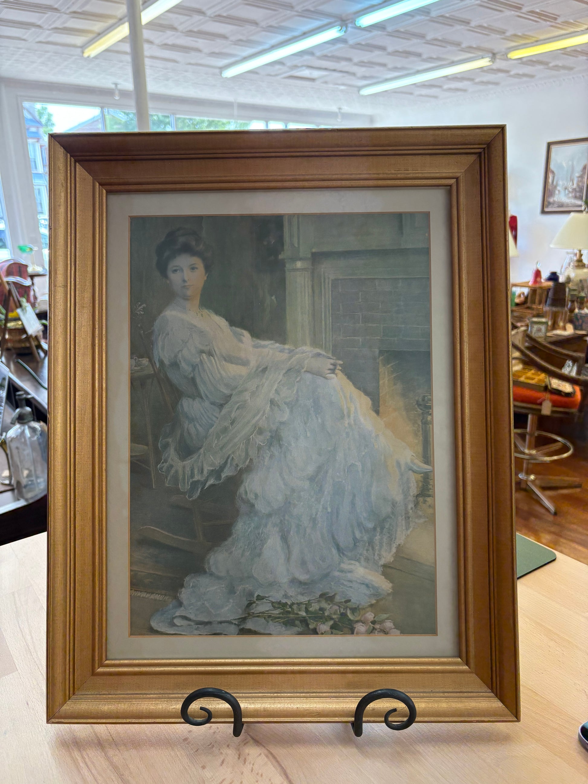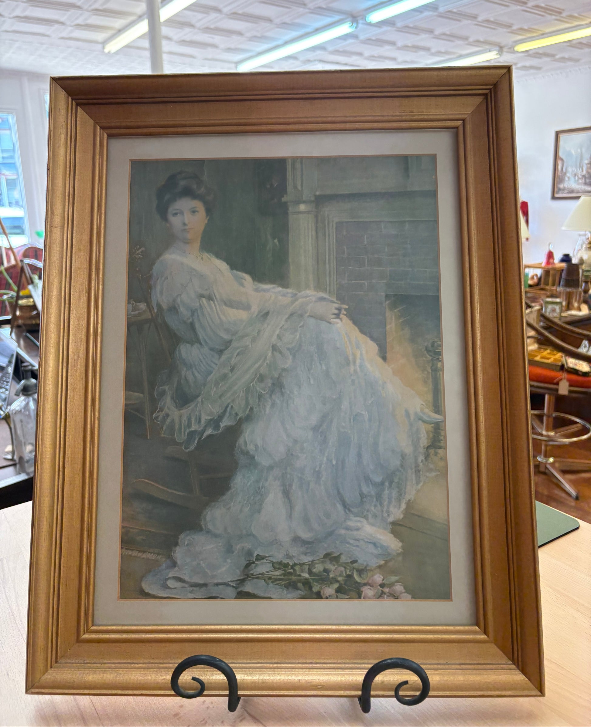 An ethereal Edwardian beauty lounges beside a crackling fireplace, her frothy white gown catching the fire-light in soft blue-grey shadows. This finely rendered vintage art print evokes the genteel portraiture of John Singer Sargent and Lawrence Alma-Tadema, delivering instant period romance to any room. A muted taupe mat and classic antique-gold frame complete the look, making the piece ready to hang above a mantel, vanity, or guest-room reading chair.