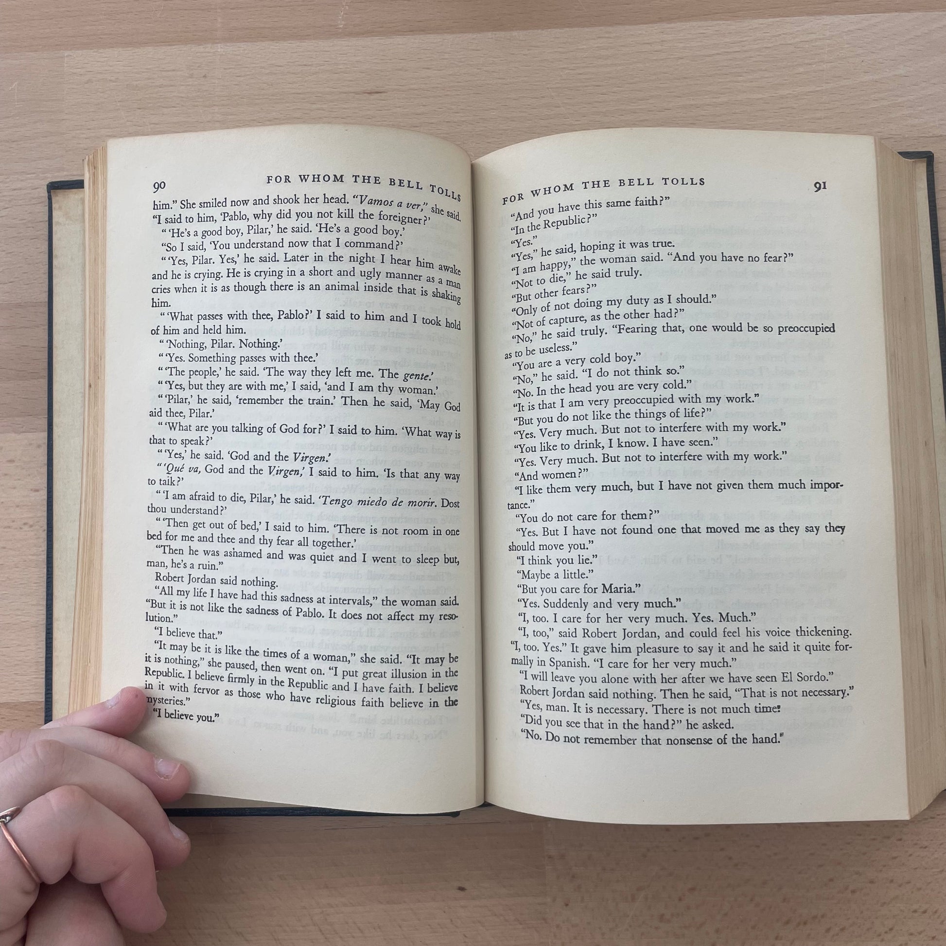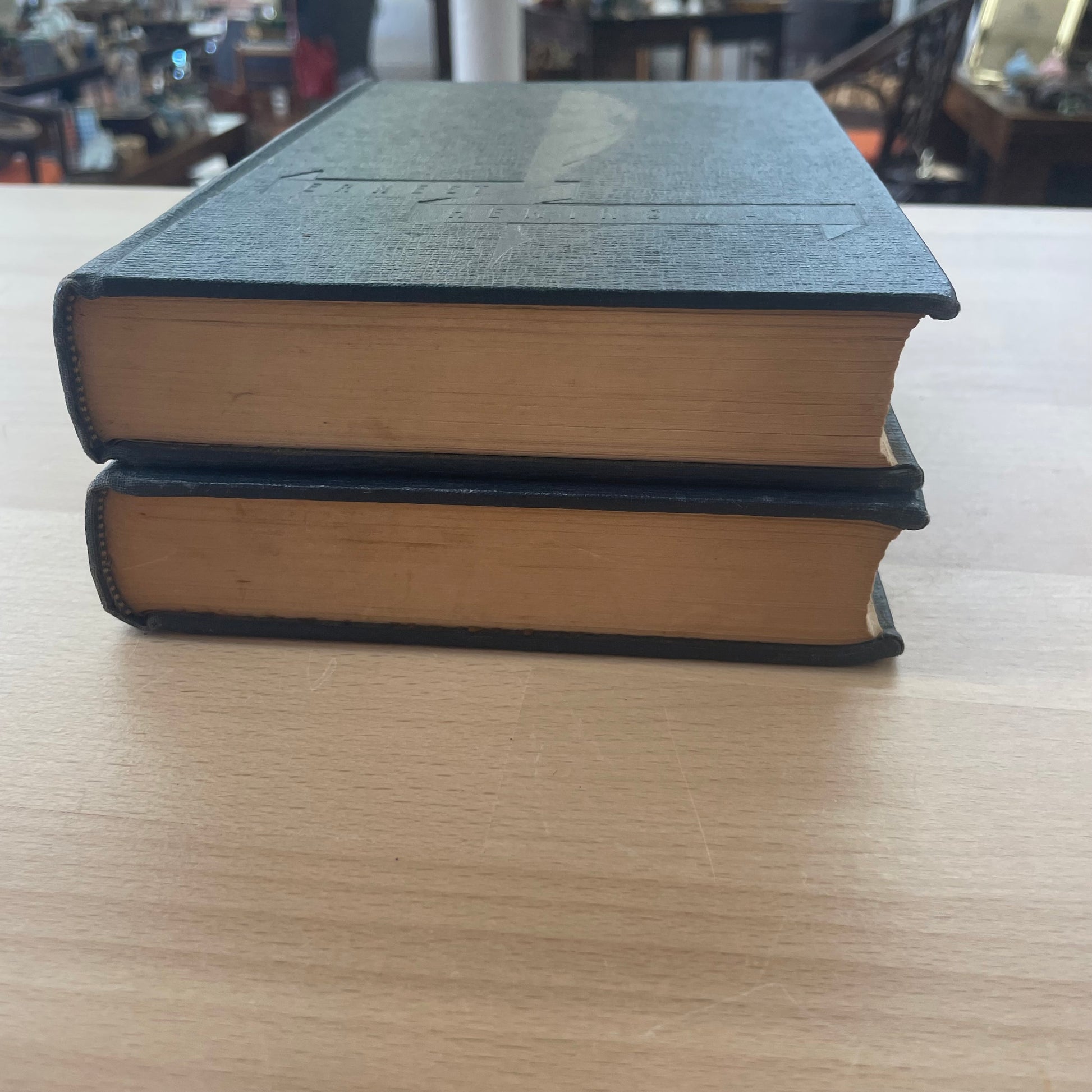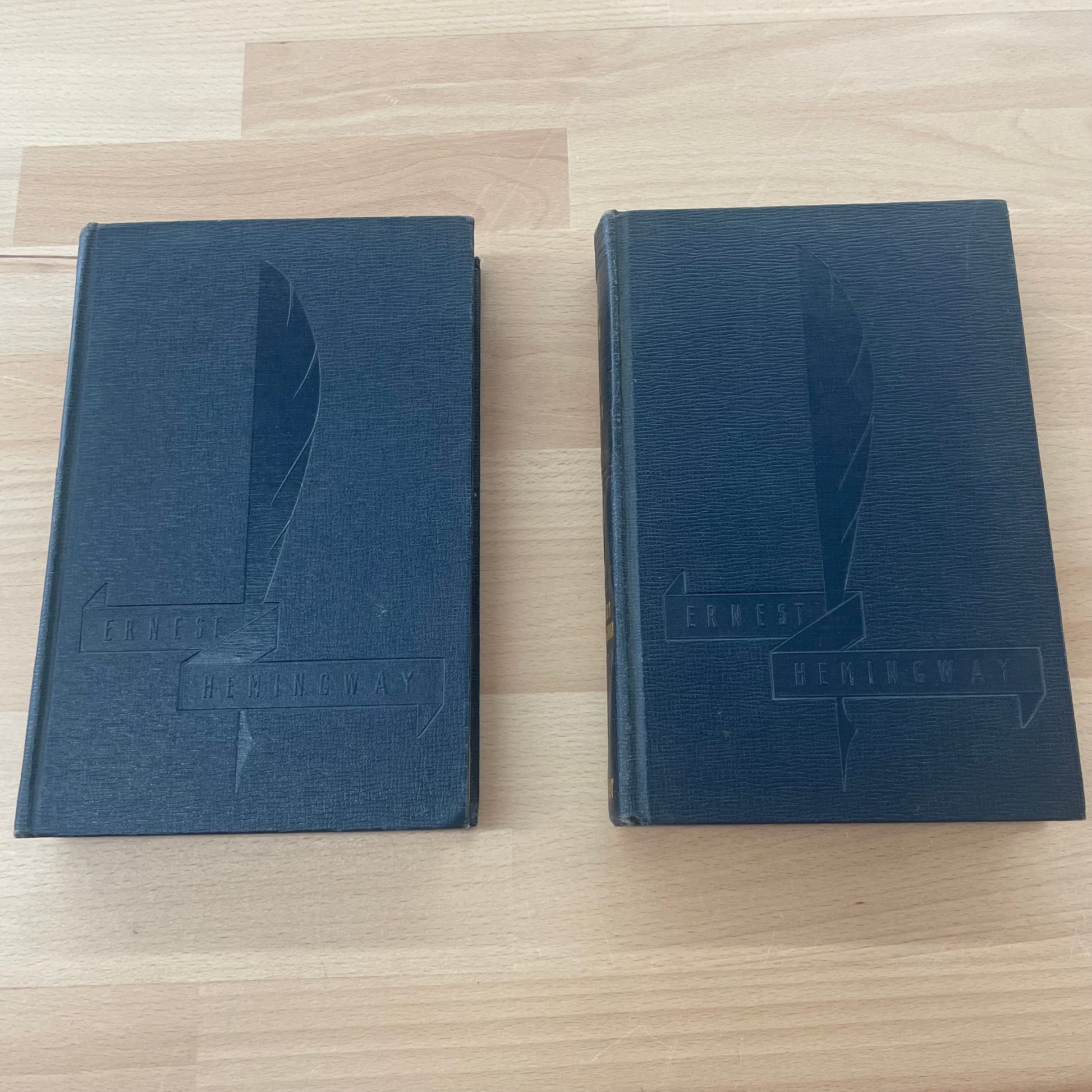 Two of Hemingway’s greatest works in matching mid-century hardcovers, published by Collier. This handsome set features dark navy cloth boards embossed with a quill design and gold-stamped spine titles. A clean and collectible pairing for any literary shelf.