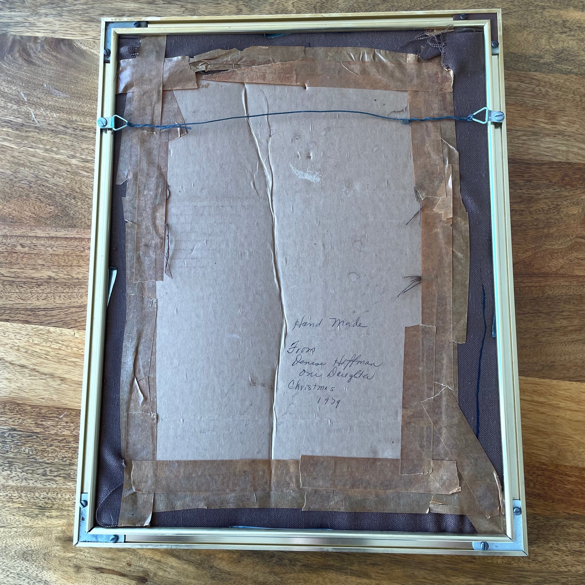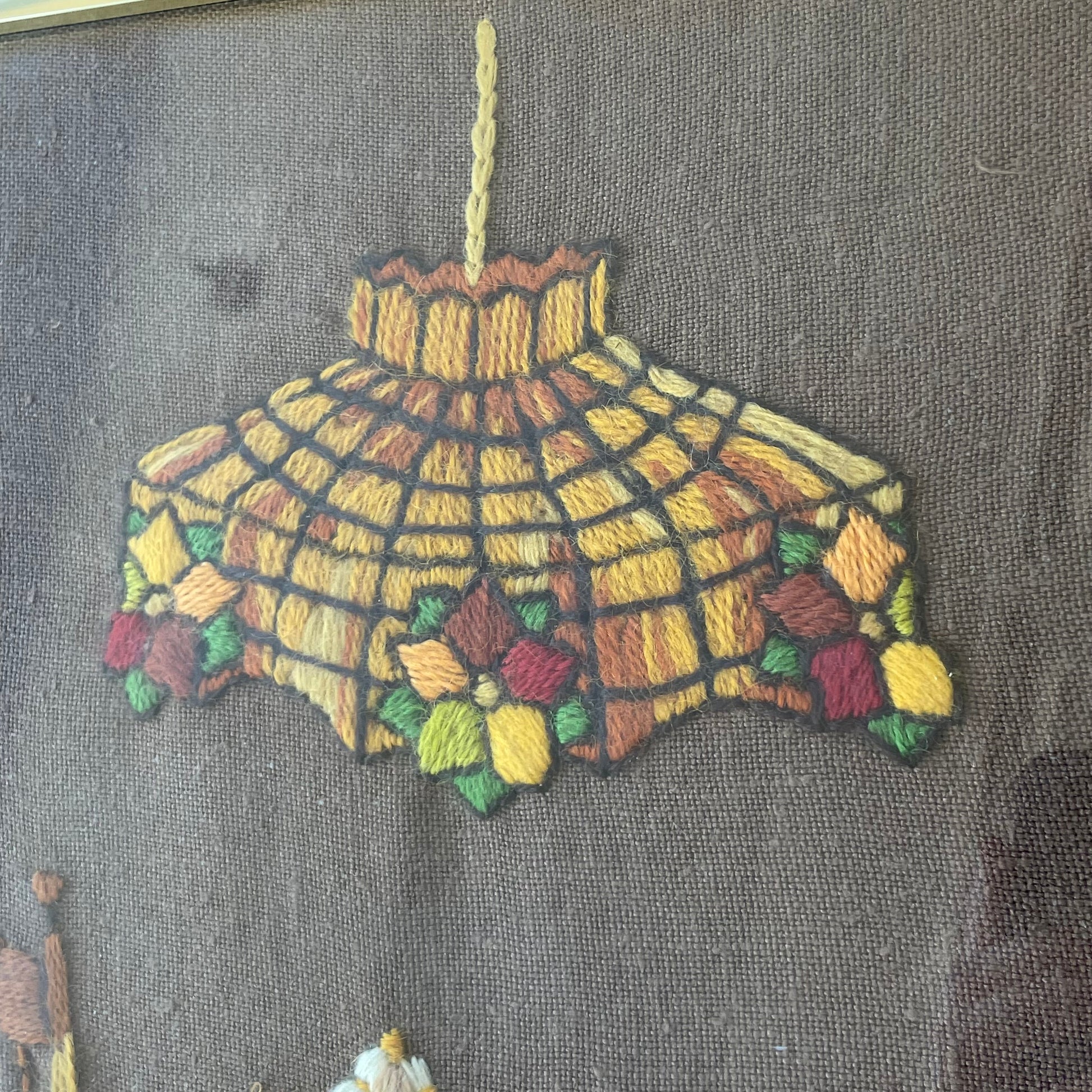 A charming vintage still life needlepoint featuring a richly detailed tea table, fringed tablecloth, classic Tiffany-style stained glass lamp, and a curious black cat. The warm tones and textured stitching bring this cozy scene to life. Framed in a slim gold-tone metal frame, this crewel work piece adds a nostalgic and whimsical touch to any wall.