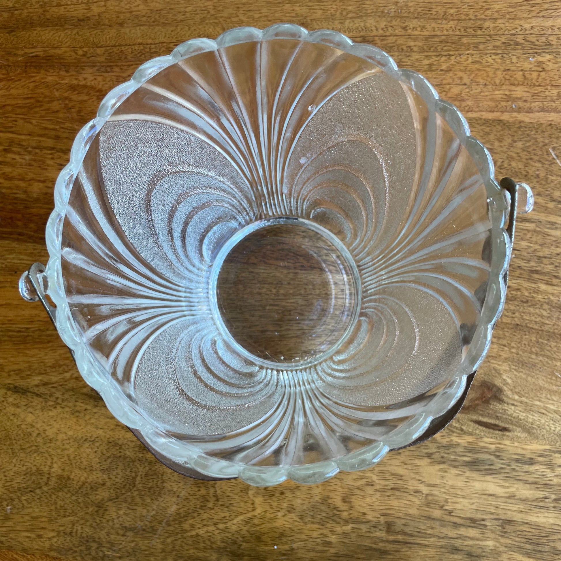 This vintage pressed glass ice bucket brings both elegance and utility to your home bar. Featuring a fluted panel design, a gently scalloped rim, and a rustic hammered metal swing handle, it’s a timeless piece perfect for hosting. Includes a pair of silver-toned tongs that tuck neatly inside.