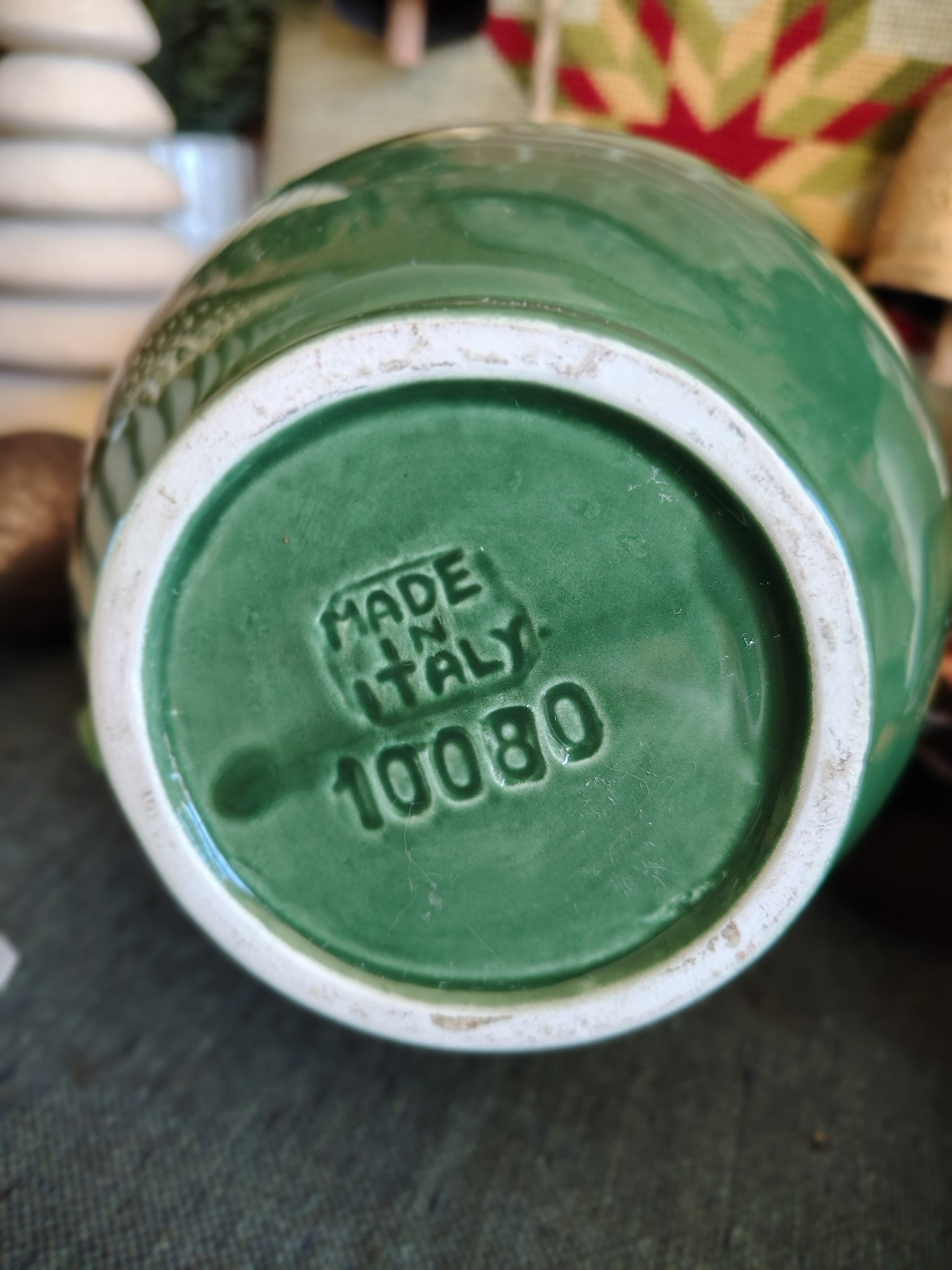 A festive vintage Italian ceramic pitcher featuring raised holly leaves and berries in a rich emerald-green glaze. The curving silhouette and braided handle add texture and charm, making this a perfect holiday serving piece or decorative vase. Stamped Made in Italy 10080 on the base, it reflects classic mid-century Italian craftsmanship and timeless Christmas design.