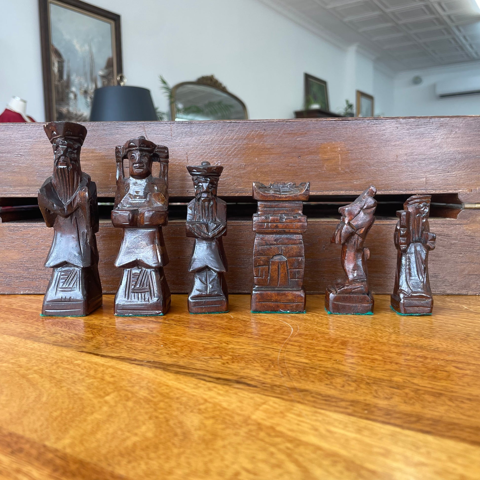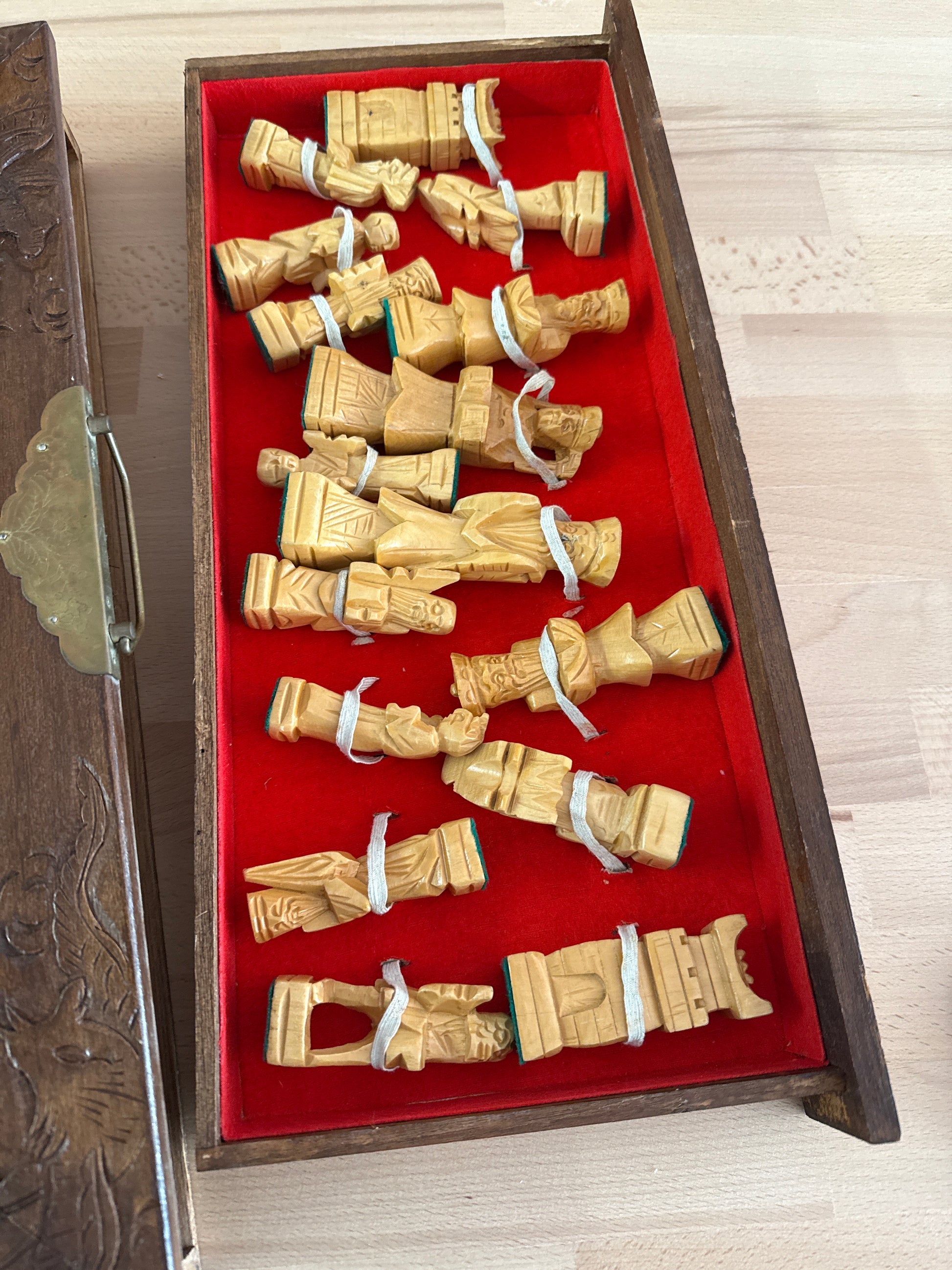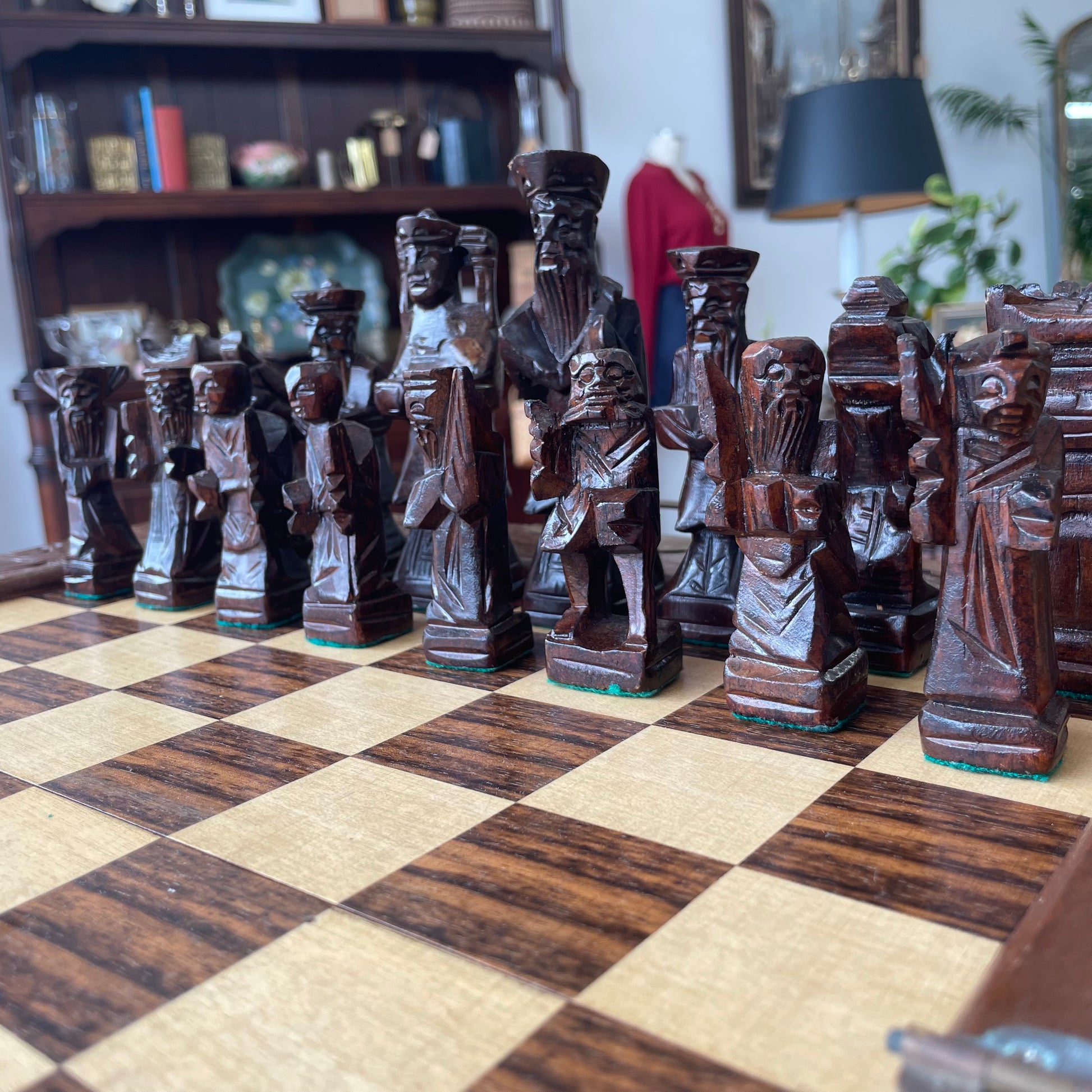 This impressive hand-carved wooden chess set pairs an 18-inch folding board with two felt-lined storage drawers and a full army of sculptural pieces in contrasting woods. Each side is rendered in a stylized Asian court motif: light figures carved from pale boxwood and dark figures from richly stained hardwood, all squared on tiered plinths. The hinged frame is embellished with low-relief foliate carving, while side-mounted brass handles and corner hinges hint at campaign furniture influences.