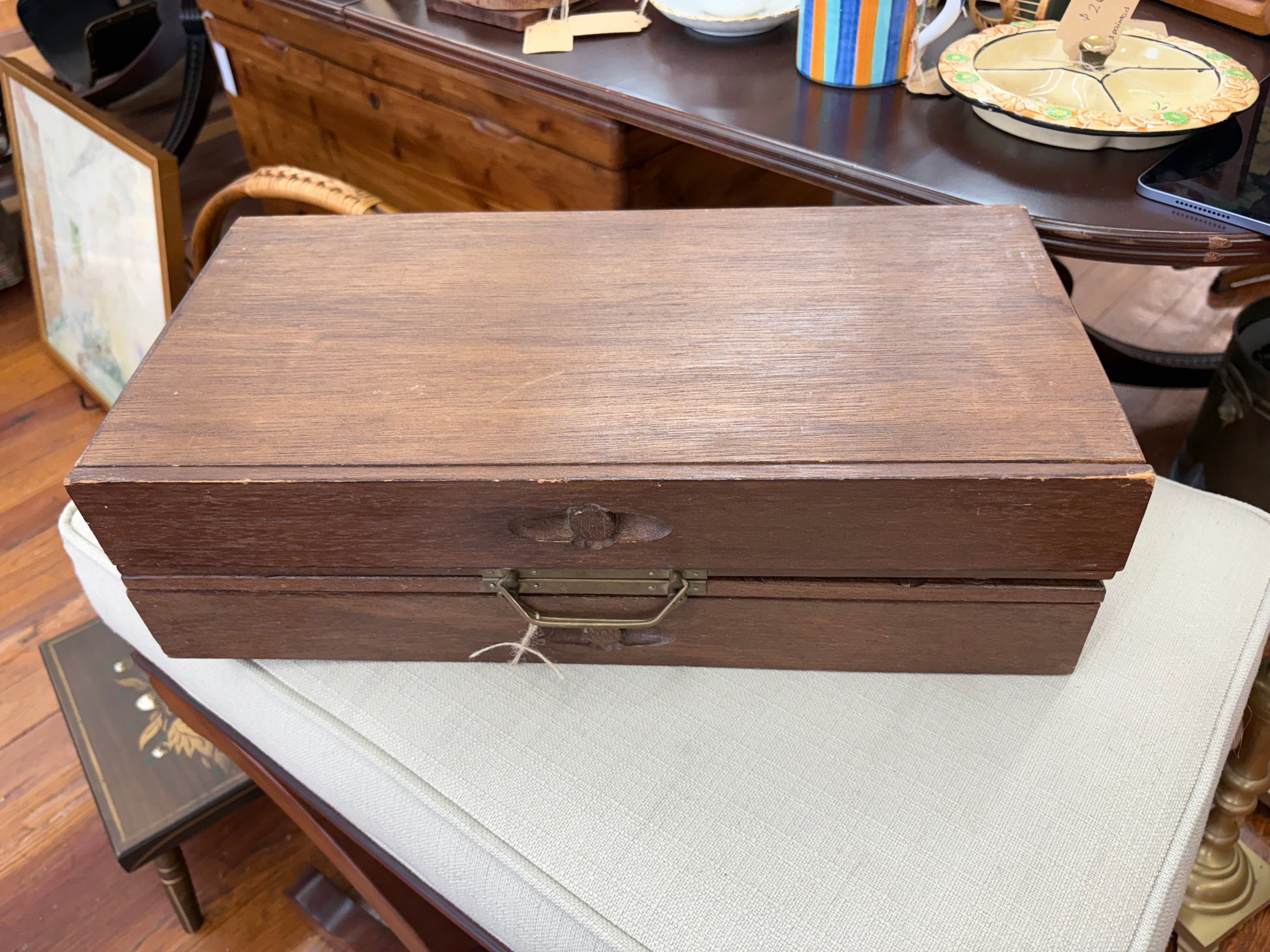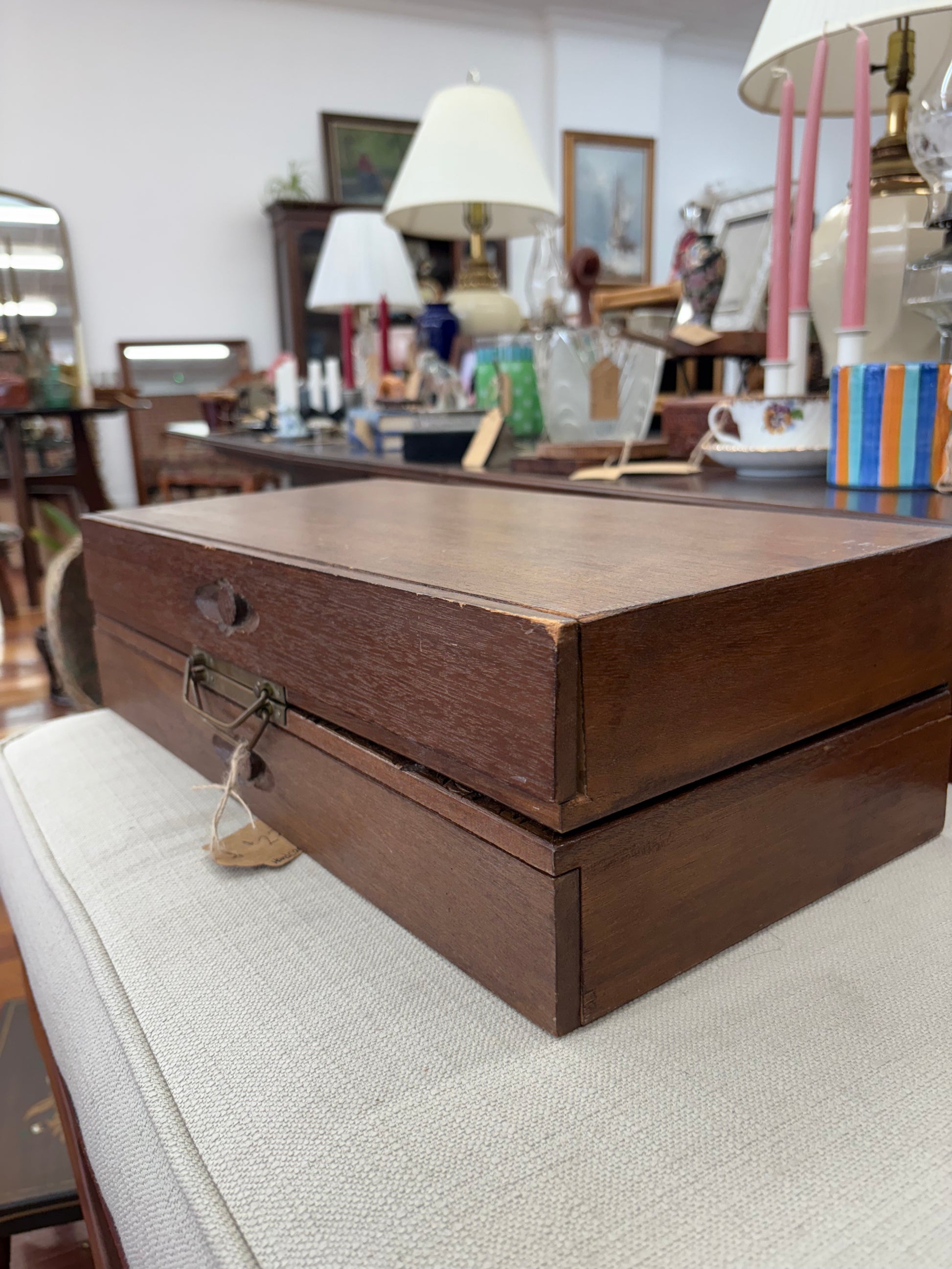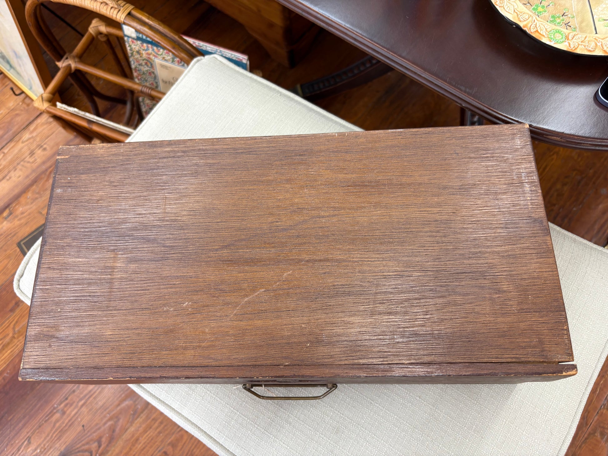 Very good vintage condition. All pieces present; no breaks. Board finish shows light edge scuffs and minor patina to brass—nothing that distracts. Drawers slide smoothly; hinges sound.