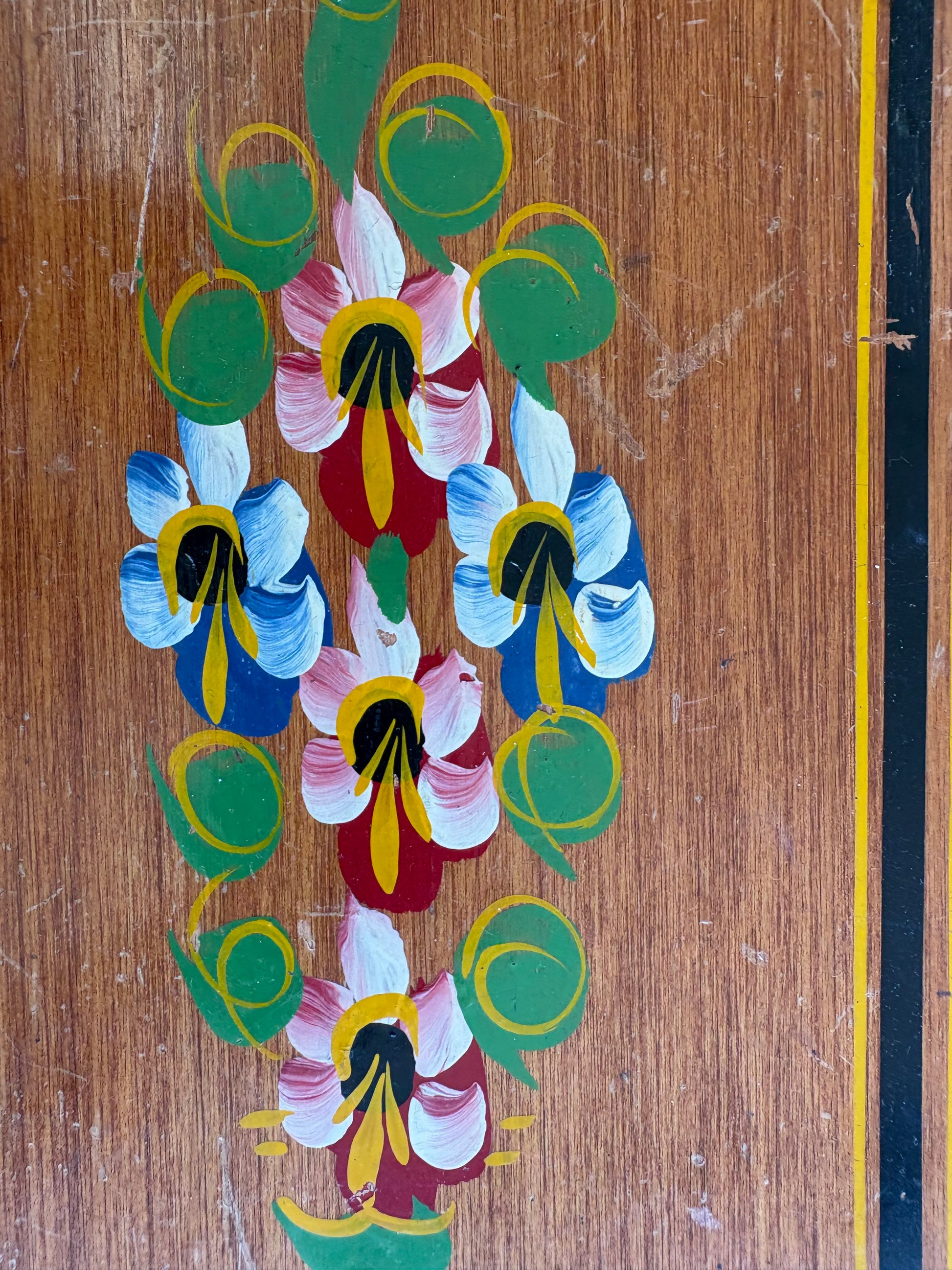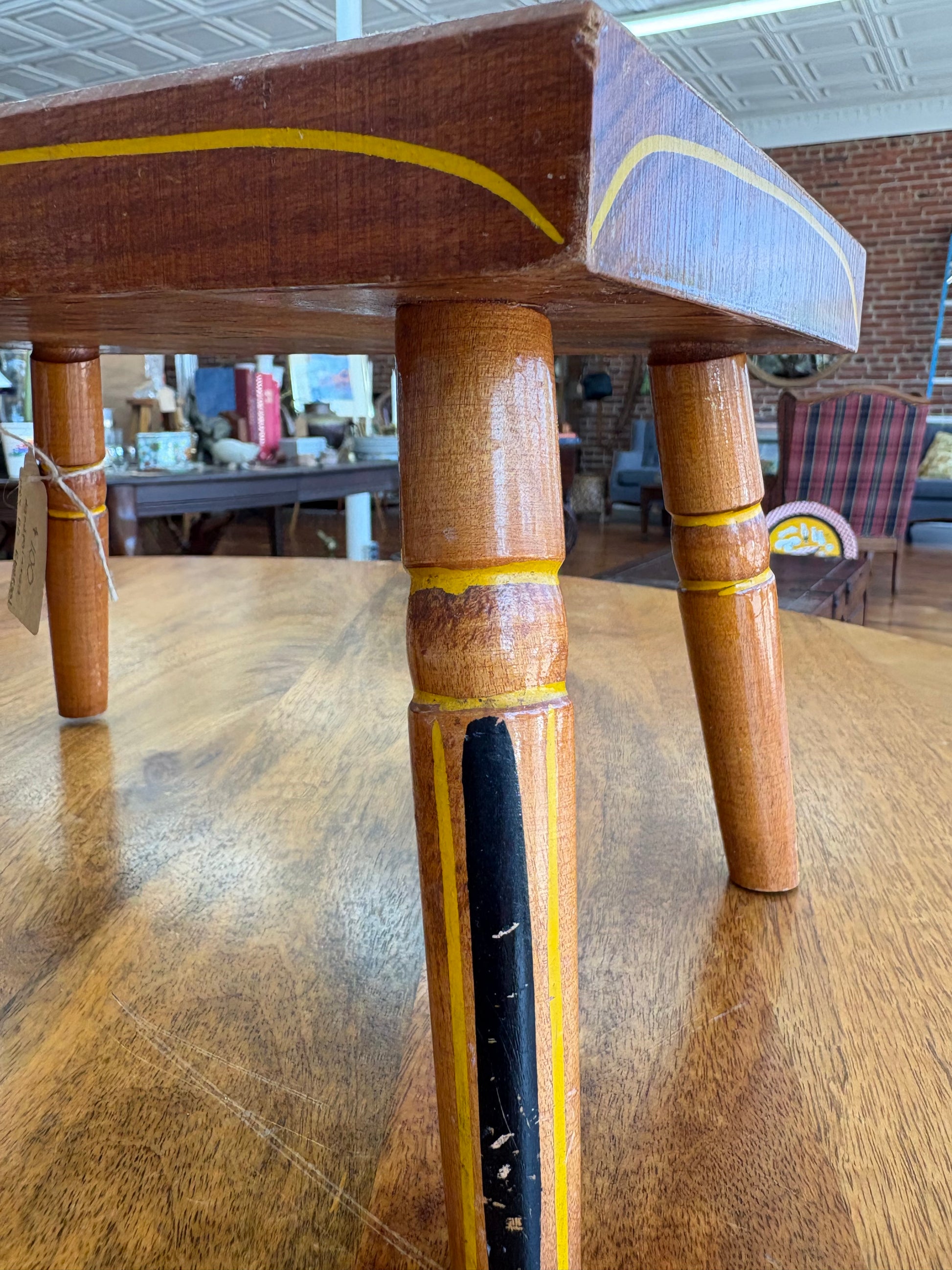 Signed J.S. Ebersol ’66, this petite Pennsylvania footstool captures mid-century Amish folk-art charm. The maple top is hand-painted with a joyful spray of tulips, greens, and sunshine-yellow swirls—motifs reminiscent of Pennsylvania-Dutch hex signs—then framed by black and ochre pin-striping that continues down each turned leg. Sturdy mortise-and-tenon joinery lets the stool moonlight as a plant stand, low side table, or whimsical riser on kitchen counters.