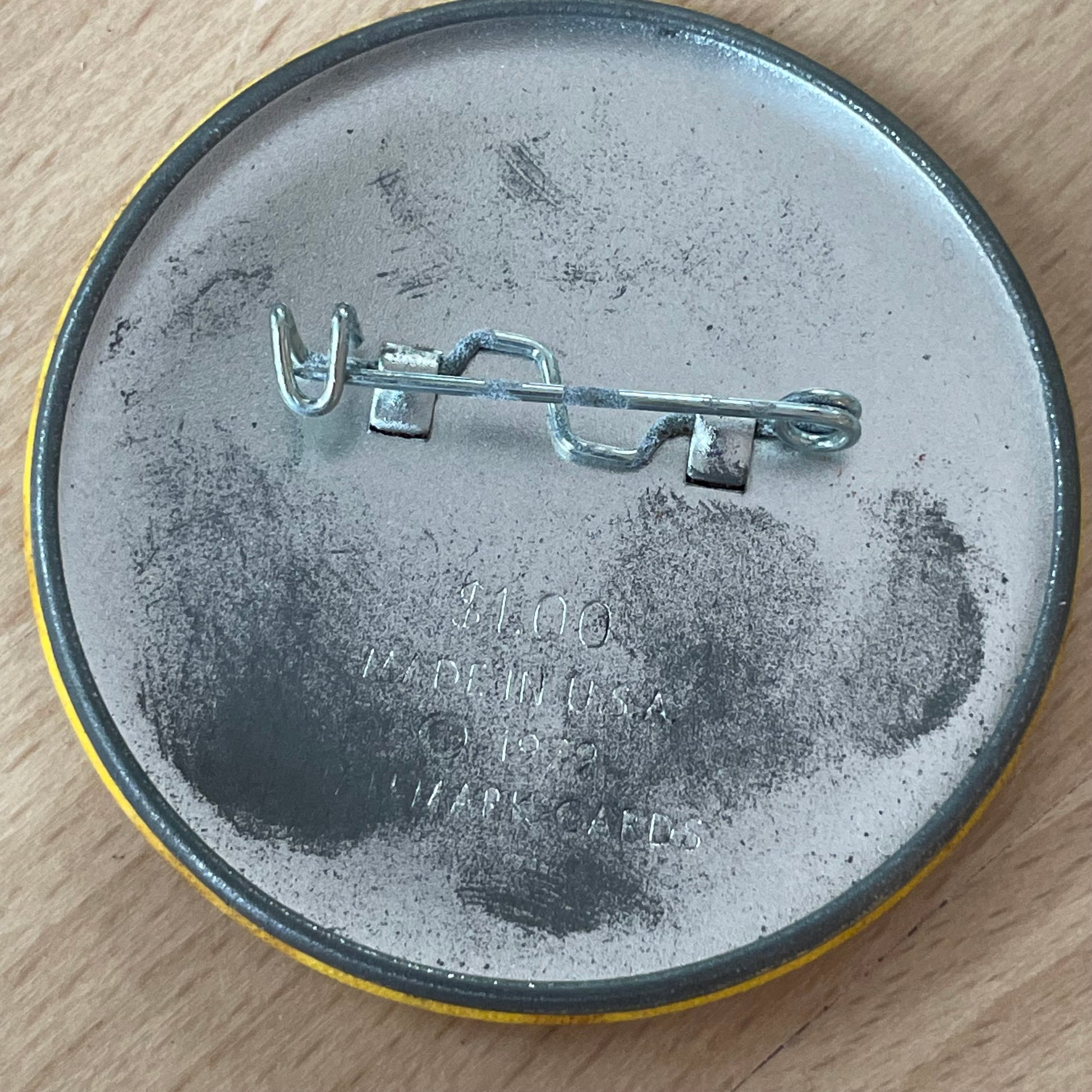 Vintage condition with visible wear, surface spotting, and edge discoloration consistent with age. Pinback remains intact and functional.