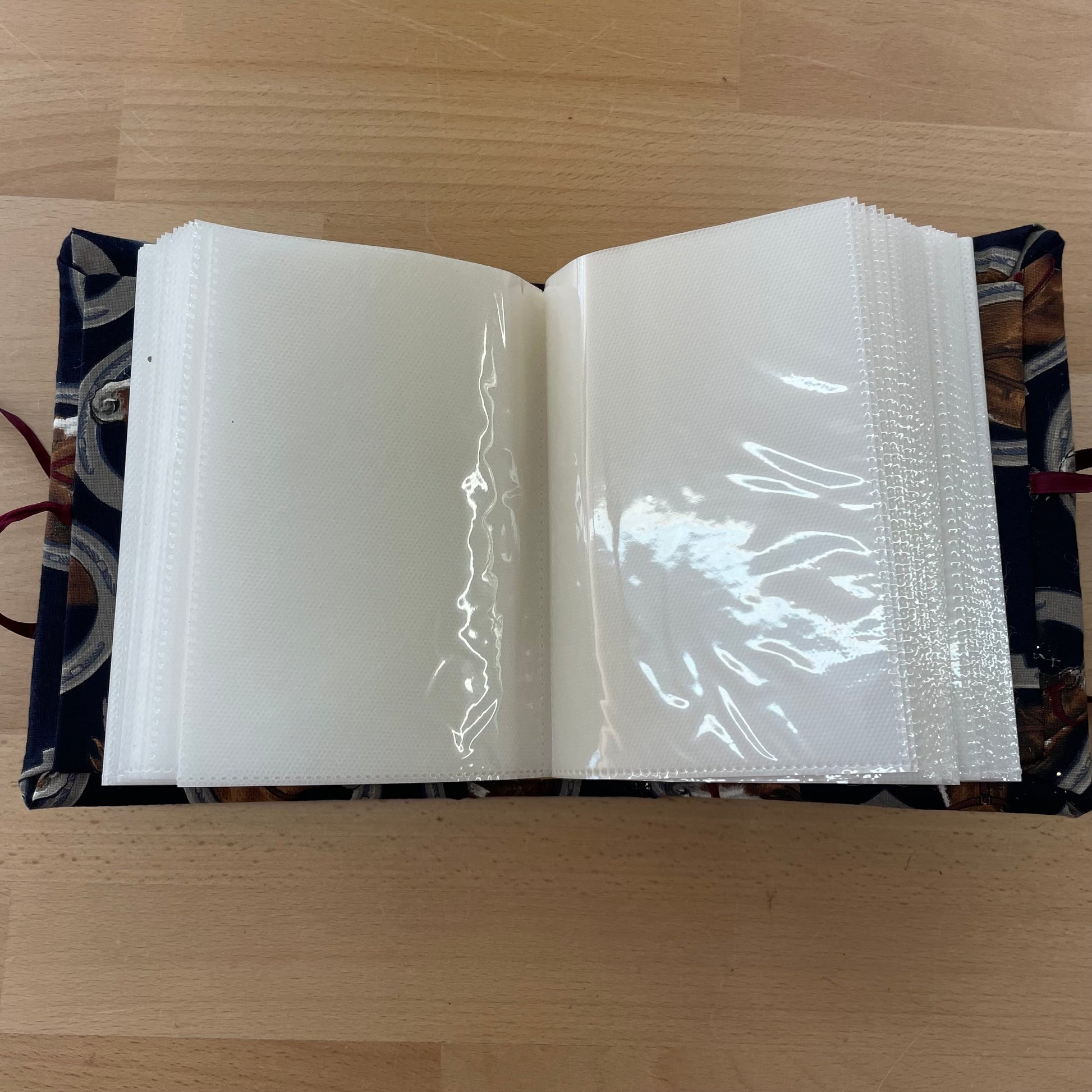 This vintage photo album is covered in a charming cloth fabric featuring horses and horseshoe motifs, perfect for equestrian enthusiasts. The padded cover and ribbon tie closure give it a timeless, handmade feel while keeping your memories secure. Inside are clear plastic sleeves, all completely unused, ready to hold and protect your photographs. A lovely piece for farmhouse décor, rustic collections, or as a thoughtful gift for horse lovers.