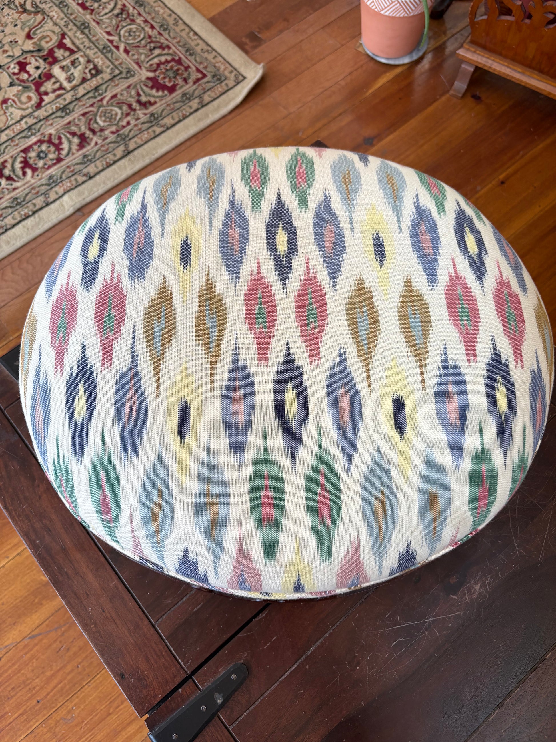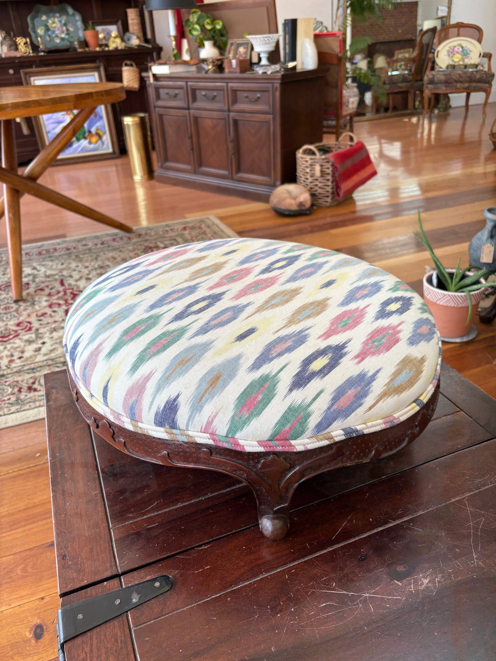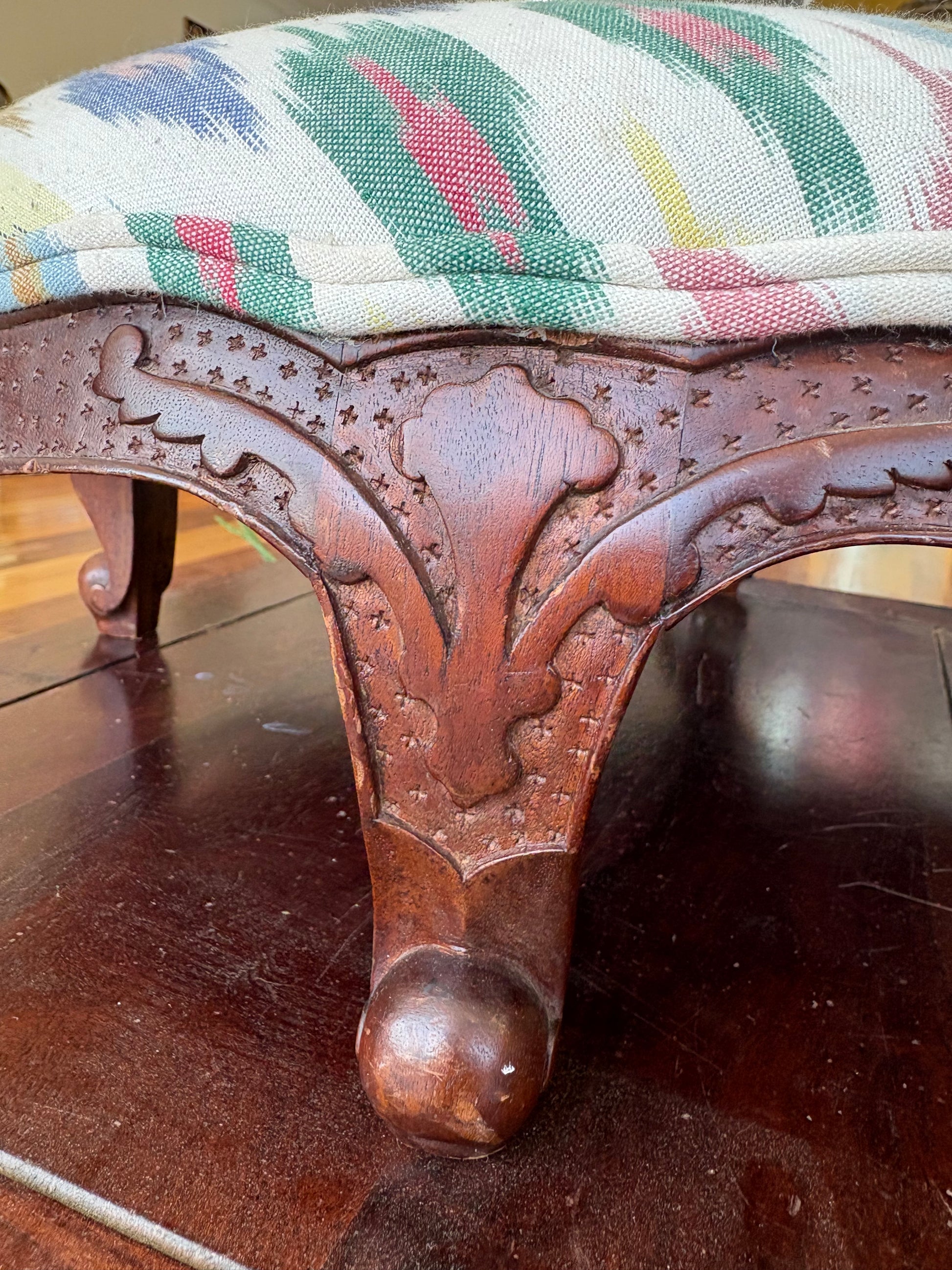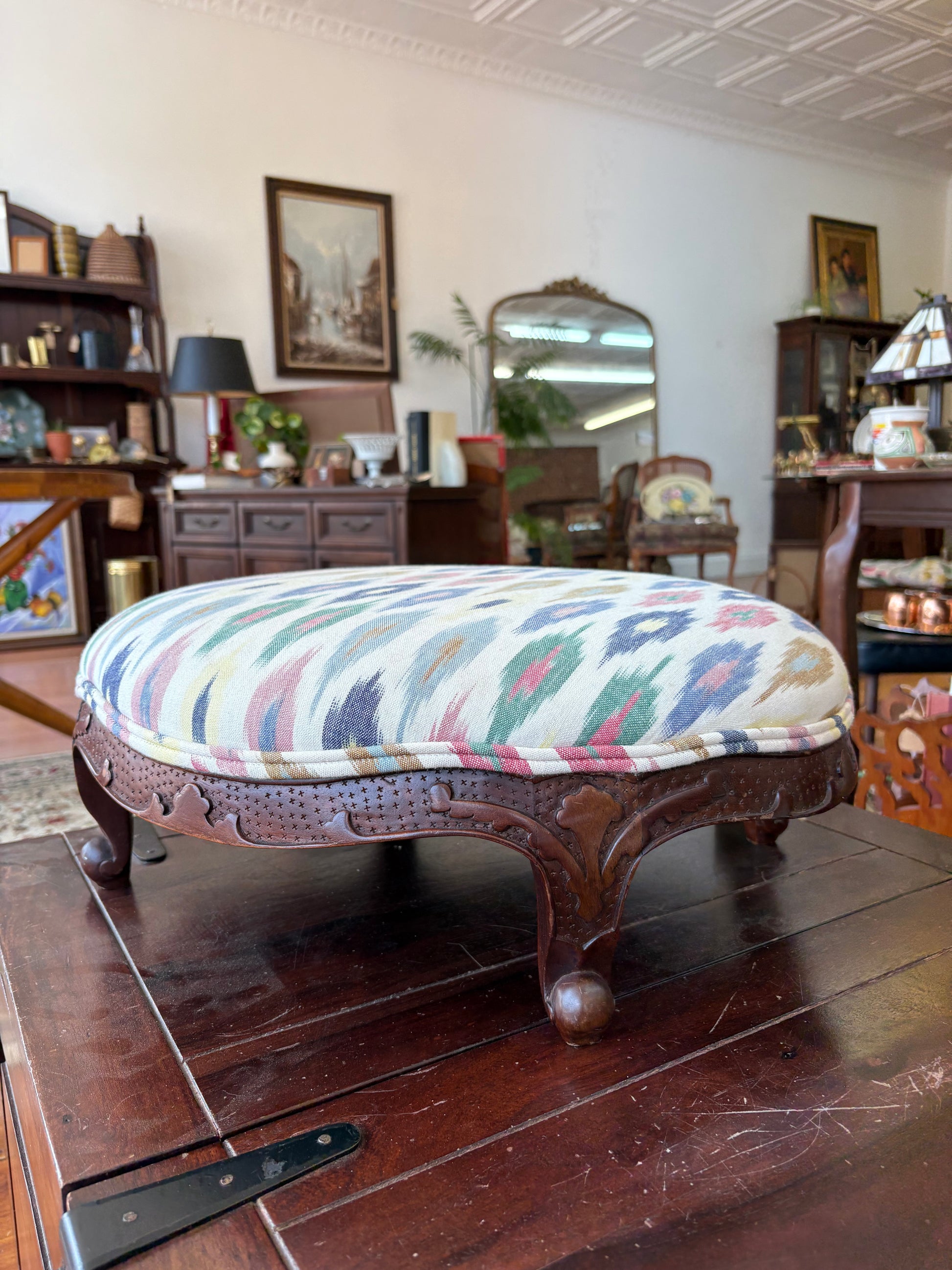 Vintage Carved Footstool – Ikat Upholstery, Cabriole Legs, 22″ × 19″ × 7″