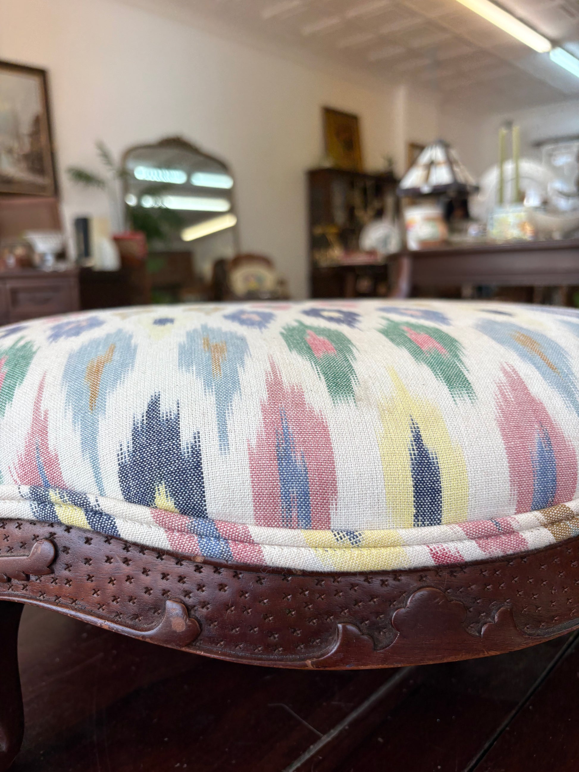 A petite splash of pattern and craftsmanship, this vintage carved footstool marries an ornate, pierced mahogany frame with fresh ikat upholstery in blush, navy, citron, and sage. The serpentine apron is peppered with tiny punchwork stars and stylized shell cartouches that flow into cabriole legs ending in bun feet—details that nod to late-Victorian revival furniture while feeling right at home in today’s eclectic mix.