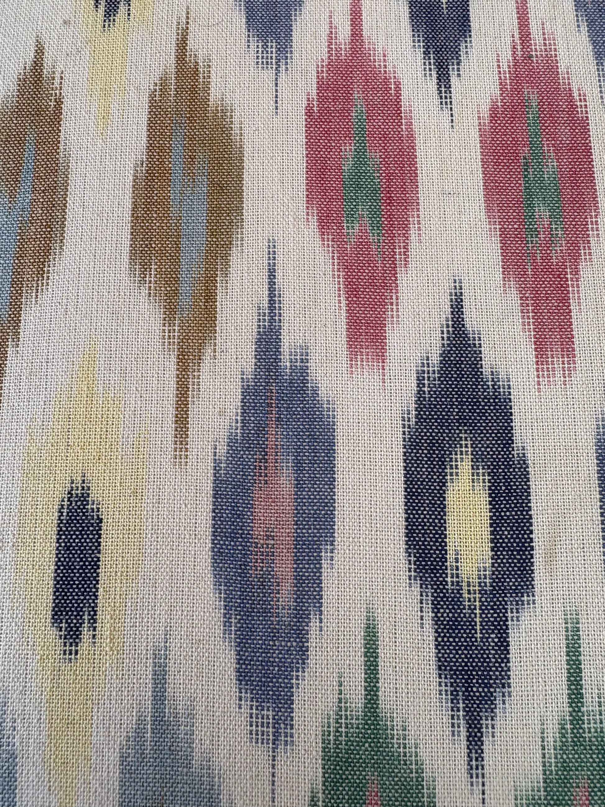 - New cotton-blend ikat fabric over firm foam pad; upholstery tacked tight for long life