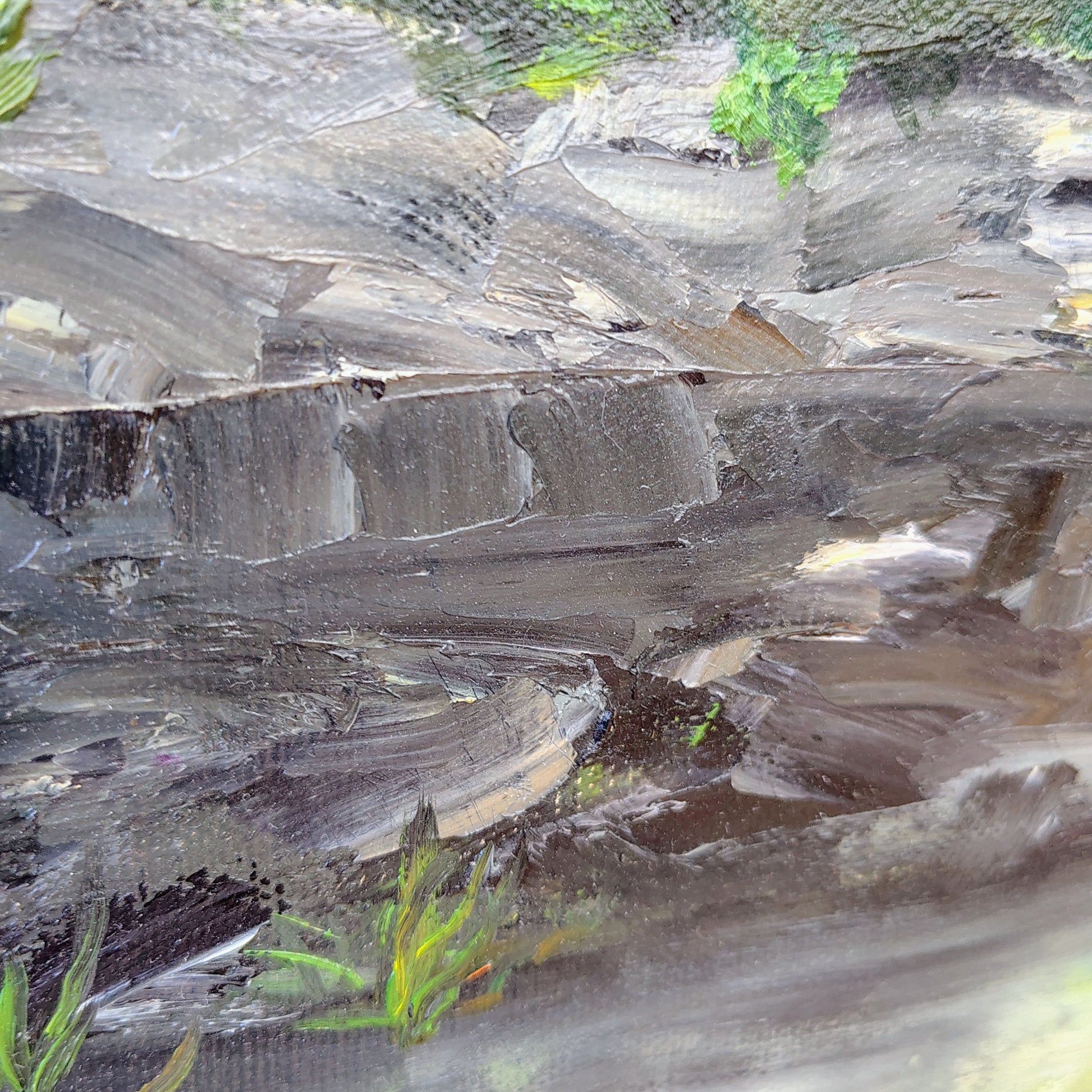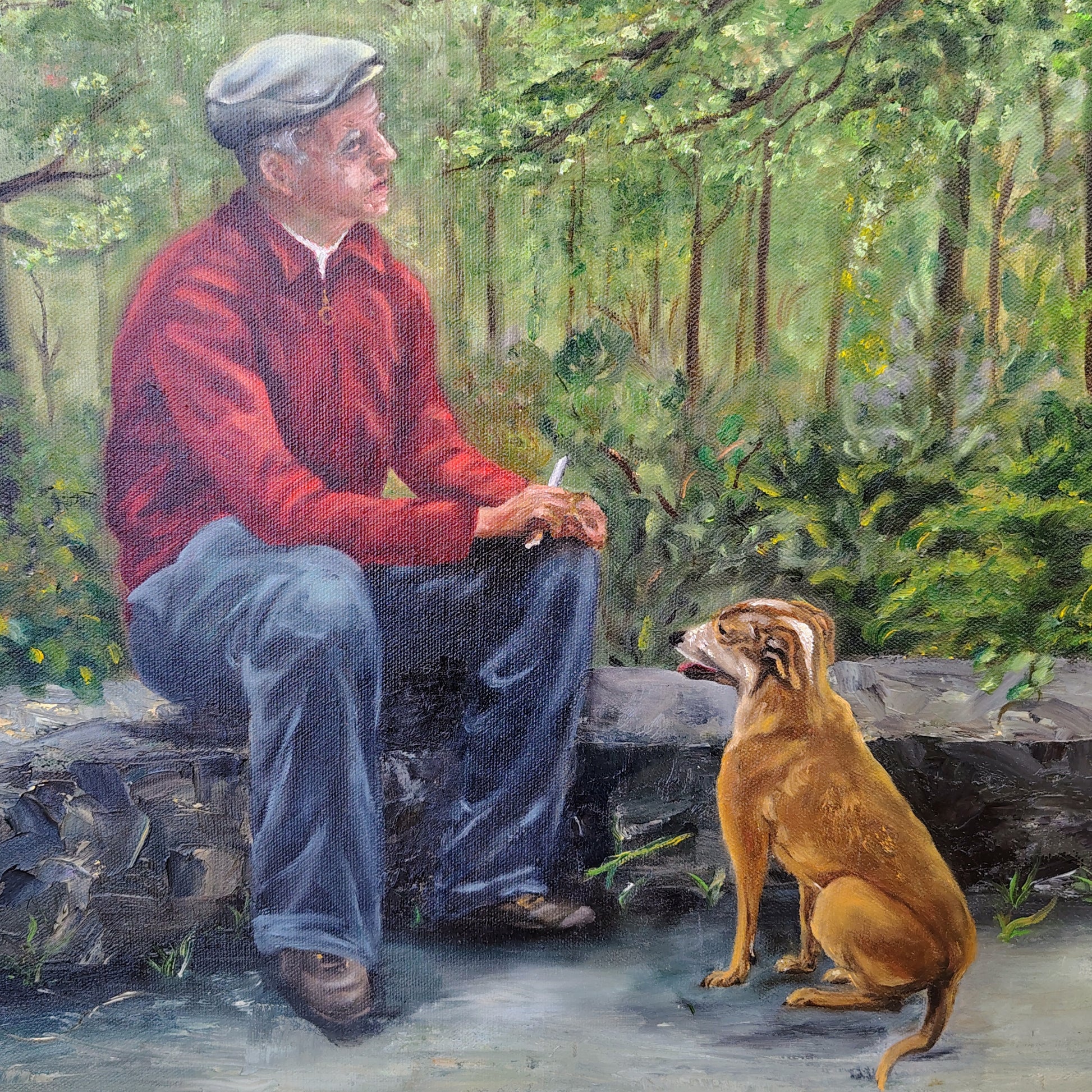 A beautifully observed figurative oil by J. Hudock of Monroe, Connecticut — a man in a flat cap rests on a stone wall in a lush green woodland, his golden dog looking up at him with complete attention. The dappled light through the trees, the confident brushwork on the dog's coat, and the quietly intimate subject matter make this the most compelling of Hudock's works we've seen. Signed lower left.