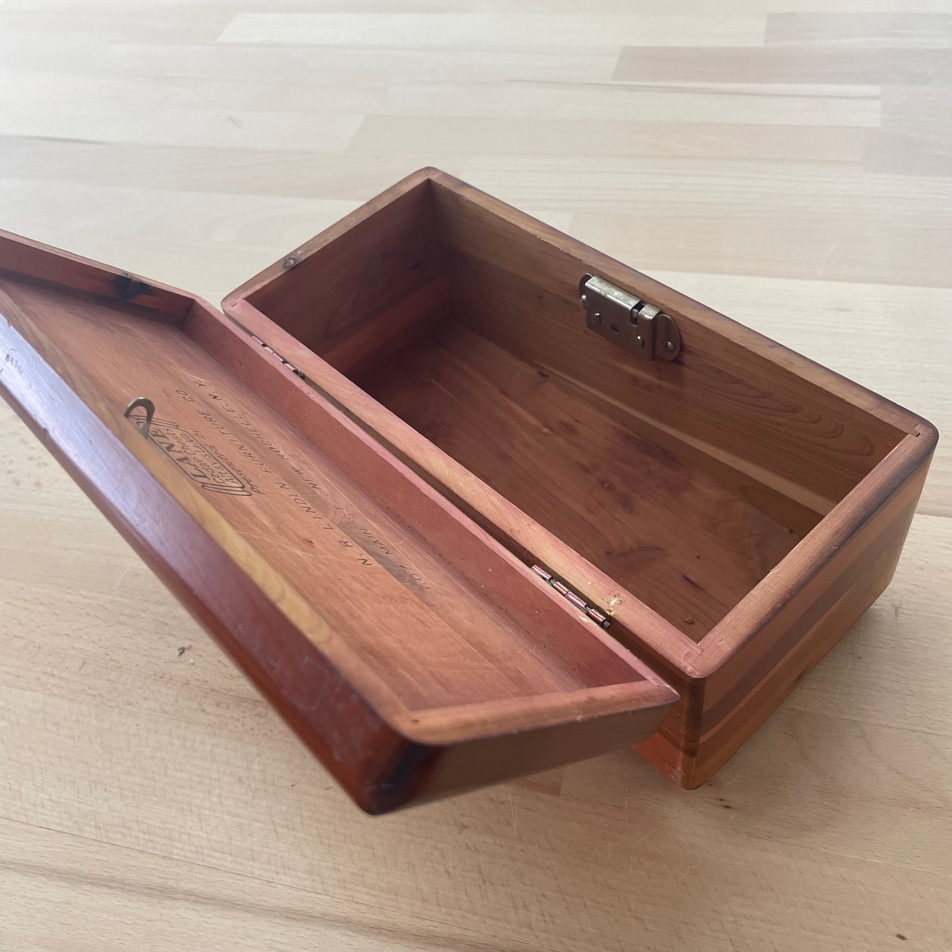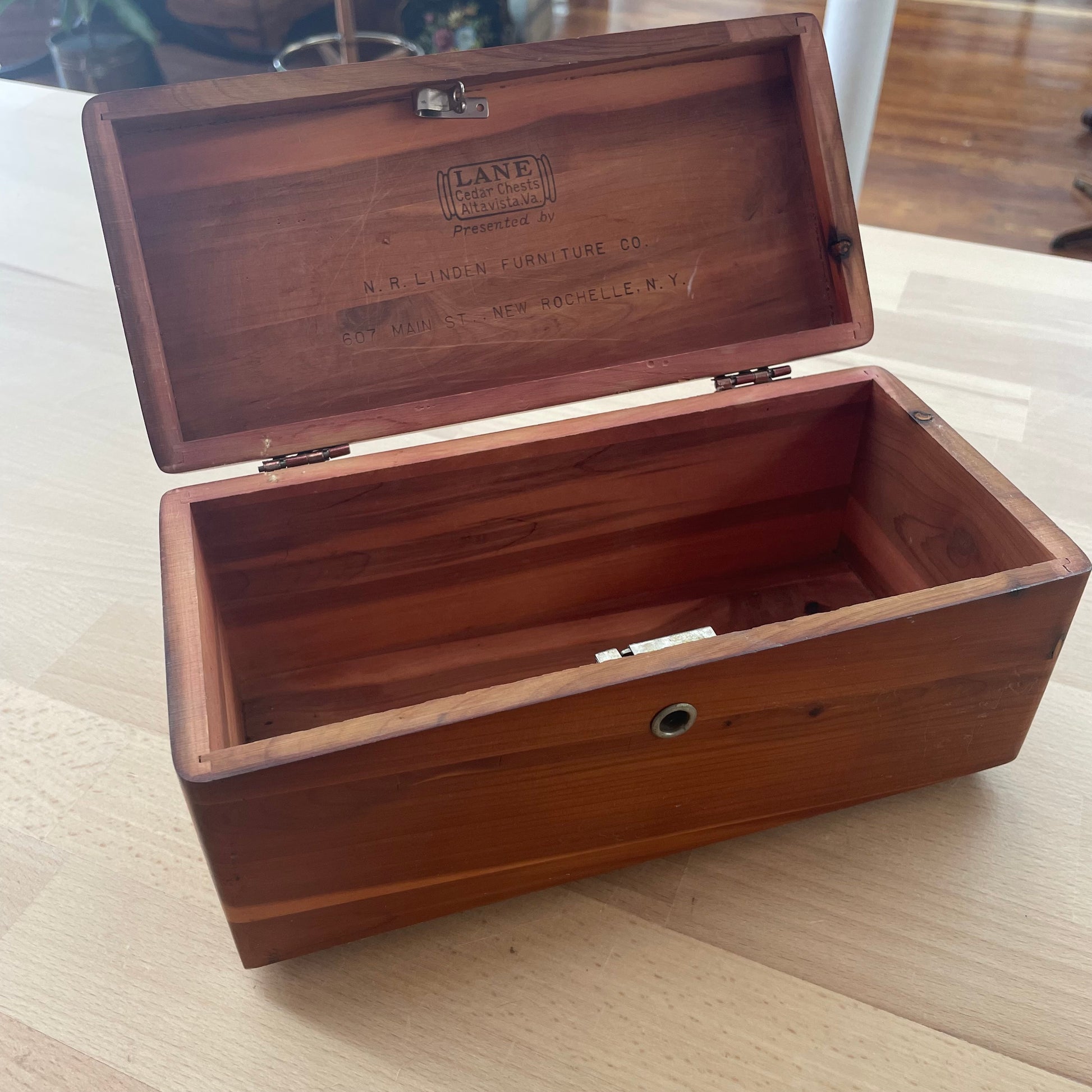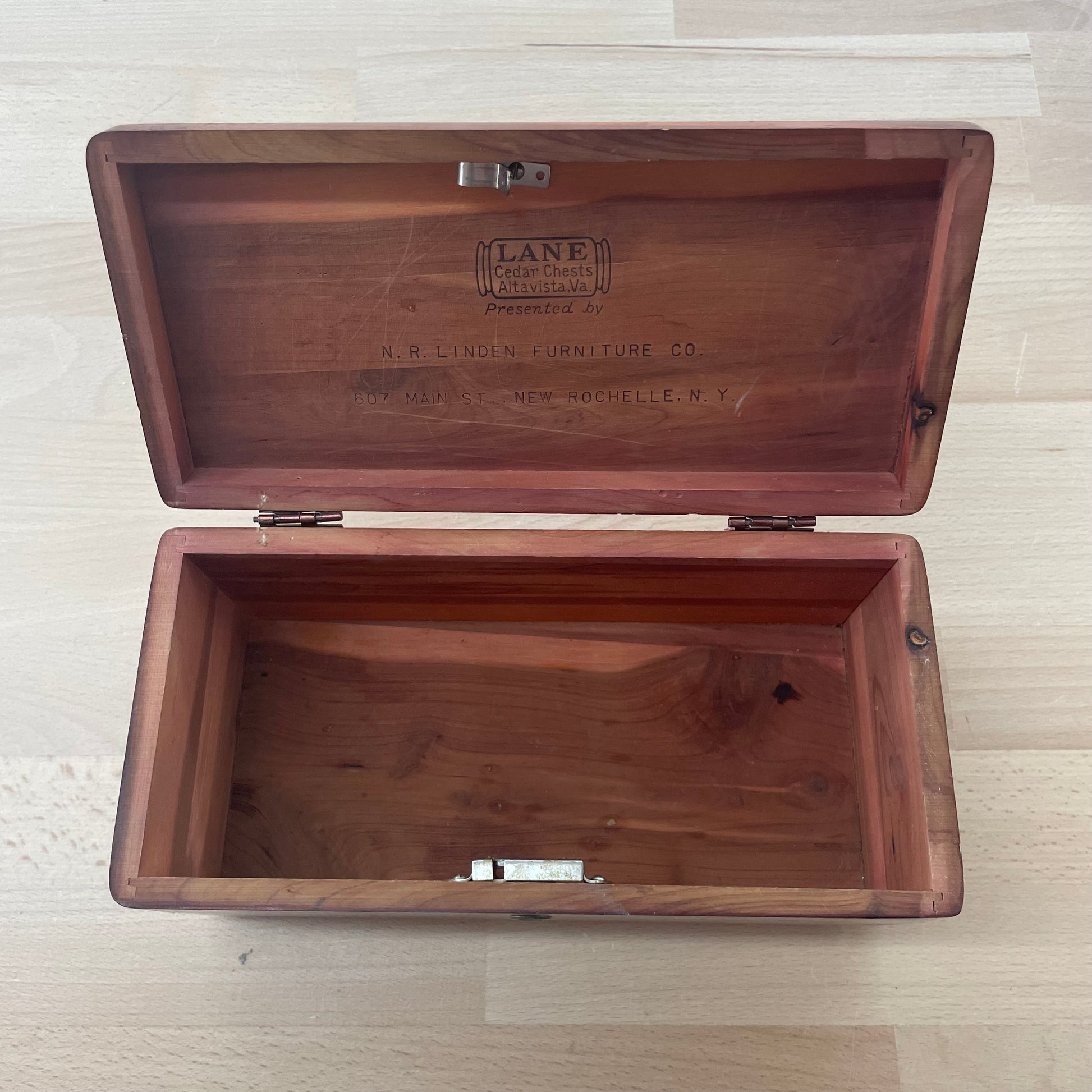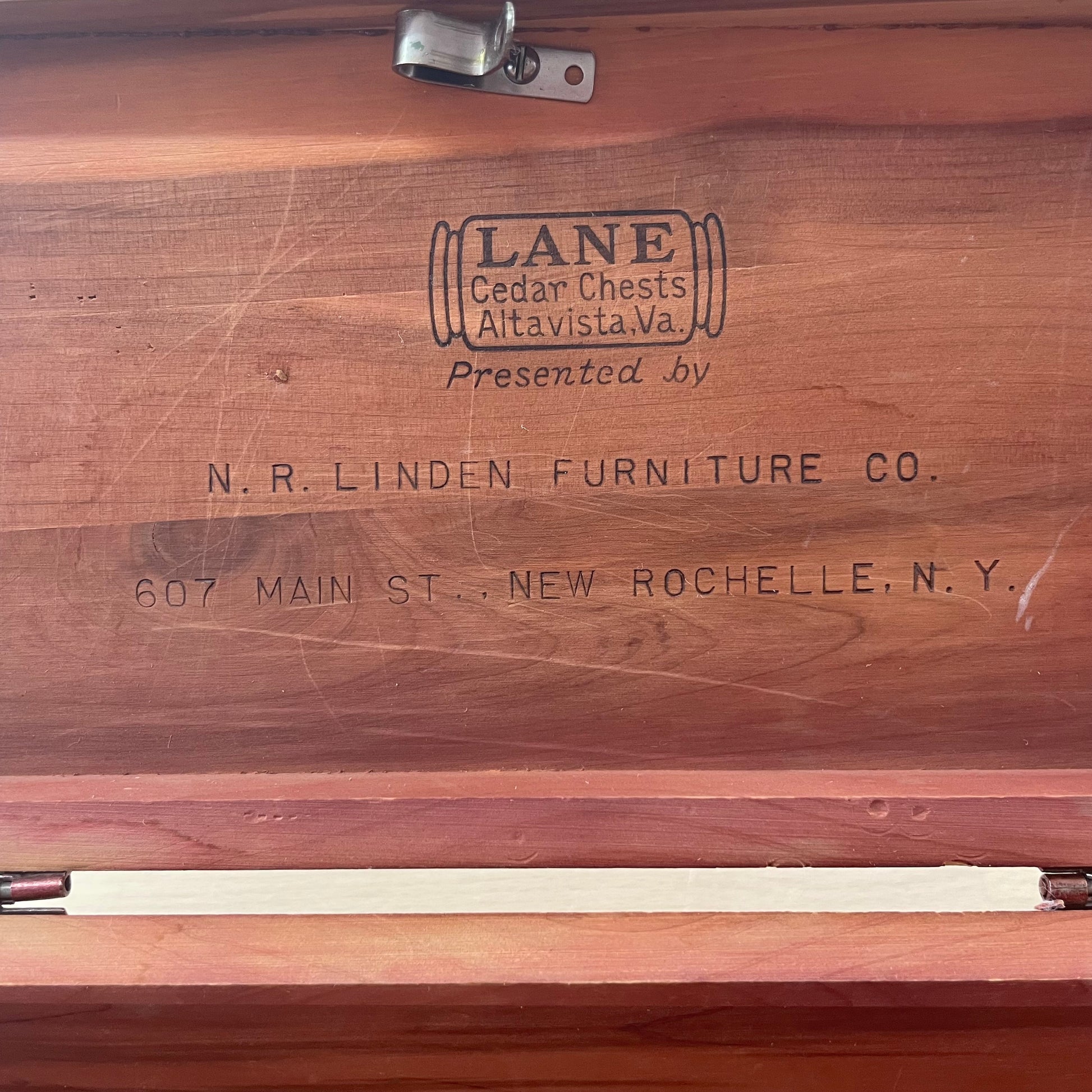 A charming vintage miniature Lane cedar chest, originally presented by N.R. Linden Furniture Co. of New Rochelle, NY. These collectible boxes were often given as gifts or promotional pieces in the mid-20th century. Crafted from aromatic red cedar, this box features a hinged lid, visible dovetail joinery, and the original branded inscription inside the lid. A lovely piece for storing keepsakes, jewelry, or as a nostalgic display item.