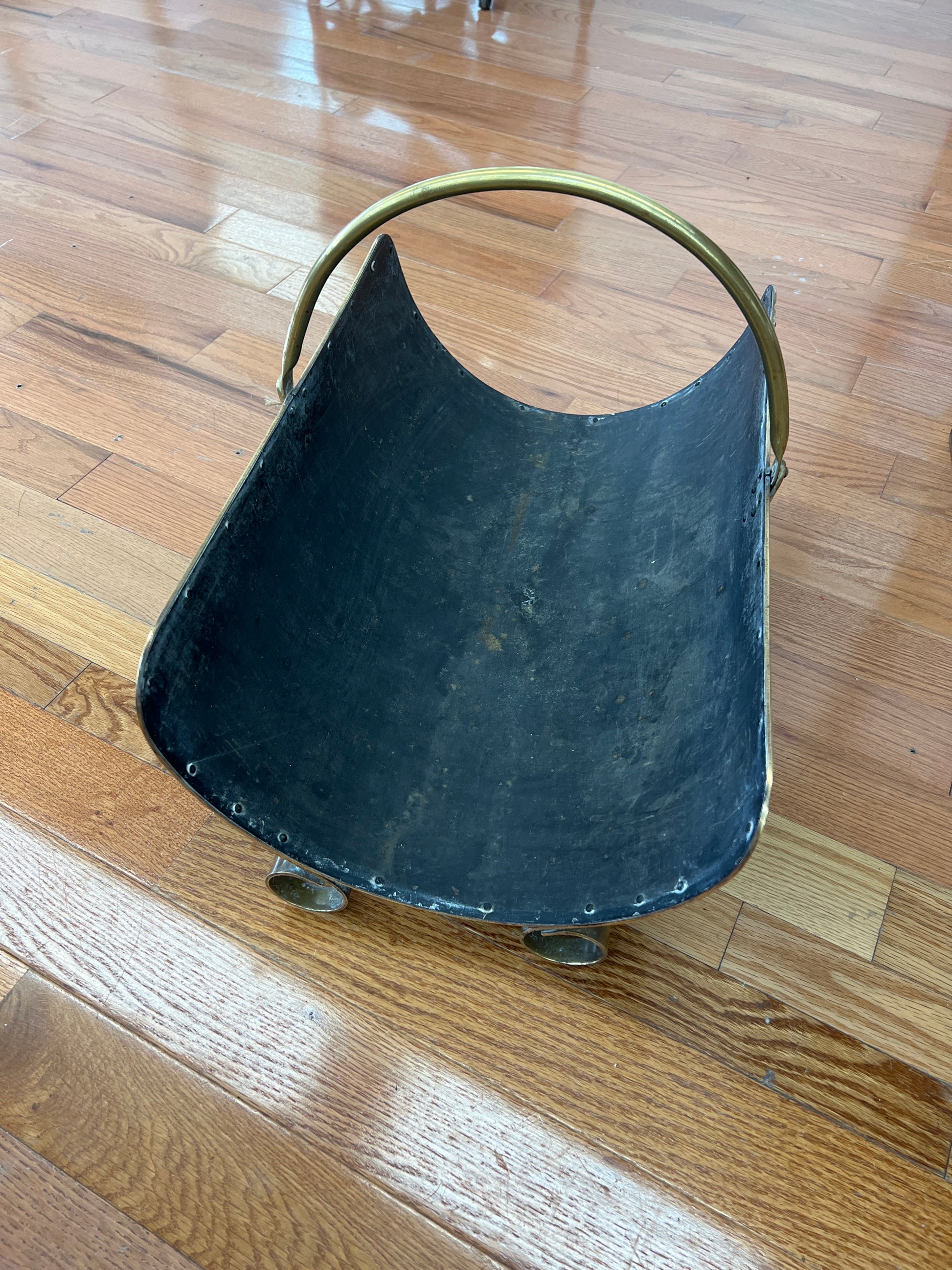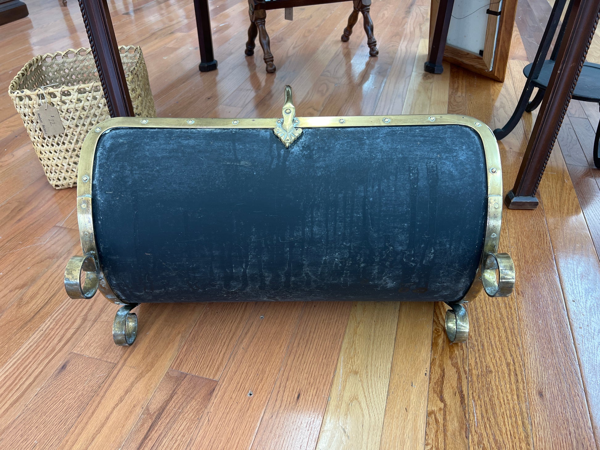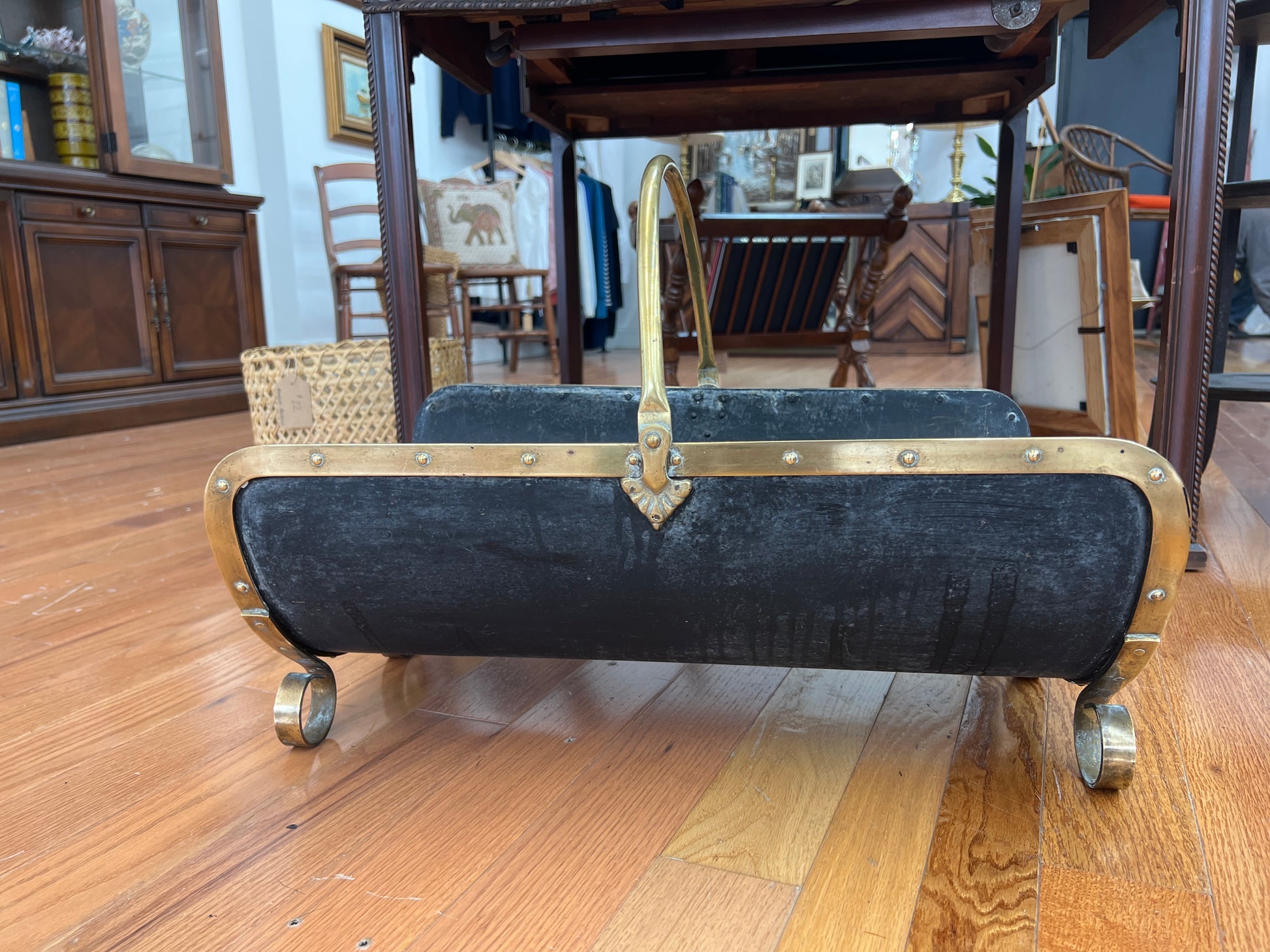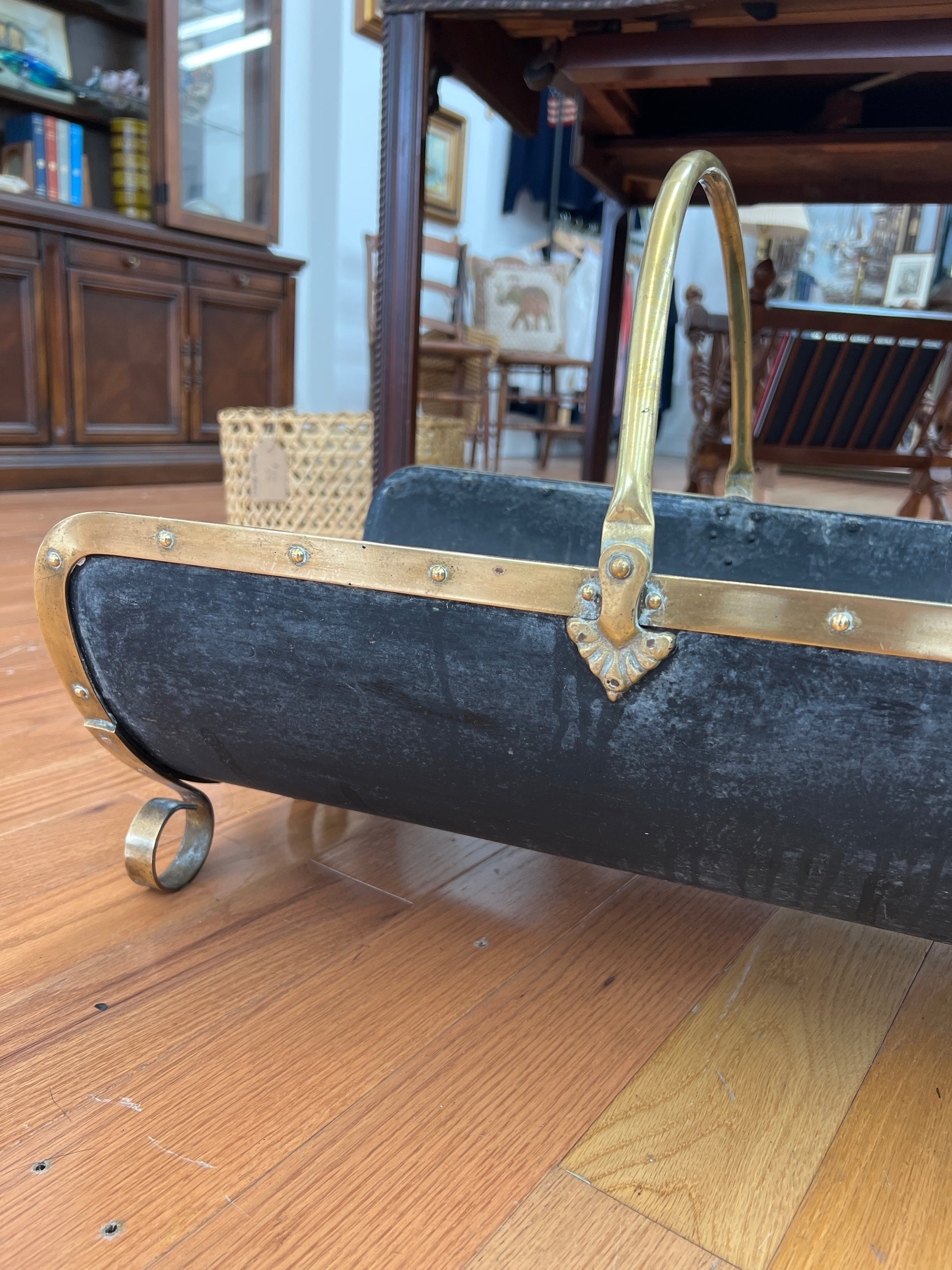 This is an antique fireplace log holder featuring black metal and lovely brass trim, feet and handle.