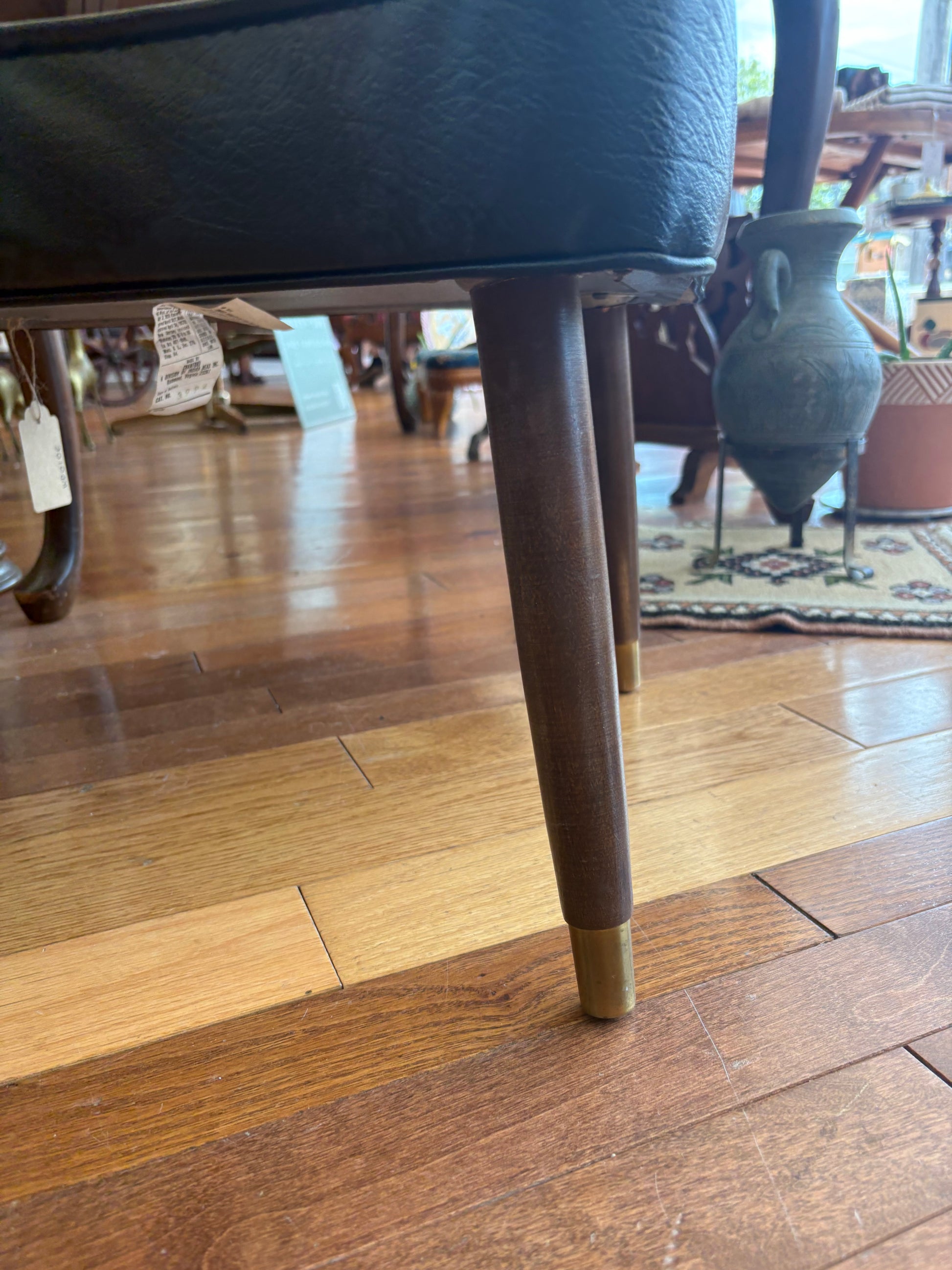 Very good vintage condition. Vinyl is clean with light surface wear. Wood legs are sturdy with minor age-related marks. Brass caps have natural patina.