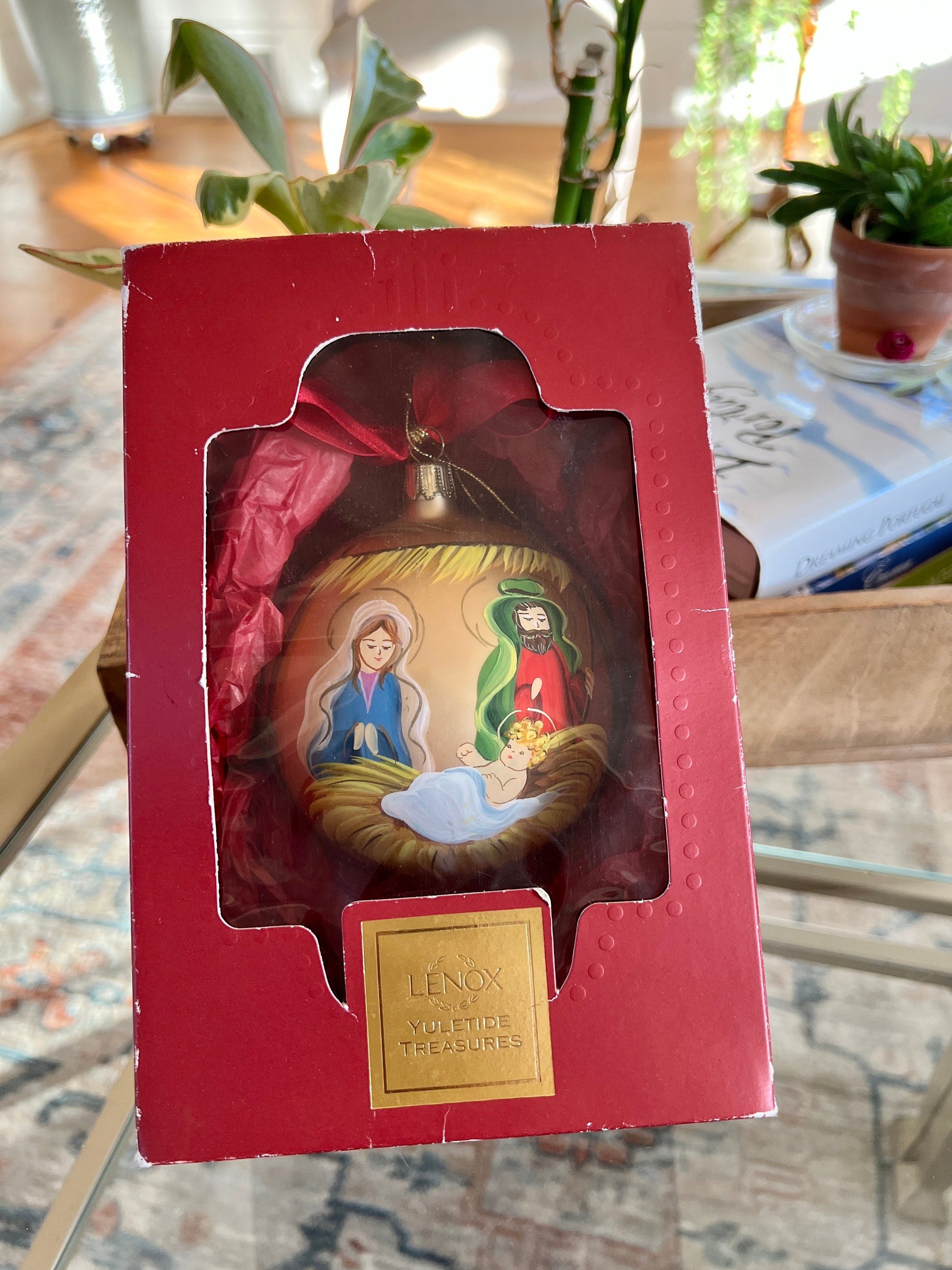 This is an absoute beauty! This is a stunning Christmas tree ornament made by Lenox. It is the Nativity ornament from the Yuletide Treasures Holy Night collection. The piece is glass and hand painted. The glass ball is gold the Holy Family on the front and country, sheep scene on back.