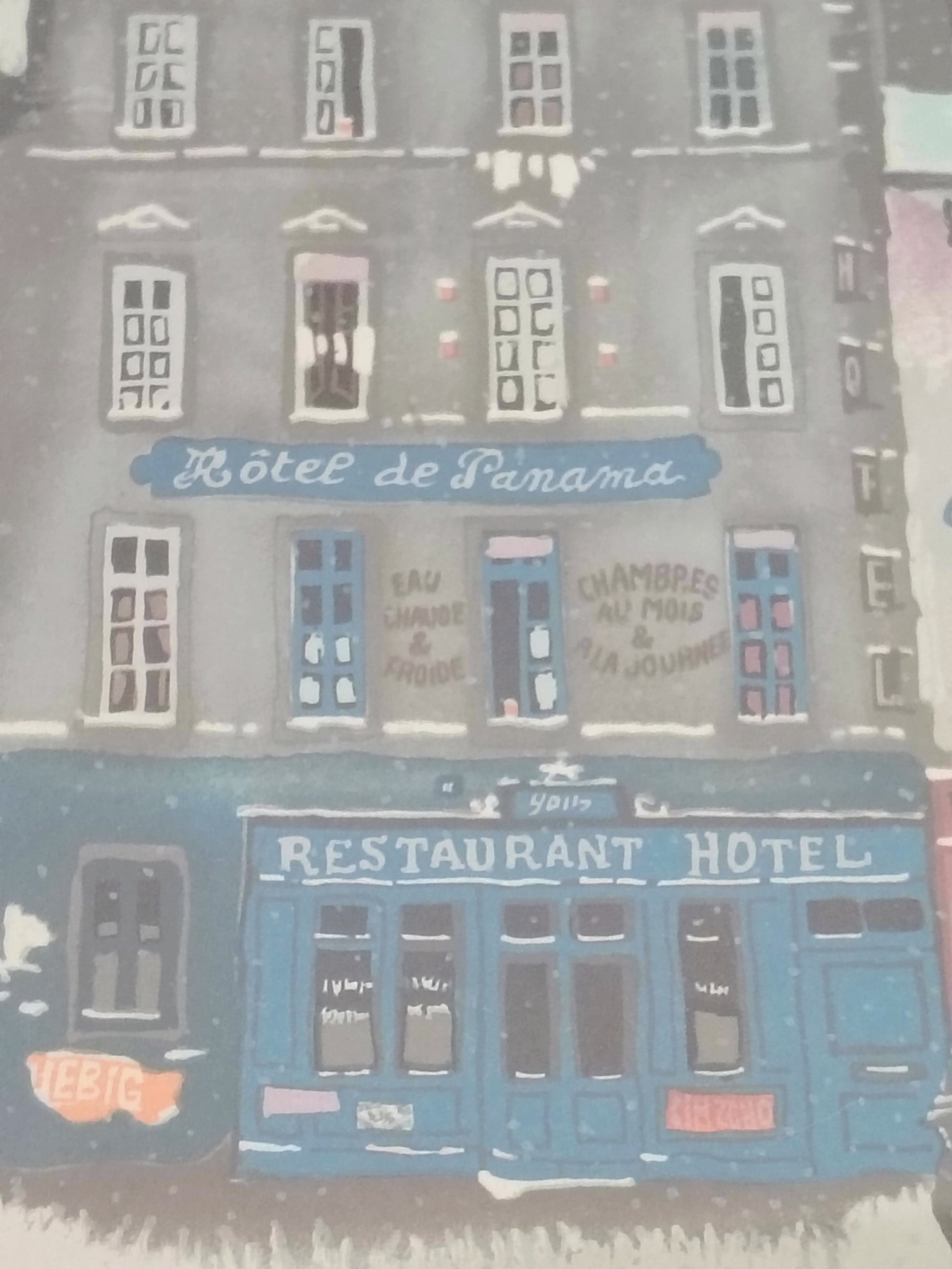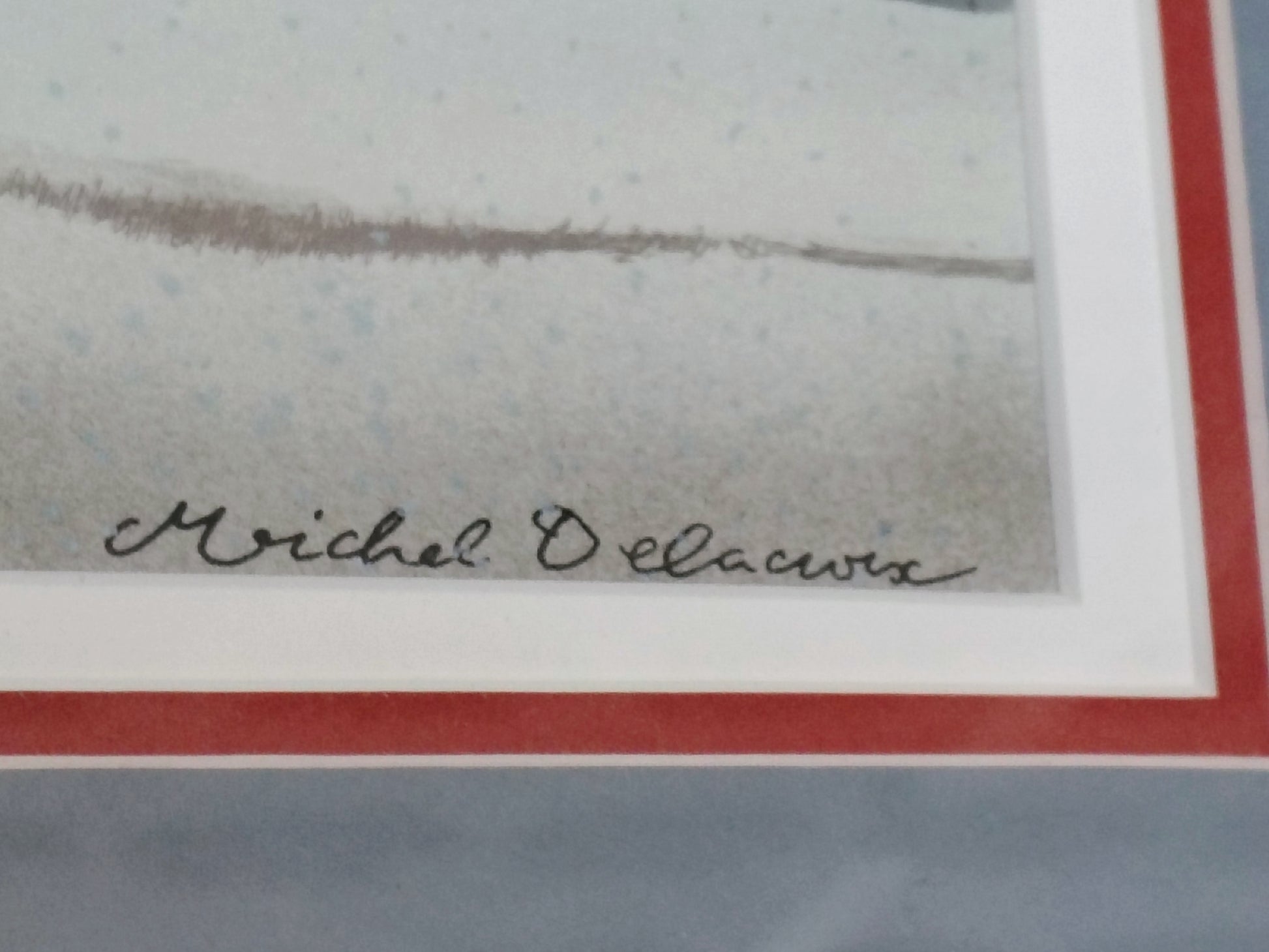 A charming original lithograph by French artist Michel Delacroix, known for his nostalgic and whimsical depictions of Parisian street life. This beautifully detailed winter cityscape captures a snow-covered Paris street, complete with colorful façades, softly drifting snow, and bundled-up passersby. The print is framed in a vintage gold wood frame with blue and red matting, perfectly complementing the scene’s pastel tones and warm atmosphere.