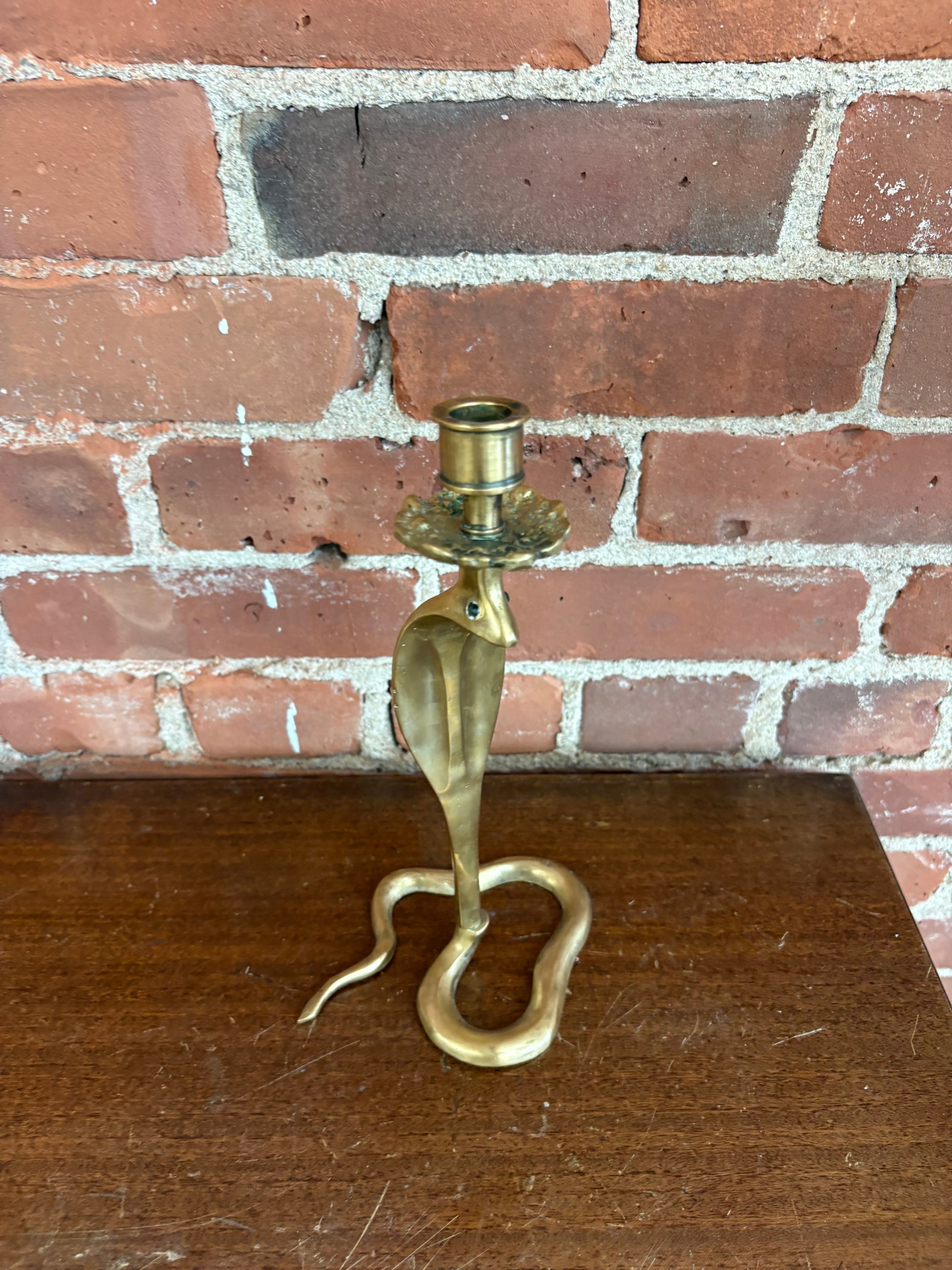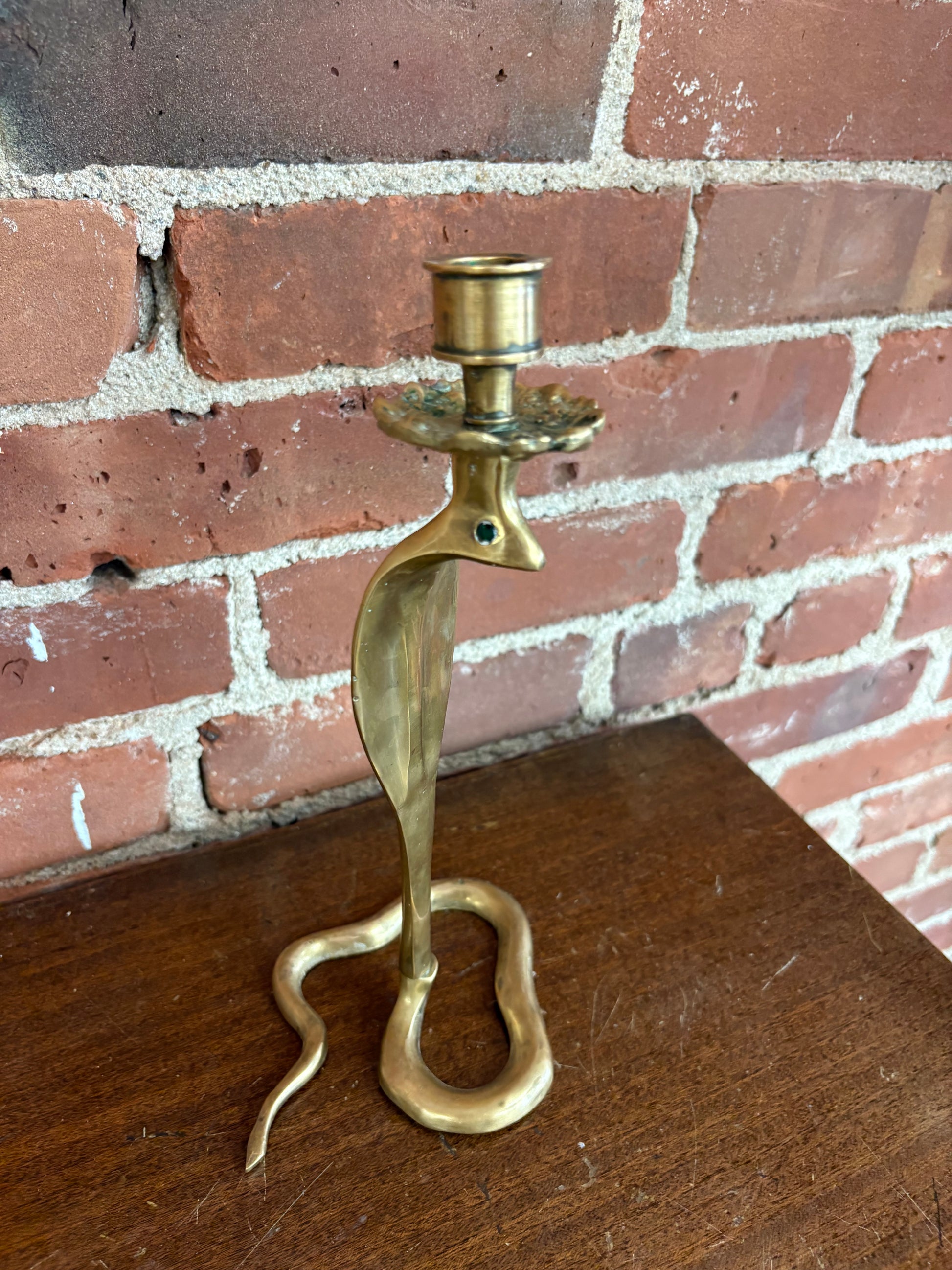 Moroccan Brass Cobra Candlestick with Emerald Glass Eyes — Handcrafted, c. 1970s–80s, 10"